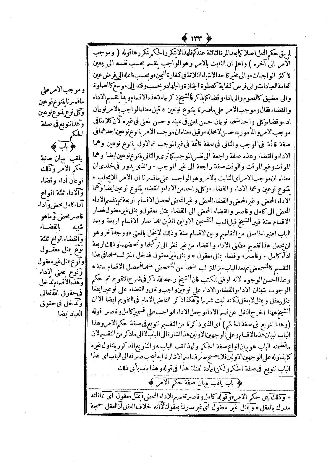 (بَابٌ) يُلَقَّبُ بِبَيَانِ صِفَةِ حُكْمِ الْأَمْرِ وَذَلِكَ نَوْعَانِ: أَدَاءٌ وَقَضَاءٌ وَالْأَدَاءُ: ثَلَاثَةُ أَنْوَاعٍ: أَدَاءٌ كَامِلٌ مَحْضٌ وَأَدَاءٌ قَاصِرٌ مَحْضٌ وَمَا هُوَ شَبِيهٌ بِالْقَضَاءِ وَالْقَضَاءُ أَنْوَاعٌ ثَلَاثَةٌ: نَوْعٌ بِمِثْلٍ مَعْقُولٍ وَنَوْعٌ بِمِثْلٍ غَيْرِ مَعْقُولٍ وَنَوْعٌ بِمَعْنَى الْأَدَاءِ، وَهَذِهِ الْأَقْسَامُ تَدْخُلُ فِي حُقُوقِ اللَّهِ تَعَالَى وَتَدْخُلُ فِي حُقُوقِ الْعِبَادِ أَيْضًا