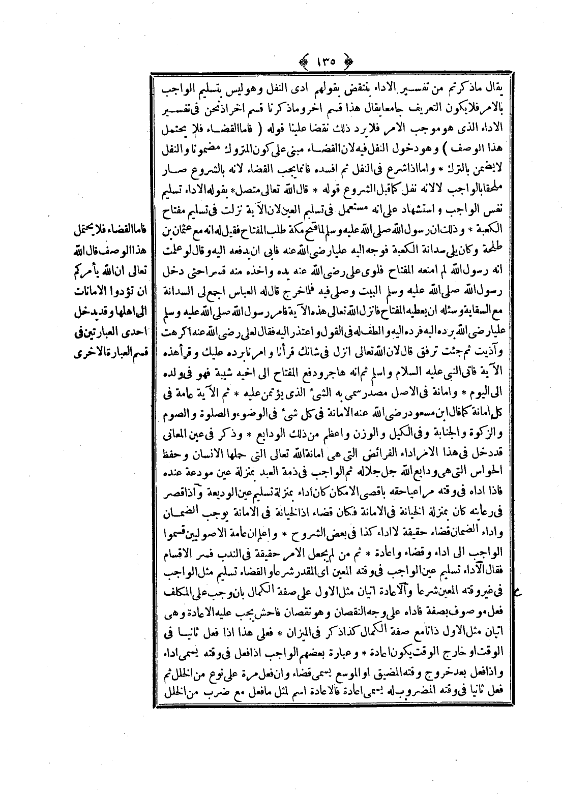 وَأَمَّا إذَا شَرَعَ فِي النَّفْلِ ثُمَّ أَفْسَدَهُ فَإِنَّمَا يَجِبُ الْقَضَاءُ؛ لِأَنَّهُ بِالشُّرُوعِ صَارَ مُلْحَقًا بِالْوَاجِبِ لَا؛ لِأَنَّهُ نَفْلٌ كَمَا قَبْلَ الشُّرُوعِ قَوْلُهُ، قَالَ اللَّهُ تَعَالَى مُتَّصِلٌ، بِقَوْلِهِ الْأَدَاءُ تَسْلِيمُ نَفْسِ الْوَاجِبِ وَاسْتِشْهَادٌ عَلَى أَنَّهُ مُسْتَعْمَلٌ فِي تَسْلِيمِ الْعَيْنِ؛ لِأَنَّ الْآيَةَ نَزَلَتْ فِي تَسْلِيمِ مِفْتَاحِ الْكَعْبَةِ، وَذَلِكَ «أَنَّ رَسُولَ اللَّهِ - صَلَّى اللَّهُ عَلَيْهِ وَسَلَّمَ - لَمَّا فَتَحَ مَكَّةَ طَلَبَ الْمِفْتَاحَ فَقِيلَ لَهُ إنَّهُ مَعَ عُثْمَانَ بْنِ طَلْحَةَ وَكَانَ يَلِي سِدَانَةَ الْكَعْبَةِ فَوَجَّهَ إلَيْهِ عَلِيًّا - رَضِيَ اللَّهُ عَنْهُ - فَأَبَى أَنْ يَدْفَعَهُ إلَيْهِ وَقَالَ لَوْ عَلِمْت أَنَّهُ رَسُولُ اللَّهِ لَمْ أَمْنَعْهُ الْمِفْتَاحَ فَلَوَى عَلِيٌّ - رَضِيَ اللَّهُ عَنْهُ - يَدَهُ وَأَخَذَهُ مِنْهُ قَسْرًا حَتَّى دَخَلَ رَسُولُ اللَّهِ - صَلَّى اللَّهُ عَلَيْهِ وَسَلَّمَ - الْبَيْتَ وَصَلَّى فِيهِ فَلَمَّا خَرَجَ قَالَ لَهُ الْعَبَّاسُ اجْمَعْ لِي السِّدَانَةَ مَعَ السِّقَايَةِ وَسَأَلَهُ أَنْ يُعْطِيَهُ الْمِفْتَاحَ فَأَنْزَلَ اللَّهُ تَعَالَى هَذِهِ الْآيَةَ فَأَمَرَ رَسُولُ اللَّهِ - صَلَّى اللَّهُ عَلَيْهِ وَسَلَّمَ - عَلِيًّا - رَضِيَ اللَّهُ عَنْهُ - بِرَدِّهِ إلَيْهِ فَرَدَّهُ إلَيْهِ وَأَلْطَفَ لَهُ فِي الْقَوْلِ وَاعْتَذَرَ إلَيْهِ فَقَالَ لِعَلِيٍّ - رَضِيَ اللَّهُ عَنْهُ - أَكْرَهْت وَآذَيْت ثُمَّ جِئْت تَرْفُقُ قَالَ؛ لِأَنَّ اللَّهَ تَعَالَى أَنْزَلَ فِي شَأْنِك قُرْآنًا وَأَمَرَنَا بِرَدِّهِ عَلَيْك، وَقَرَأَ هَذِهِ الْآيَةَ فَأَتَى النَّبِيَّ - عَلَيْهِ السَّلَامُ - وَأَسْلَمَ ثُمَّ إنَّهُ هَاجَرَ وَدَفَعَ الْمِفْتَاحَ إلَى أَخِيهِ شَيْبَةَ فَهُوَ فِي وَلَدِهِ إلَى الْيَوْمِ» ، وَأَمَانَةٌ فِي الْأَصْلِ مَصْدَرٌ سُمِّيَ بِهِ الشَّيْءُ الَّذِي يُؤْتَمَنُ عَلَيْهِ، ثُمَّ الْآيَةُ عَامَّةٌ فِي كُلِّ أَمَانَةٍ كَمَا قَالَ ابْنُ مَسْعُودٍ - رَضِيَ اللَّهُ عَنْهُ - الْأَمَانَةُ فِي كُلِّ شَيْءٍ فِي الْوُضُوءِ وَالصَّلَاةِ وَالصَّوْمِ وَالزَّكَاةِ وَالْجَنَابَةِ وَفِي الْكَيْلِ وَالْوَزْنِ وَأَعْظَمُ مِنْ ذَلِكَ الْوَدَائِعُ.