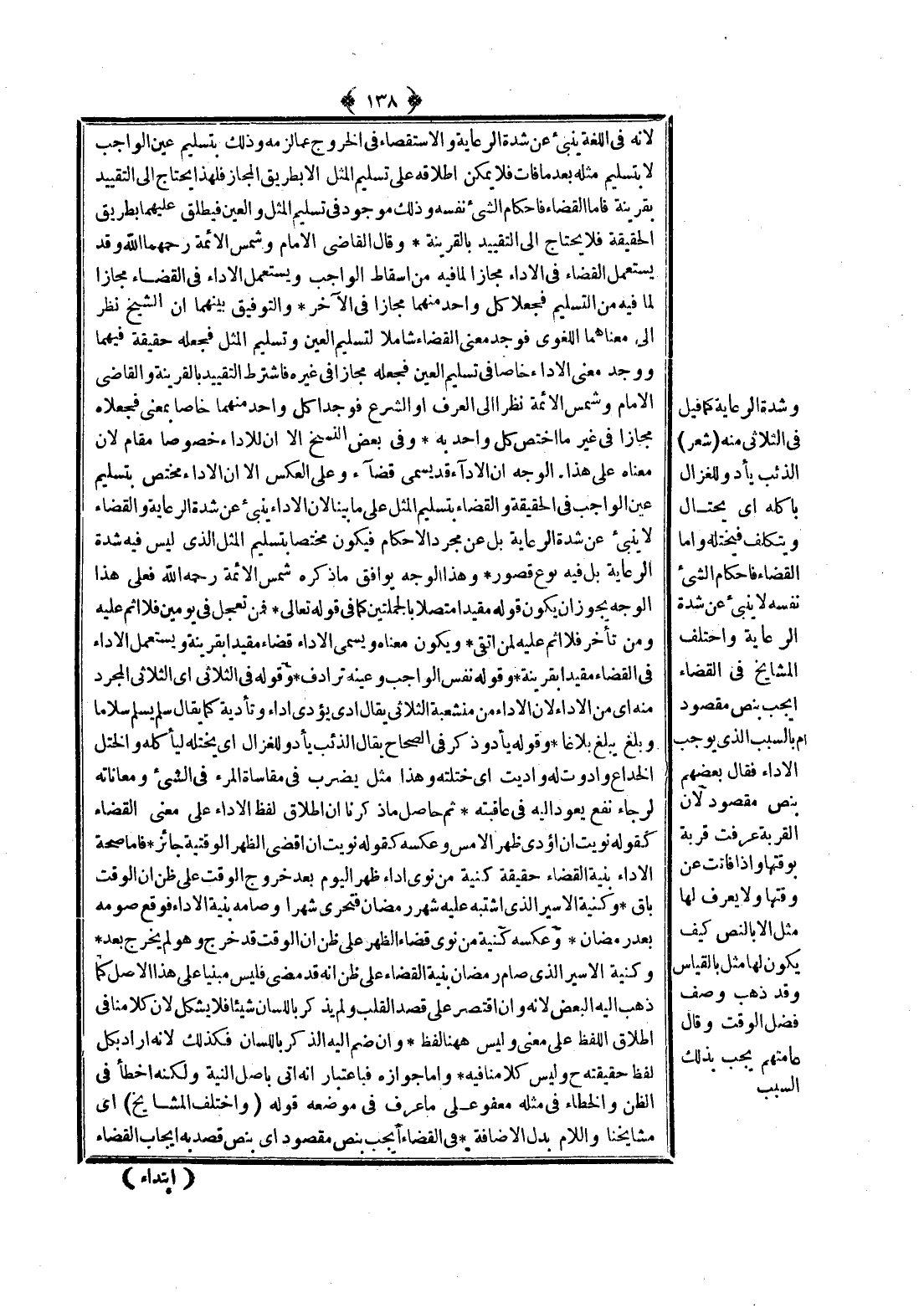 وَقَالَ الْقَاضِي الْإِمَامُ وَشَمْسُ الْأَئِمَّةِ رَحِمَهُمَا اللَّهُ وَقَدْ يُسْتَعْمَلُ الْقَضَاءُ فِي الْأَدَاءِ مَجَازًا لِمَا فِيهِ مِنْ إسْقَاطِ الْوَاجِبِ وَيُسْتَعْمَلُ الْأَدَاءُ فِي الْقَضَاءِ مَجَازًا لِمَا فِيهِ مِنْ التَّسْلِيمِ فَجُعِلَا كُلُّ وَاحِدٍ مِنْهُمَا مَجَازًا فِي الْآخَرِ، وَالتَّوْفِيقُ بَيْنَهُمَا أَنَّ الشَّيْخَ نَظَرَ إلَى مَعْنَاهُمَا اللُّغَوِيِّ فَوَجَدَ مَعْنَى الْقَضَاءِ شَامِلًا لِتَسْلِيمِ الْعَيْنِ وَتَسْلِيمِ الْمِثْلِ فَجَعَلَهُ حَقِيقَةً فِيهِمَا وَوَجَدَ مَعْنَى الْأَدَاءِ خَاصًّا فِي تَسْلِيمِ الْعَيْنِ فَجَعَلَهُ مَجَازًا فِي غَيْرِهِ فَاشْتَرَطَ التَّقْيِيدَ بِالْقَرِينَةِ وَالْقَاضِي الْإِمَامُ وَشَمْسُ الْأَئِمَّةِ نَظَرَا إلَى الْعُرْفِ أَوْ الشَّرْعِ فَوَجَدَا كُلَّ وَاحِدٍ مِنْهُمَا خَاصًّا بِمَعْنًى فَجَعَلَاهُ مَجَازًا فِي غَيْرِ مَا اخْتَصَّ كُلُّ وَاحِدٍ بِهِ، وَفِي بَعْضِ النُّسَخِ إلَّا أَنَّ لِلْأَدَاءِ خُصُوصًا مُقَامٌ؛ لِأَنَّ مَعْنَاهُ عَلَى هَذَا الْوَجْهِ أَنَّ الْأَدَاءَ قَدْ يُسَمَّى قَضَاءً وَعَلَى الْعَكْسِ إلَّا أَنَّ الْأَدَاءَ مُخْتَصٌّ بِتَسْلِيمِ عَيْنِ الْوَاجِبِ فِي الْحَقِيقَةِ وَالْقَضَاءِ بِتَسْلِيمِ الْمِثْلِ عَلَى مَا بَيَّنَّا؛ لِأَنَّ الْأَدَاءَ يُنْبِئُ عَنْ شِدَّةِ الرِّعَايَةِ وَالْقَضَاءُ لَا يُنْبِئُ عَنْ شِدَّةِ الرِّعَايَةِ بَلْ عَنْ مُجَرَّدِ الْإِحْكَامِ فَيَكُونُ مُخْتَصًّا بِتَسْلِيمِ الْمِثْلِ الَّذِي لَيْسَ فِيهِ شِدَّةُ الرِّعَايَةِ بَلْ فِيهِ نَوْعُ قُصُورٍ، وَهَذَا الْوَجْهُ يُوَافِقُ مَا ذَكَرَهُ شَمْسُ الْأَئِمَّةِ - رَحِمَهُ اللَّهُ - فَعَلَى هَذَا الْوَجْهِ يَجُوزُ أَنْ يَكُونَ قَوْلُهُ مُقَيَّدًا مُتَّصِلًا بِالْجُمْلَتَيْنِ كَمَا فِي قَوْله تَعَالَى {فَمَنْ تَعَجَّلَ فِي يَوْمَيْنِ فَلا إِثْمَ عَلَيْهِ وَمَنْ تَأَخَّرَ فَلا إِثْمَ عَلَيْهِ لِمَنِ اتَّقَى} [البقرة: 203] وَيَكُونُ مَعْنَاهُ وَيُسَمَّى الْأَدَاءُ قَضَاءً مُقَيَّدًا بِقَرِينَةٍ وَيُسْتَعْمَلُ الْأَدَاءُ فِي الْقَضَاءِ مُقَيَّدًا بِقَرِينَةٍ، وَقَوْلُهُ نَفْسُ الْوَاجِبِ وَعَيْنُهُ تَرَادُفٌ، وَقَوْلُهُ فِي الثُّلَاثِيِّ أَيْ الثُّلَاثِيِّ الْمُجَرَّدِ مِنْهُ أَيْ مِنْ الْأَدَاءِ؛ لِأَنَّ الْأَدَاءَ مِنْ مُنْشَعِبَةِ الثُّلَاثِيِّ يُقَالُ أَدَّى يُؤَدِّي أَدَاءً وَتَأْدِيَةً كَمَا يُقَالُ سَلَّمَ يُسَلِّمُ سَلَامًا وَبَلَغَ يَبْلُغُ بَلَاغًا.
