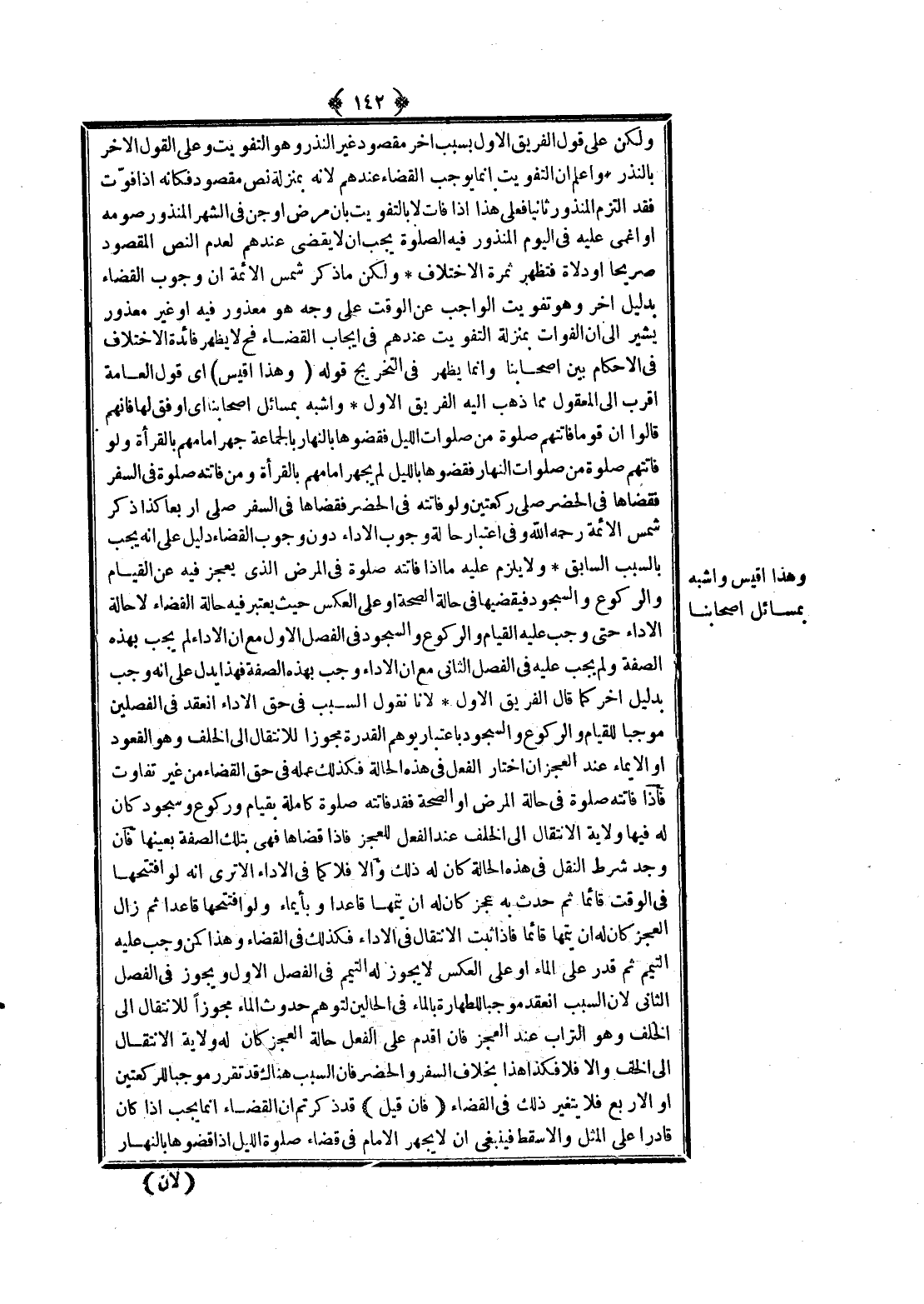 ، وَلَكِنْ مَا ذَكَرَ شَمْسُ الْأَئِمَّةِ أَنَّ وُجُوبَ الْقَضَاءِ بِدَلِيلٍ آخَرَ، وَهُوَ تَفْوِيتُ الْوَاجِبِ عَنْ الْوَقْتِ عَلَى وَجْهٍ هُوَ مَعْذُورٌ فِيهِ أَوْ غَيْرُ مَعْذُورٍ يُشِيرُ إلَى أَنَّ الْفَوَاتَ بِمَنْزِلَةِ التَّفْوِيتِ عِنْدَهُمْ فِي إيجَابِ الْقَضَاءِ فَحِينَئِذٍ لَا يَظْهَرُ فَائِدَةُ الِاخْتِلَافِ فِي الْأَحْكَامِ بَيْنَ أَصْحَابِنَا وَإِنَّمَا يَظْهَرُ فِي التَّخْرِيجِ قَوْلُهُ (وَهَذَا أَقْيَسُ) أَيْ قَوْلُ الْعَامَّةِ أَقْرَبُ إلَى الْمَعْقُولِ مِمَّا ذَهَبَ إلَيْهِ الْفَرِيقُ الْأَوَّلُ، وَأَشْبَهُ بِمَسَائِلِ أَصْحَابِنَا أَيْ أَوْفَقُ لَهَا فَإِنَّهُمْ قَالُوا إنَّ قَوْمًا فَاتَتْهُمْ صَلَاةٌ مِنْ صَلَوَاتِ اللَّيْلِ فَقَضَوْهَا بِالنَّهَارِ بِالْجَمَاعَةِ جَهَرَ إمَامُهُمْ بِالْقِرَاءَةِ وَلَوْ فَاتَتْهُمْ صَلَاةٌ مِنْ صَلَوَاتِ النَّهَارِ فَقَضَوْهَا بِاللَّيْلِ لَمْ يَجْهَرْ إمَامُهُمْ بِالْقِرَاءَةِ وَمَنْ فَاتَتْهُ صَلَاةٌ فِي السَّفَرِ فَقَضَاهَا فِي الْحَضَرِ صَلَّى رَكْعَتَيْنِ لَوْ فَاتَتْهُ فِي الْحَضَرِ فَقَضَاهَا فِي السَّفَرِ صَلَّى أَرْبَعًا كَذَا ذَكَرَ شَمْسُ الْأَئِمَّةِ - رَحِمَهُ اللَّهُ - وَفِي اعْتِبَارِ حَالَةِ وُجُوبِ الْأَدَاءِ دُونَ وُجُوبِ الْقَضَاءِ دَلِيلٌ عَلَى أَنَّهُ يَجِبُ بِالسَّبَبِ السَّابِقِ، وَلَا يَلْزَمُ عَلَيْهِ مَا إذَا فَاتَتْهُ صَلَاةٌ فِي الْمَرَضِ الَّذِي يَعْجِزُ فِيهِ عَنْ الْقِيَامِ وَالرُّكُوعِ وَالسُّجُودِ فَيَقْضِيهَا فِي حَالَةِ الصِّحَّةِ أَوْ عَلَى الْعَكْسِ حَيْثُ يُعْتَبَرُ فِيهِ حَالَةُ الْقَضَاءِ لَا حَالَةُ الْأَدَاءِ حَتَّى وَجَبَ عَلَيْهِ الْقِيَامُ وَالرُّكُوعُ وَالسُّجُودُ فِي الْفَصْلِ الْأَوَّلِ مَعَ أَنَّ الْأَدَاءَ لَمْ يَجِبْ بِهَذِهِ الصِّفَةِ وَلَمْ يَجِبْ عَلَيْهِ فِي الْفَصْلِ الثَّانِي مَعَ أَنَّ الْأَدَاءَ وَجَبَ بِهَذِهِ الصِّفَةِ فَهَذَا يَدُلُّ عَلَى أَنَّهُ وَجَبَ بِدَلِيلٍ آخَرَ كَمَا قَالَ الْفَرِيقُ الْأَوَّلُ؛ لِأَنَّا نَقُولُ السَّبَبُ فِي حَقِّ الْأَدَاءِ انْعَقَدَ فِي الْفَصْلَيْنِ مُوجِبًا لِلْقِيَامِ وَالرُّكُوعِ وَالسُّجُودِ بِاعْتِبَارٍ يُوهِمُ الْقُدْرَةَ مُجَوِّزًا لِلِانْتِقَالِ إلَى الْخُلْفِ وَهُوَ الْقُعُودُ أَوْ الْإِيمَاءُ عِنْدَ الْعَجْزِ إنْ اخْتَارَ الْفِعْلَ فِي هَذِهِ الْحَالَةِ.