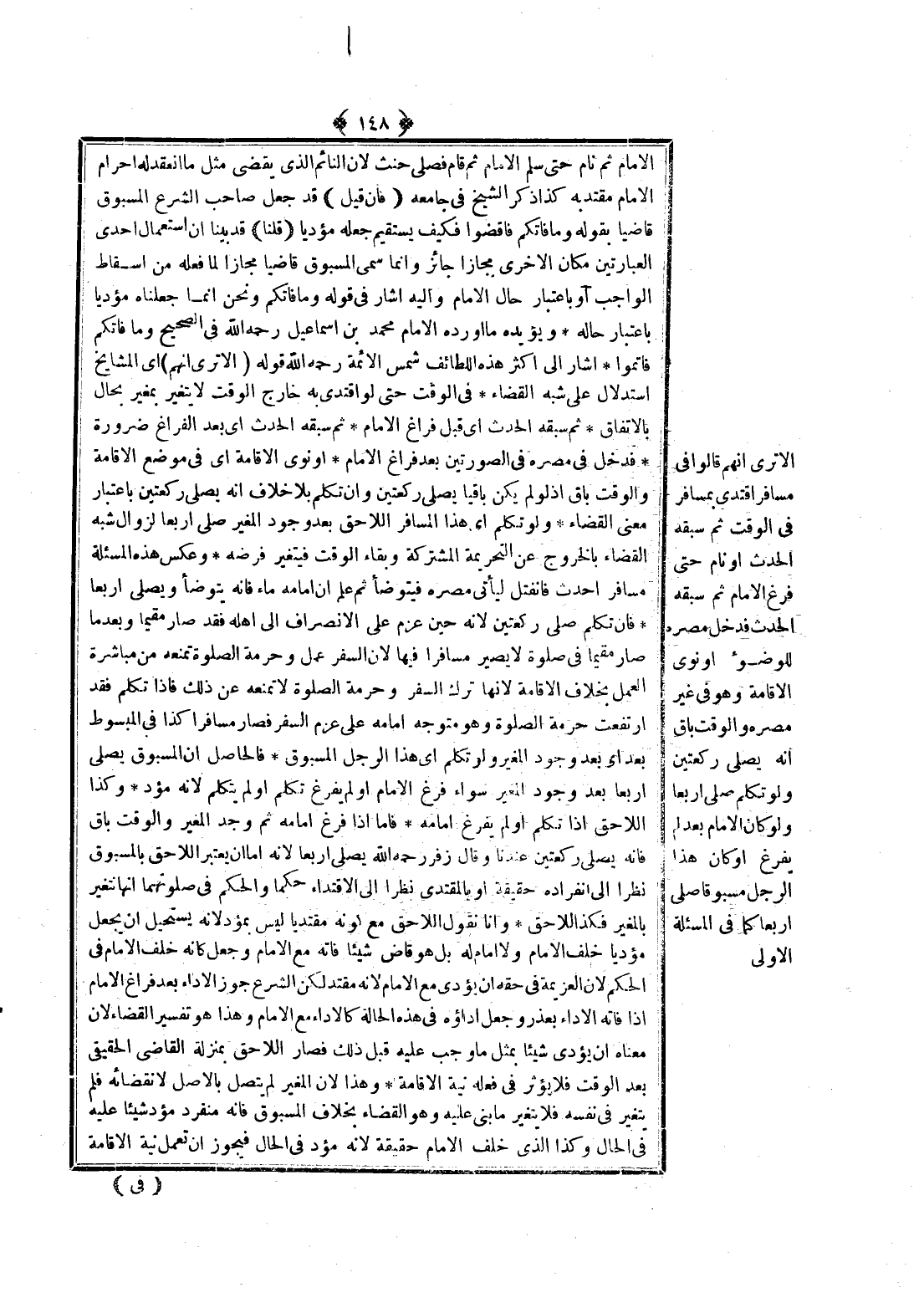 أَلَا تَرَى أَنَّهُمْ قَالُوا فِي مُسَافِرٍ اقْتَدَى بِمُسَافِرٍ فِي الْوَقْتِ ثُمَّ سَبَقَهُ الْحَدَثُ أَوْ نَامَ حَتَّى فَرَغَ الْإِمَامُ ثُمَّ سَبَقَهُ الْحَدَثُ فَدَخَلَ مِصْرَهُ لِلْوُضُوءِ أَوْ نَوَى الْإِقَامَةَ، وَهُوَ فِي غَيْرِ مِصْرِهِ وَالْوَقْتُ بَاقٍ أَنَّهُ يُصَلِّي رَكْعَتَيْنِ وَلَوْ تَكَلَّمَ صَلَّى أَرْبَعًا وَلَوْ كَانَ الْإِمَامُ بَعْدُ لَمْ يَفْرُغْ أَوْ كَانَ هَذَا الرَّجُلُ مَسْبُوقًا صَلَّى أَرْبَعًا كَمَا فِي الْمَسْأَلَةِ الْأُولَى