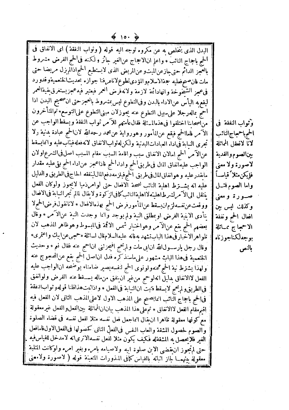 وَثَوَابُ النَّفَقَةِ فِي الْحَجِّ بِإِحْجَاجِ النَّائِبِ؛ لِأَنَّا لَا نَعْقِلُ الْمُمَاثَلَةَ بَيْنَ الصَّوْمِ وَالْفِدْيَةِ لَا صُورَةً وَلَا مَعْنًى فَلَمْ يَكُنْ مِثْلًا قِيَاسًا وَأَمَّا الصَّوْمُ فَمِثْلٌ صُورَةً وَمَعْنًى وَكَذَلِكَ لَيْسَ بَيْنَ أَفْعَالِ الْحَجِّ وَنَفَقَةِ الْإِحْجَاجِ مُمَاثَلَةٌ بِوَجْهٍ لَكِنَّا جَوَّزْنَاهُ بِالنَّصِّ