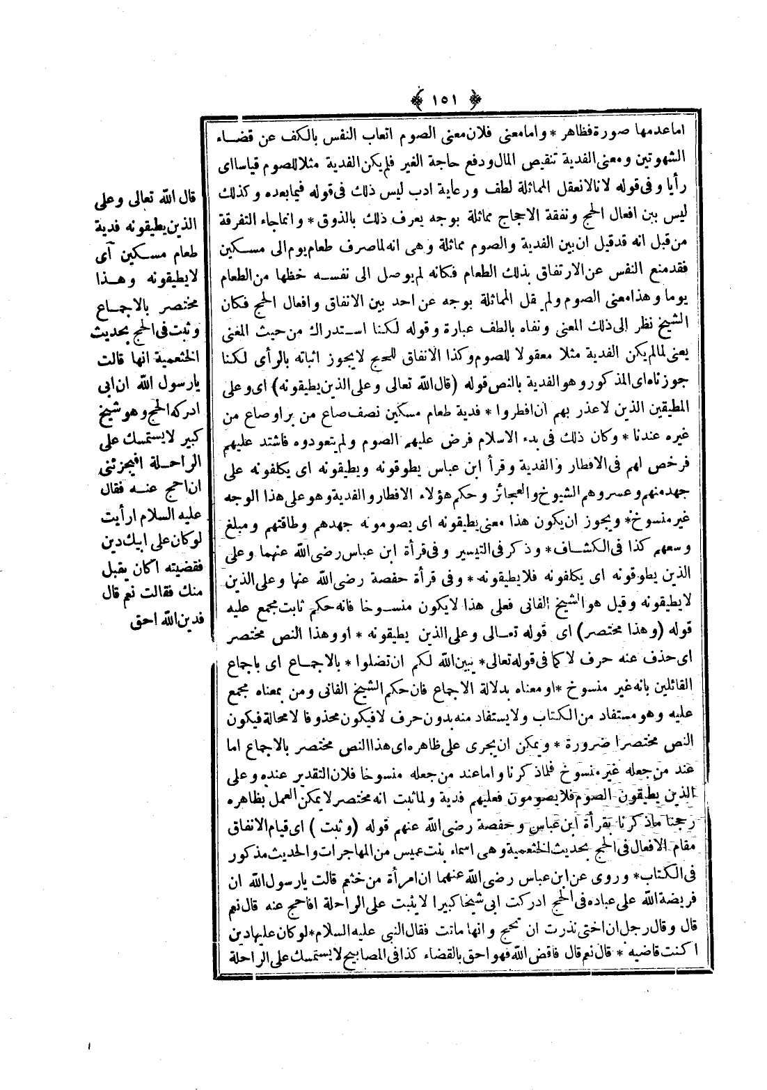 وَيُمْكِنُ أَنْ يَجْرِيَ عَلَى ظَاهِرِهِ أَيْ هَذَا النَّصُّ مُخْتَصَرٌ بِالْإِجْمَاعِ أَمَّا عِنْدَ مَنْ جَعَلَهُ غَيْرَ مَنْسُوخٍ فَلِمَا ذَكَرْنَا وَأَمَّا عِنْدَ مَنْ جَعَلَهُ مَنْسُوخًا فَلِأَنَّ التَّقْدِيرَ عِنْدَهُ وَعَلَى الَّذِينَ يُطِيقُونَ الصَّوْمَ فَلَا يَصُومُونَ فَعَلَيْهِمْ فَدِيَةٌ وَلَمَّا ثَبَتَ أَنَّهُ مُخْتَصَرٌ لَا يُمْكِنُ الْعَمَلُ بِظَاهِرِهِ رَجَّحْنَا مَا ذَكَرْنَا بِقِرَاءَةِ ابْنِ عَبَّاسٍ وَحَفْصَةَ - رَضِيَ اللَّهُ عَنْهُمْ - قَوْلُهُ (وَثَبَتَ) أَيْ قِيَامُ الْإِنْفَاقِ مَقَامَ الْأَفْعَالِ فِي الْحَجِّ بِحَدِيثِ الْخَثْعَمِيَّةِ وَهِيَ أَسْمَاءُ بِنْتُ عُمَيْسٍ مِنْ الْمُهَاجِرَاتِ وَالْحَدِيثُ مَذْكُورٌ فِي الْكِتَابِ.