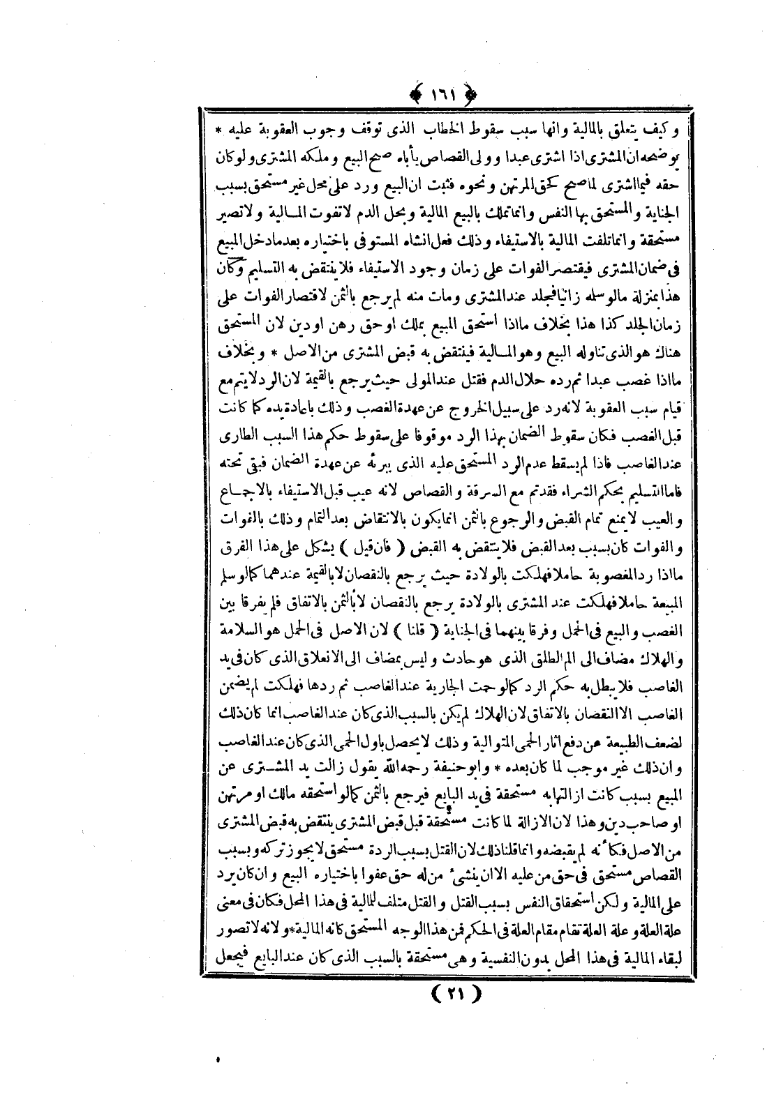 يُوَضِّحُهُ أَنَّ الْمُشْتَرِيَ إذَا اشْتَرَى عَبْدًا وَوَلِيُّ الْقِصَاصِ يَأْبَاهُ صَحَّ الْبَيْعُ وَمَلَكَهُ الْمُشْتَرِي، وَلَوْ كَانَ حَقَّهُ فِيمَا اشْتَرَى لَمَا صَحَّ كَحَقِّ الْمُرْتَهِنِ وَنَحْوِهِ فَثَبَتَ أَنَّ الْبَيْعَ وَرَدَ عَلَى مَحَلٍّ غَيْرِ مُسْتَحَقٍّ بِسَبَبِ الْجِنَايَةِ وَالْمُسْتَحَقُّ بِهَا النَّفْسُ وَإِنَّمَا تُمْلَكُ بِالْبَيْعِ الْمَالِيَّةُ وَبِحِلِّ الدَّمِ لَا تَفُوتُ الْمَالِيَّةُ وَلَا تَصِيرُ مُسْتَحَقَّةً وَإِنَّمَا تَلِفَتْ الْمَالِيَّةُ بِالِاسْتِيفَاءِ وَذَلِكَ فِعْلُ إنْشَاءِ الْمُسْتَوْفِي بِاخْتِيَارِهِ بَعْدَمَا دَخَلَ الْمَبِيعُ فِي ضَمَانِ الْمُشْتَرِي فَيَقْتَصِرُ الْفَوَاتُ عَلَى زَمَانِ وُجُودِ الِاسْتِيفَاءِ فَلَا يَنْتَقِضُ بِهِ التَّسْلِيمُ، وَكَانَ هَذَا بِمَنْزِلَةِ مَا لَوْ سَلَّمَهُ زَانِيًا فَجُلِدَ عِنْدَ الْمُشْتَرِي وَمَاتَ مِنْهُ لَمْ يَرْجِعْ بِالثَّمَنِ لِاقْتِصَارِ الْفَوَاتِ عَلَى زَمَانِ الْجَلْدِ كَذَا هَذَا بِخِلَافِ مَا إذَا اُسْتُحِقَّ الْمَبِيعُ بِمِلْكٍ أَوْ حَقِّ رَهْنٍ أَوْ دَيْنٍ؛ لِأَنَّ الْمُسْتَحَقَّ هُنَاكَ هُوَ الَّذِي تَنَاوَلَهُ الْبَيْعُ وَهُوَ الْمَالِيَّةُ فَيَنْتَقِضُ بِهِ قَبْضُ الْمُشْتَرِي مِنْ الْأَصْلِ.