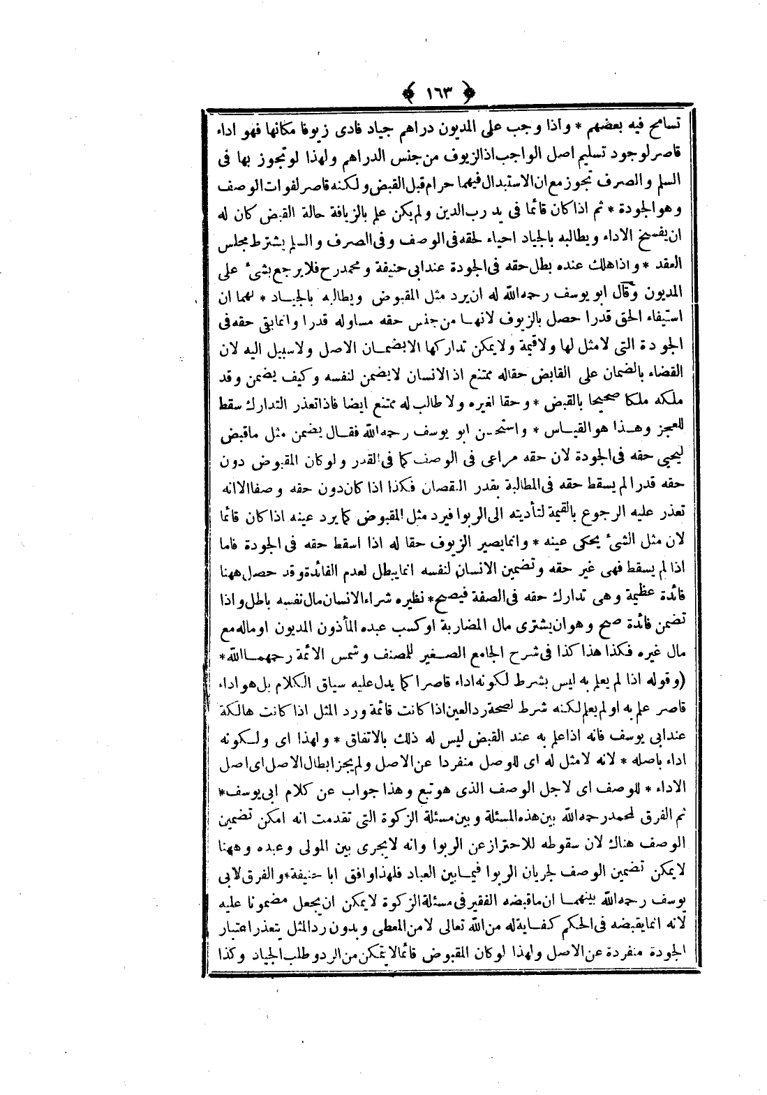 (وَقَوْلُهُ إذَا لَمْ يَعْلَمْ بِهِ) لَيْسَ بِشَرْطٍ لِكَوْنِهِ أَدَاءً قَاصِرًا كَمَا يَدُلُّ عَلَيْهِ سِيَاقُ الْكَلَامِ بَلْ هُوَ أَدَاءٌ قَاصِرٌ عَلِمَ بِهِ أَوْ لَمْ يَعْلَمْ لَكِنَّهُ شَرْطٌ لِصِحَّةِ الْعَيْنِ إذَا كَانَتْ قَائِمَةً وَرَدُّ الْمِثْلِ إذَا كَانَتْ هَالِكَةً عِنْدَ أَبِي يُوسُفَ فَإِنَّهُ إذَا عَلِمَ بِهِ عِنْدَ الْقَبْضِ لَيْسَ لَهُ ذَلِكَ بِالِاتِّفَاقِ، وَلِهَذَا أَيْ وَلِكَوْنِهِ أَدَاءً بِأَصْلِهِ؛ لِأَنَّهُ لَا مِثْلَ لَهُ أَيْ لِلْوَصْلِ مُنْفَرِدًا عَنْ الْأَصْلِ وَلَمْ يَجُزْ إبْطَالُ الْأَصْلِ أَيْ أَصْلِ الْأَدَاءِ، لِلْوَصْفِ أَيْ لِأَجْلِ الْوَصْفِ الَّذِي هُوَ تَبَعٌ وَهَذَا جَوَابٌ عَنْ كَلَامِ أَبِي يُوسُفَ، ثُمَّ الْفَرْقُ لِمُحَمَّدٍ - رَحِمَهُ اللَّهُ - بَيْنَ هَذِهِ الْمَسْأَلَةِ وَبَيْنَ مَسْأَلَةِ الزَّكَاةِ الَّتِي تَقَدَّمَتْ أَنَّهُ أَمْكَنَ تَضْمِينُ الْوَصْفِ هُنَاكَ؛ لِأَنَّ سُقُوطَهُ لِلِاحْتِرَازِ عَنْ الرِّبَا وَأَنَّهُ لَا يَجْرِي بَيْنَ الْمَوْلَى وَعَبْدِهِ وَهَهُنَا لَا يُمْكِنُ تَضْمِينُ الْوَصْفِ لِجَرَيَانِ الرِّبَا فِيمَا بَيْنَ الْعِبَادِ فَلِهَذَا وَافَقَ أَبَا حَنِيفَةَ.