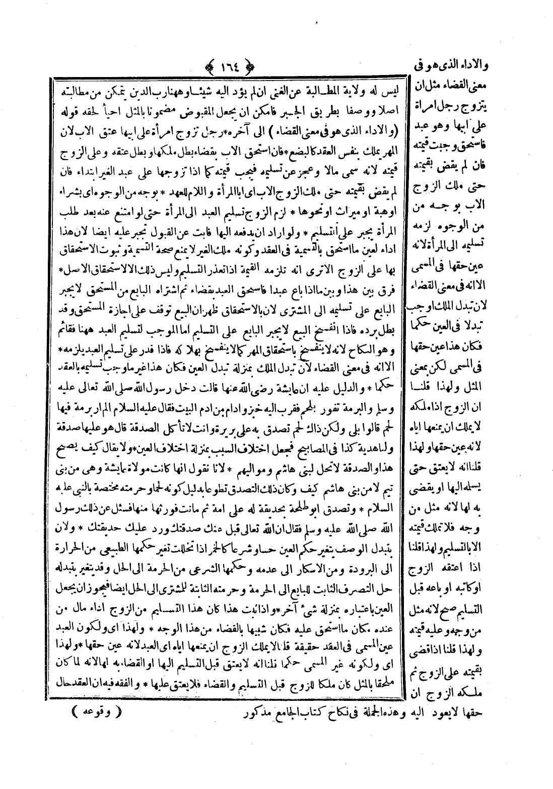 قَوْلُهُ (وَالْأَدَاءُ الَّذِي هُوَ فِي مَعْنَى الْقَضَاءِ) إلَى آخِرِهِ، رَجُلٌ تَزَوَّجَ امْرَأَةً عَلَى أَبِيهَا عَتَقَ الْأَبُ؛ لِأَنَّ الْمَهْرَ يُمْلَكُ بِنَفْسِ الْعَقْدِ كَالْبُضْعِ، فَإِنْ اُسْتُحِقَّ الْأَبُ بِقَضَاءٍ بَطَلَ مِلْكُهَا وَبَطَلَ عِتْقُهُ وَعَلَى الزَّوْجِ قِيمَتُهُ؛ لِأَنَّهُ سَمَّى مَالًا وَعَجَزَ عَنْ تَسْلِيمِهِ فَيَجِبُ قِيمَتُهُ كَمَا إذَا تَزَوَّجَهَا عَلَى عَبْدِ الْغَيْرِ ابْتِدَاءً فَإِنْ لَمْ يُقْضَ بِقِيمَتِهِ حَتَّى مَلَكَ الزَّوْجُ الْأَبَ أَيْ أَبَا الْمَرْأَةِ وَاللَّامِ لِلْعَهْدِ، بِوَجْهٍ مِنْ الْوُجُوهِ أَيْ بِشِرَاءٍ أَوْ هِبَةٍ أَوْ مِيرَاثٍ أَوْ نَحْوِهَا، لَزِمَ الزَّوْجُ تَسْلِيمَ الْعَبْدِ إلَى الْمَرْأَةِ حَتَّى لَوْ امْتَنَعَ عَنْهُ بَعْدَ طَلَبِ الْمَرْأَةِ يُجْبَرُ عَلَى التَّسْلِيمِ، وَلَوْ أَرَادَ أَنْ يَدْفَعَهُ إلَيْهَا فَأَبَتْ عَنْ الْقَبُولِ تُجْبَرُ عَلَيْهِ أَيْضًا؛ لِأَنَّ هَذَا أَدَاءٌ لِعَيْنِ مَا اسْتَحَقَّ بِالتَّسْمِيَةِ فِي الْعَقْدِ وَكَوْنُهُ مِلْكَ الْغَيْرِ لَا يَمْنَعُ صِحَّةَ التَّسْمِيَةِ وَثُبُوتِ الِاسْتِحْقَاقِ بِهَا عَلَى الزَّوْجِ أَلَا تَرَى أَنَّهُ تَلْزَمُهُ الْقِيمَةُ إذَا تَعَذَّرَ التَّسْلِيمُ وَلَيْسَ ذَلِكَ إلَّا لِاسْتِحْقَاقِ الْأَصْلِ.