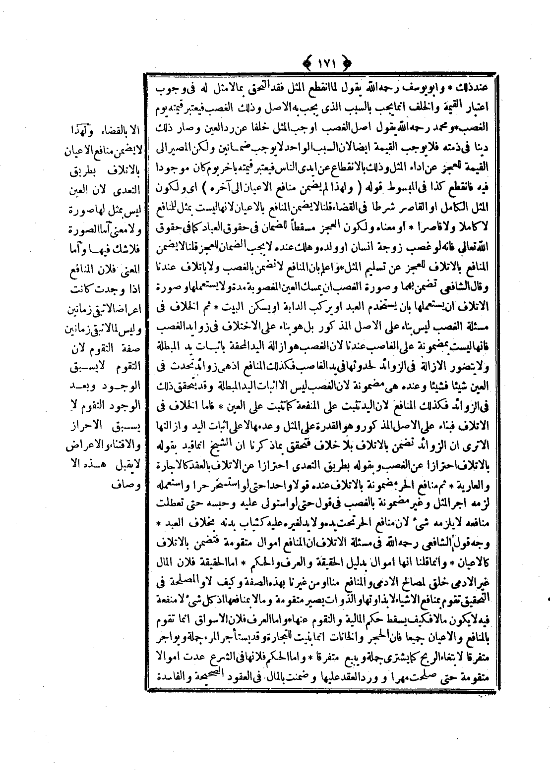 وَاعْلَمْ بِأَنَّ الْمَنَافِعَ لَا تُضْمَنُ بِالْغَصْبِ وَلَا بِإِتْلَافٍ عِنْدَنَا وَقَالَ الشَّافِعِيُّ تُضْمَنُ بِهِمَا وَصُورَةُ الْغَصْبِ أَنْ يُمْسِكَ الْعَيْنَ الْمَغْصُوبَةَ مُدَّةً وَلَا يَسْتَعْمِلُهَا وَصُورَةُ الْإِتْلَافِ أَنْ يَسْتَعْمِلَهَا بِأَنْ يَسْتَخْدِمَ الْعَبْدَ أَوْ يَرْكَبَ الدَّابَّةَ أَوْ يَسْكُنَ الْبَيْتَ.