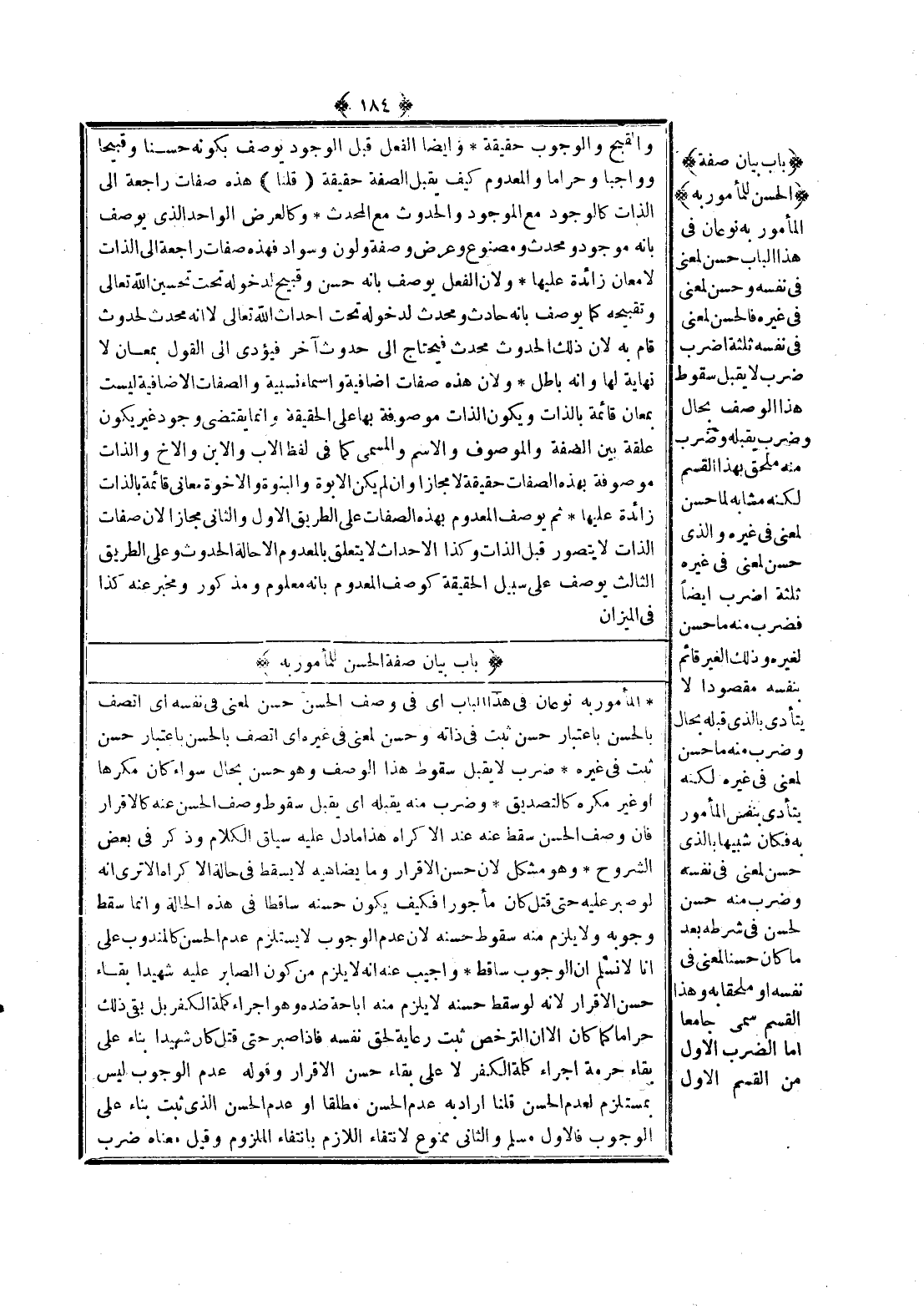 ـــــــــــــــــــــــــــــQوَالْقُبْحِ وَالْوُجُوبِ حَقِيقَةً، وَأَيْضًا الْفِعْلُ قَبْلَ الْوُجُودِ يُوصَفُ بِكَوْنِهِ حَسَنًا وَقَبِيحًا وَوَاجِبًا وَحَرَامًا وَالْمَعْدُومُ كَيْفَ يَقْبَلُ الصِّفَةَ حَقِيقَةً (قُلْنَا) هَذِهِ صِفَاتٌ رَاجِعَةٌ إلَى الذَّاتِ كَالْوُجُودِ مَعَ الْمَوْجُودِ وَالْحُدُوثِ مَعَ الْمُحْدَثِ، وَكَالْعَرَضِ الْوَاحِدِ الَّذِي يُوصَفُ بِأَنَّهُ مَوْجُودٌ وَمُحْدَثٌ وَمَصْنُوعٌ وَعَرَضٌ وَصِفَةٌ وَلَوْنٌ وَسَوَادٌ فَهَذِهِ صِفَاتٌ رَاجِعَةٌ إلَى الذَّاتِ لَا مَعَانٍ زَائِدَةٌ عَلَيْهَا، وَلِأَنَّ الْفِعْلَ يُوصَفُ بِأَنَّهُ حَسَنٌ وَقَبِيحٌ لِدُخُولِهِ تَحْتَ تَحْسِينِ اللَّهِ تَعَالَى وَتَقْبِيحِهِ كَمَا يُوصَفُ بِأَنَّهُ حَادِثٌ وَمُحْدَثٌ لِدُخُولِهِ تَحْتَ أَحْدَاثِ اللَّهِ تَعَالَى لَا أَنَّهُ مُحْدَثٌ لِحُدُوثٍ قَامَ بِهِ؛ لِأَنَّ ذَلِكَ الْحُدُوثَ مُحْدَثٌ فَيَحْتَاجُ إلَى حُدُوثٍ آخَرَ فَيُؤَدِّي إلَى الْقَوْلِ بِمَعَانٍ لَا نِهَايَةَ لَهَا وَأَنَّهُ بَاطِلٌ.