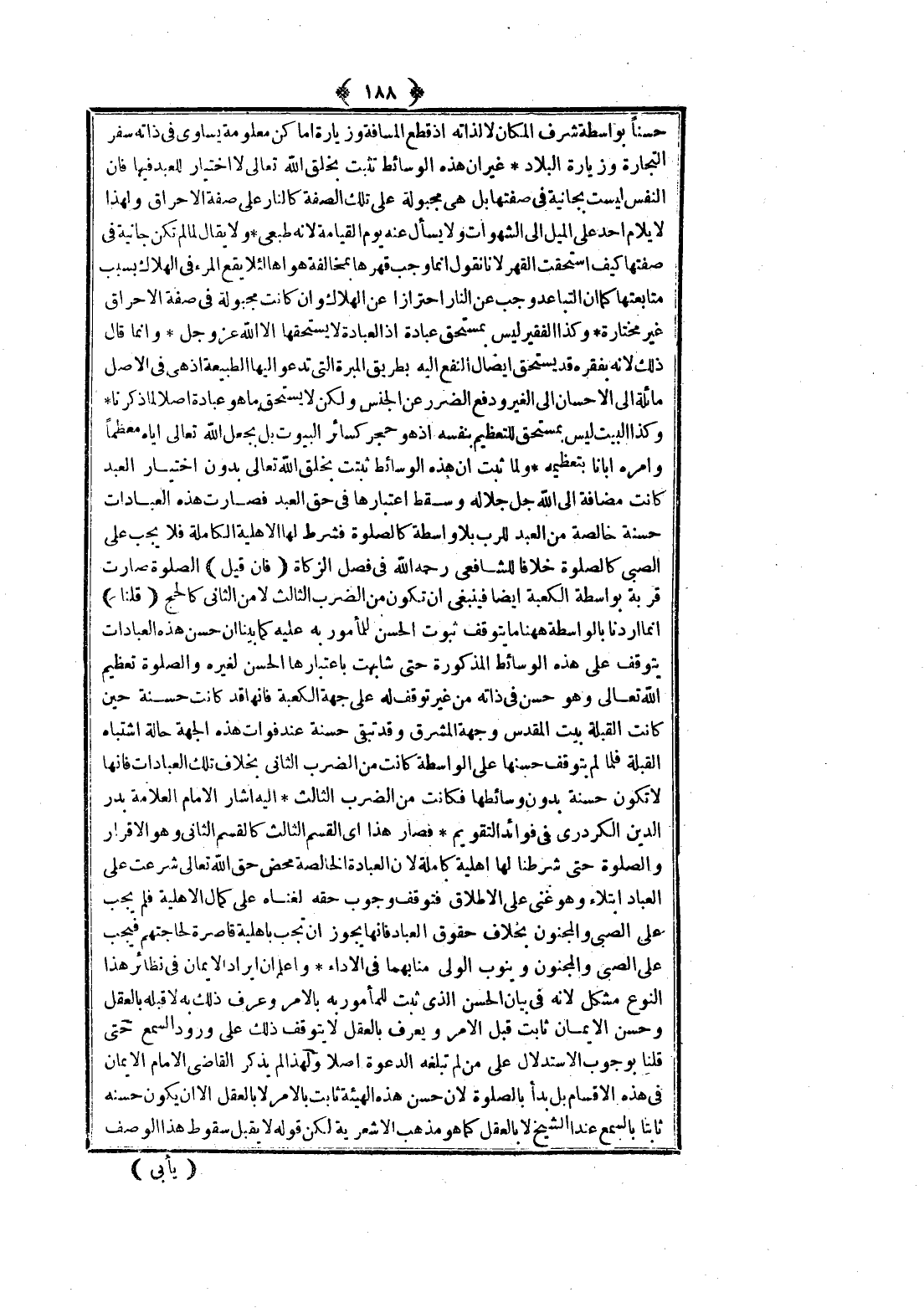 إلَيْهِ أَشَارَ الْإِمَامُ الْعَلَّامَةُ بَدْرُ الدِّينِ الْكَرْدَرِيُّ فِي فَوَائِدِ التَّقْوِيمِ، فَصَارَ هَذَا أَيْ الْقِسْمُ الثَّالِثُ كَالْقِسْمِ الثَّانِي وَهُوَ الْإِقْرَارُ وَالصَّلَاةُ حَتَّى شَرَطْنَا لَهَا أَهْلِيَّةً كَامِلَةً؛ لِأَنَّ الْعِبَادَةَ الْخَالِصَةَ مَحْضُ حَقِّ اللَّهِ تَعَالَى شُرِعَتْ عَلَى الْعِبَادِ ابْتِلَاءً وَهُوَ غَنِيٌّ عَلَى الْإِطْلَاقِ فَتَوَقَّفَ وُجُوبُ حَقِّهِ لِغِنَاهُ عَلَى كَمَالِ الْأَهْلِيَّةِ فَلَمْ يَجِبْ عَلَى الصَّبِيِّ وَالْمَجْنُونِ بِخِلَافِ حُقُوقِ الْعِبَادِ فَإِنَّهَا يَجُوزُ أَنْ تَجِبَ بِأَهْلِيَّةٍ قَاصِرَةٍ لِحَاجَتِهِمْ فَيَجِبُ عَلَى الصَّبِيِّ وَالْمَجْنُونِ وَيَنُوبُ الْوَلِيُّ مَنَابَهُمَا فِي الْأَدَاءِ، وَاعْلَمْ أَنَّ إيرَادَ الْإِيمَانِ فِي نَظَائِرِ هَذَا النَّوْعِ مُشْكِلٌ؛ لِأَنَّهُ فِي بَيَانِ الْحُسْنِ الَّذِي ثَبَتَ لِلْمَأْمُورِ بِهِ بِالْأَمْرِ وَعُرِفَ ذَلِكَ بِهِ لَا قَبْلَهُ بِالْعَقْلِ وَحُسْنُ الْإِيمَانِ ثَابِتٌ قَبْلَ الْأَمْرِ وَيُعْرَفُ بِالْعَقْلِ لَا بِتَوَقُّفِ ذَلِكَ عَلَى وُرُودِ السَّمْعِ حَتَّى قُلْنَا بِوُجُوبِ الِاسْتِدْلَالِ عَلَى مَنْ لَمْ تَبْلُغْهُ الدَّعْوَةُ أَصْلًا، وَلِهَذَا لَمْ يَذْكُرْ الْقَاضِي الْإِمَامُ الْإِيمَانَ فِي هَذِهِ الْأَقْسَامِ بَلْ بَدَأَ بِالصَّلَاةِ؛ لِأَنَّ حُسْنَ هَذِهِ الْهَيْئَةِ ثَابِتٌ بِالْأَمْرِ لَا بِالْعَقْلِ إلَّا أَنْ يَكُونَ حُسْنُهُ ثَابِتًا بِالسَّمْعِ عِنْدَ الشَّيْخِ لَا بِالْعَقْلِ كَمَا هُوَ مَذْهَبُ الْأَشْعَرِيَّةِ لَكِنَّ قَوْلَهُ لَا يَقْبَلُ سُقُوطَ هَذَا الْوَصْفِ