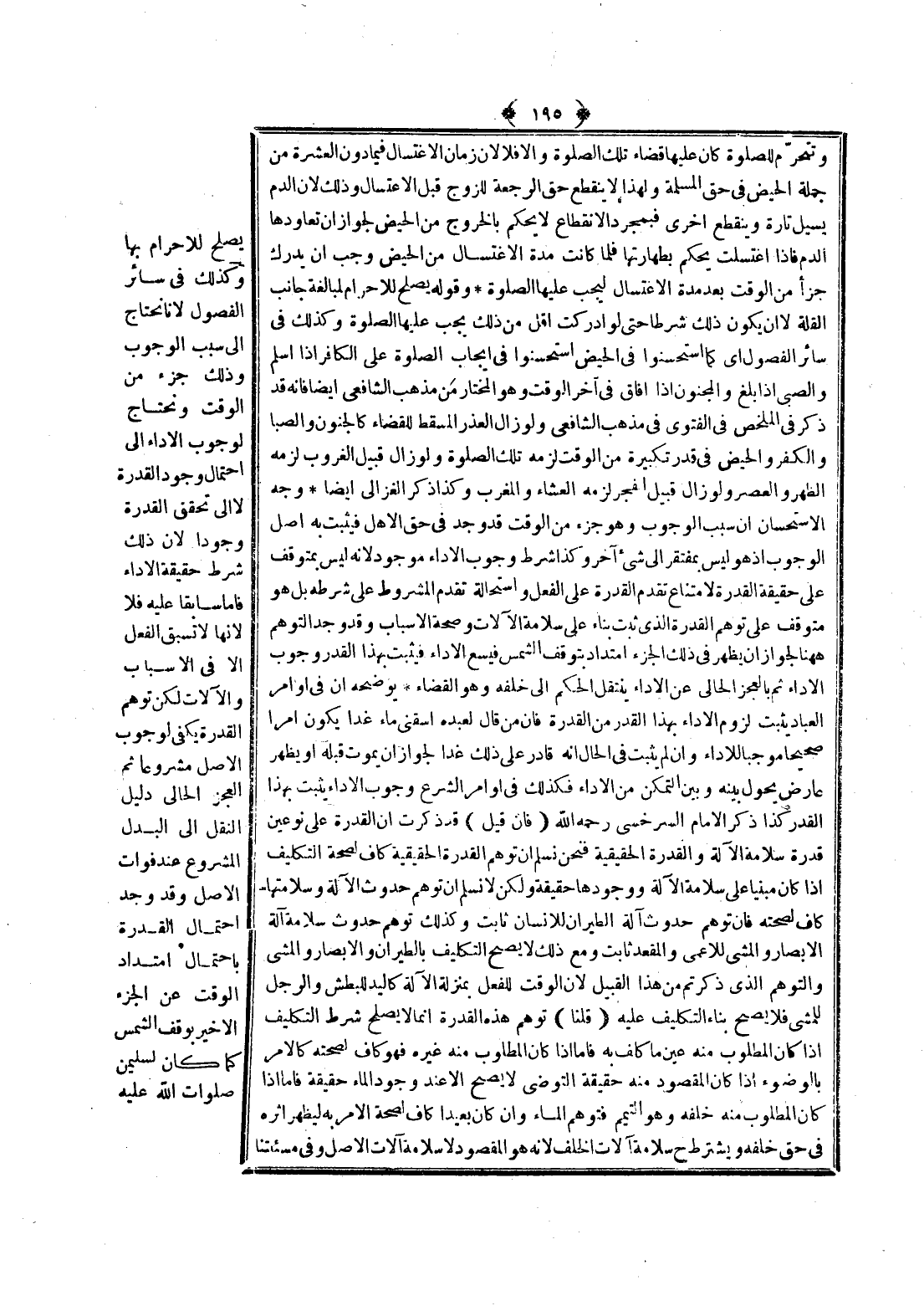 يَصْلُحُ لِلْإِحْرَامِ بِهَا وَكَذَلِكَ فِي سَائِرِ الْفُصُولِ؛ لِأَنَّا نَحْتَاجُ إلَى سَبَبِ الْوُجُوبِ وَذَلِكَ جُزْءٌ مِنْ الْوَقْتِ وَنَحْتَاجُ لِوُجُوبِ الْأَدَاءِ إلَى احْتِمَالِ وُجُودِ الْقُدْرَةِ لَا إلَى تَحَقُّقِ الْقُدْرَةِ وُجُودًا؛ لِأَنَّ ذَلِكَ شَرْطُ حَقِيقَةِ الْأَدَاءِ فَأَمَّا سَابِقًا عَلَيْهِ فَلَا؛ لِأَنَّهَا لَا تَسْبِقُ الْفِعْلَ إلَّا فِي الْأَسْبَابِ وَالْآلَاتِ لَكِنَّ تَوَهُّمَ الْقُدْرَةِ يَكْفِي لِوُجُوبِ الْأَصْلِ مَشْرُوعًا ثُمَّ الْعَجْزُ الْحَالِيُّ دَلِيلُ النَّقْلِ إلَى الْبَدَلِ الْمَشْرُوعِ عِنْدَ فَوَاتِ الْأَصْلِ، وَقَدْ وُجِدَ احْتِمَالُ الْقُدْرَةِ بِاحْتِمَالِ امْتِدَادِ الْوَقْتِ عَنْ الْجُزْءِ الْأَخِيرِ بِوَقْفِ الشَّمْسِ كَمَا كَانَ لِسُلَيْمَانَ صَلَوَاتُ اللَّهِ عَلَيْه