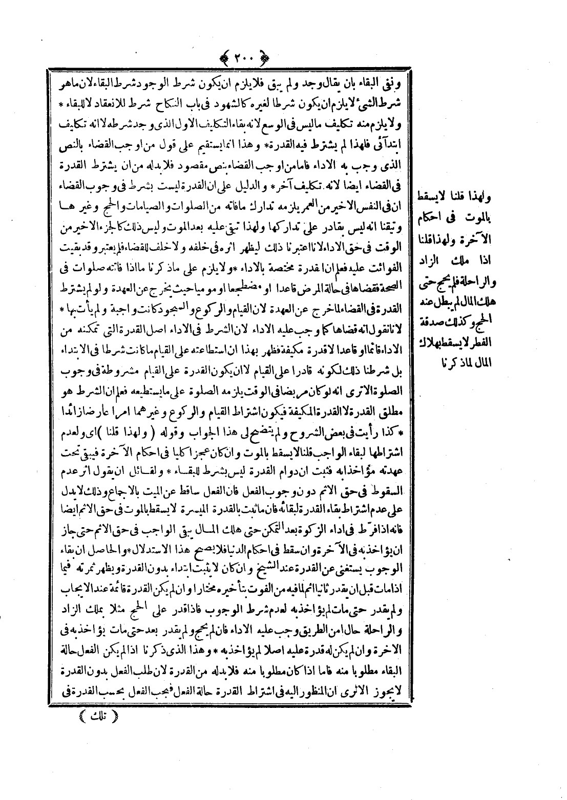 (وَلِهَذَا قُلْنَا) أَيْ وَلِعَدَمِ اشْتِرَاطِهَا لِبَقَاءِ الْوَاجِبِ قُلْنَا لَا يَسْقُطُ بِالْمَوْتِ وَإِنْ كَانَ عَجْزًا كُلِّيًّا فِي أَحْكَامِ الْآخِرَةِ فَيَبْقَى تَحْتَ عُهْدَتِهِ مُؤَاخَذًا بِهِ فَثَبَتَ أَنَّ دَوَامَ الْقُدْرَةِ لَيْسَ بِشَرْطٍ لِلْبَقَاءِ، وَلِقَائِلٍ أَنْ يَقُولَ أَثَرُ عَدَمِ السُّقُوطِ فِي حَقِّ الْإِثْمِ دُونَ وُجُوبِ الْفِعْلِ فَإِنَّ الْفِعْلَ سَاقِطٌ عَنْ الْمَيِّتِ بِالْإِجْمَاعِ وَذَلِكَ لَا يَدُلُّ عَلَى عَدَمِ اشْتِرَاطِ بَقَاءِ الْقُدْرَةِ لِبَقَائِهِ فَإِنَّ مَا ثَبَتَ بِالْقُدْرَةِ الْمُيَسَّرَةِ لَا يَسْقُطُ بِالْمَوْتِ فِي حَقِّ الْإِثْمِ أَيْضًا فَإِنَّهُ إذَا فَرَّطَ فِي أَدَاءِ الزَّكَاةِ بَعْدَ التَّمَكُّنِ حَتَّى هَلَكَ الْمَالُ يَبْقَى الْوَاجِبُ فِي حَقِّ الْإِثْمِ حَتَّى جَازَ أَنْ يُؤَاخَذَ بِهِ فِي الْآخِرَةِ وَإِنْ سَقَطَ فِي أَحْكَامِ الدُّنْيَا فَلَا يَصِحُّ هَذَا الِاسْتِدْلَال.