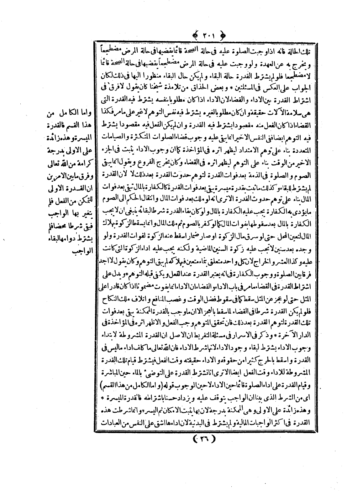 وَذَكَرَ فِي الْأَسْرَارِ فِي مَسْأَلَةِ التَّفْرِيطِ أَنَّ الْأَصْلَ أَنَّ الْقُدْرَةَ الْمَشْرُوطَةَ لِابْتِدَاءِ وُجُوبِ الْأَدَاءِ يُشْتَرَطُ لِبَقَاءِ وُجُودِ الْأَدَاءِ؛ لِأَنَّهَا شَرْطُ الْأَدَاءِ فَإِنَّ اللَّهَ تَعَالَى مَا كَلَّفَ أَدَاءَ مَا لَيْسَ فِي الْقُدْرَةِ وَأَسْقَطَ بِالْحَرَجِ كَثِيرًا مِنْ حُقُوقِهِ وَالْأَدَاءُ حَقِيقَتُهُ وَقْتَ الْفِعْلِ فَيُشْتَرَطُ قِيَامُ تِلْكَ الْقُدْرَةِ الْمَشْرُوطَةِ لِلْأَدَاءِ وَقْتَ الْفِعْلِ أَيْضًا، أَلَا تَرَى أَنَّا نَشْتَرِطُ الْقُدْرَةَ عَلَى التَّوَضُّؤِ بِالْمَاءِ حِينَ الْمُبَاشَرَةِ وَقِيَامَ الْقُدْرَةِ عَلَى أَدَاءِ الصَّلَاةِ قَائِمًا حِينَ الْأَدَاءِ لَا حِينَ الْوُجُوبِ
