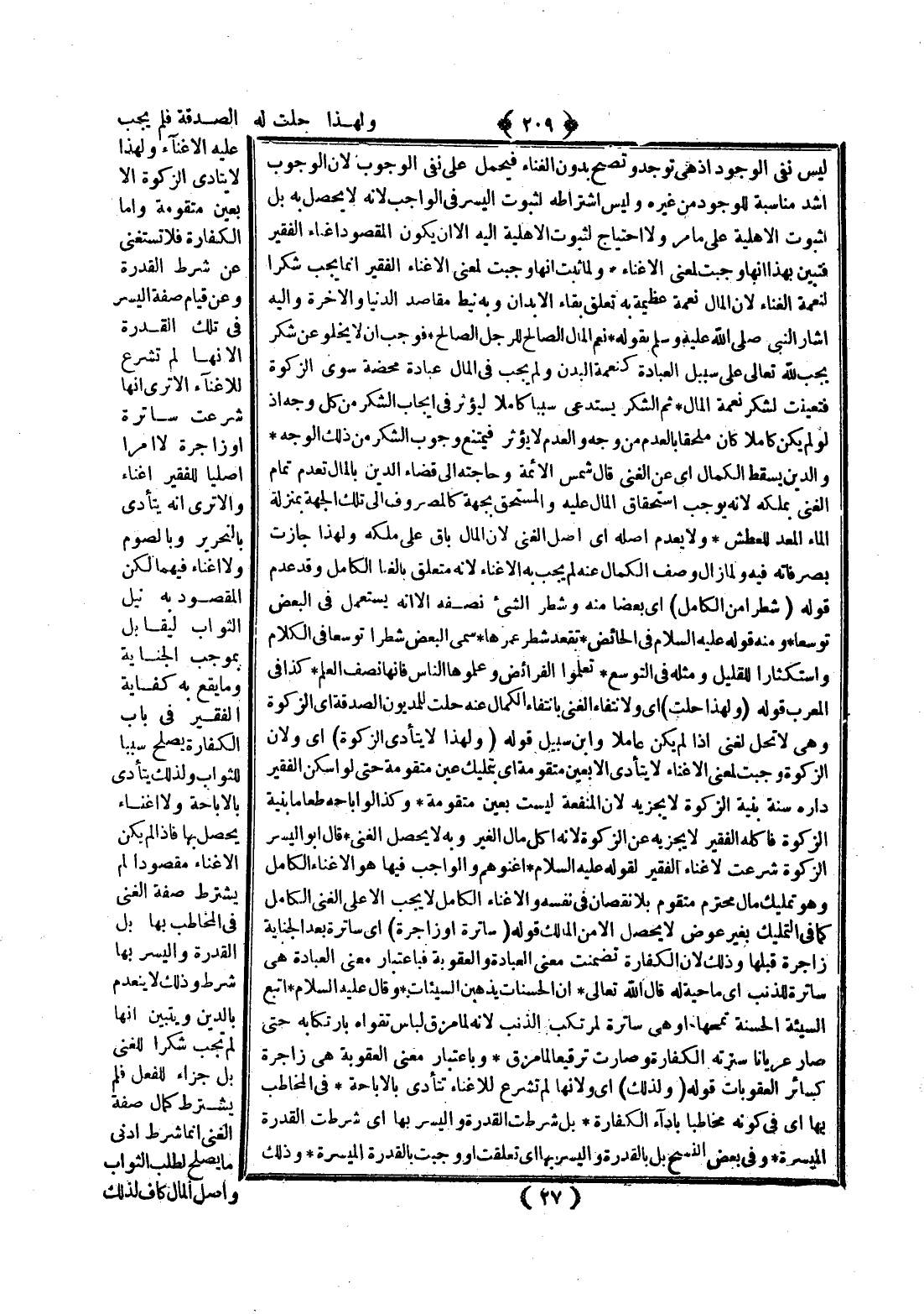 ـــــــــــــــــــــــــــــQلَيْسَ نَفْيَ الْوُجُودِ إذْ هِيَ تُوجَدُ وَتَصِحُّ بِدُونِ الْغَنَاءِ فَيُحْمَلُ عَلَى نَفْيِ الْوُجُوبِ؛ لِأَنَّ الْوُجُوبَ أَشَدُّ مُنَاسَبَةً لِلْوُجُودِ مِنْ غَيْرِهِ وَلَيْسَ اشْتِرَاطُهُ لِثُبُوتِ الْيُسْرِ فِي الْوَاجِبِ؛ لِأَنَّهُ لَا يَحْصُلُ بِهِ بَلْ لِثُبُوتِ الْأَهْلِيَّةِ عَلَى مَا مَرَّ وَلَا احْتِيَاجَ لِثُبُوتِ الْأَهْلِيَّةِ إلَيْهِ إلَّا أَنْ يَكُونَ الْمَقْصُودُ غَنَاءَ الْفَقِيرِ فَتَبَيَّنَ بِهَذَا أَنَّهَا وَجَبَتْ لِمَعْنَى الْإِغْنَاءِ، وَلَمَّا ثَبَتَ أَنَّهَا وَجَبَتْ لِمَعْنَى إغْنَاءِ الْفَقِيرِ إنَّمَا يَجِبُ شُكْرًا لِنِعْمَةِ الْغَنَاءِ؛ لِأَنَّ الْمَالَ نِعْمَةٌ عَظِيمَةٌ بِهِ تَعَلَّقَ بَقَاءُ الْأَبْدَانِ وَبِهِ نِيطَ مَقَاصِدُ الدُّنْيَا وَالْآخِرَةِ وَإِلَيْهِ أَشَارَ النَّبِيُّ - صَلَّى اللَّهُ عَلَيْهِ وَسَلَّمَ - بِقَوْلِهِ «نِعْمَ الْمَالُ الصَّالِحُ لِلرَّجُلِ الصَّالِحِ» ، فَوَجَبَ أَنْ لَا يَخْلُوَ عَنْ شُكْرٍ يَجِبُ لِلَّهِ تَعَالَى عَلَى سَبِيلِ الْعِبَادَةِ كَنِعْمَةِ الْبَدَنِ وَلَمْ يَجِبْ فِي الْمَالِ عِبَادَةٌ مَحْضَةٌ سِوَى الزَّكَاةِ فَتَعَيَّنَتْ لِشُكْرِ نِعْمَةِ الْمَالِ.