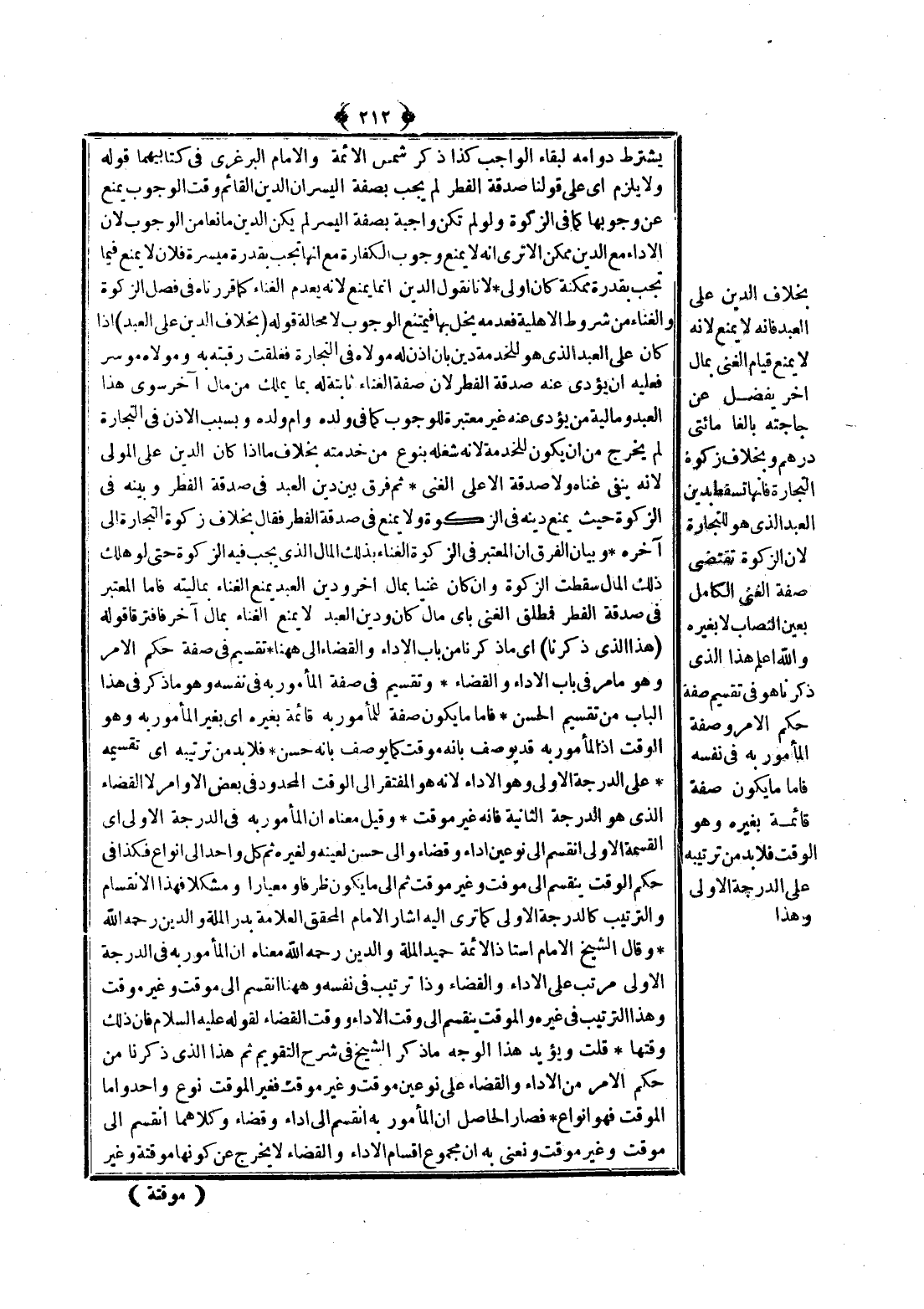 بِخِلَافِ الدَّيْنِ عَلَى الْعَبْدِ فَإِنَّهُ لَا يَمْنَعُ؛ لِأَنَّهُ لَا يَمْنَعُ قِيَامَ الْغِنَى بِمَالٍ آخَرَ يَفْضُلُ عَنْ حَاجَتِهِ بَالِغًا مِائَتَيْ دِرْهَمٍ وَبِخِلَافِ زَكَاةِ التِّجَارَةِ فَإِنَّهَا تَسْقُطُ بِدَيْنِ الْعَبْدِ الَّذِي هُوَ لِلتِّجَارَةِ؛ لِأَنَّ الزَّكَاةَ تَقْتَضِي صِفَةَ الْغِنَى الْكَامِلِ بِعَيْنِ النِّصَابِ لَا بِغَيْرِهِ وَاَللَّهُ أَعْلَمُ هَذَا الَّذِي ذَكَرْنَا هُوَ فِي تَقْسِيمِ صِفَةِ حُكْمِ الْأَمْرِ وَصِفَةِ الْمَأْمُورِ بِهِ فِي نَفْسِهِ فَأَمَّا مَا يَكُونُ صِفَةً قَائِمَةً بِغَيْرِهِ وَهُوَ الْوَقْتُ فَلَا بُدَّ مِنْ تَرْتِيبِهِ عَلَى الدَّرَجَةِ الْأُولَى وَهَذَا