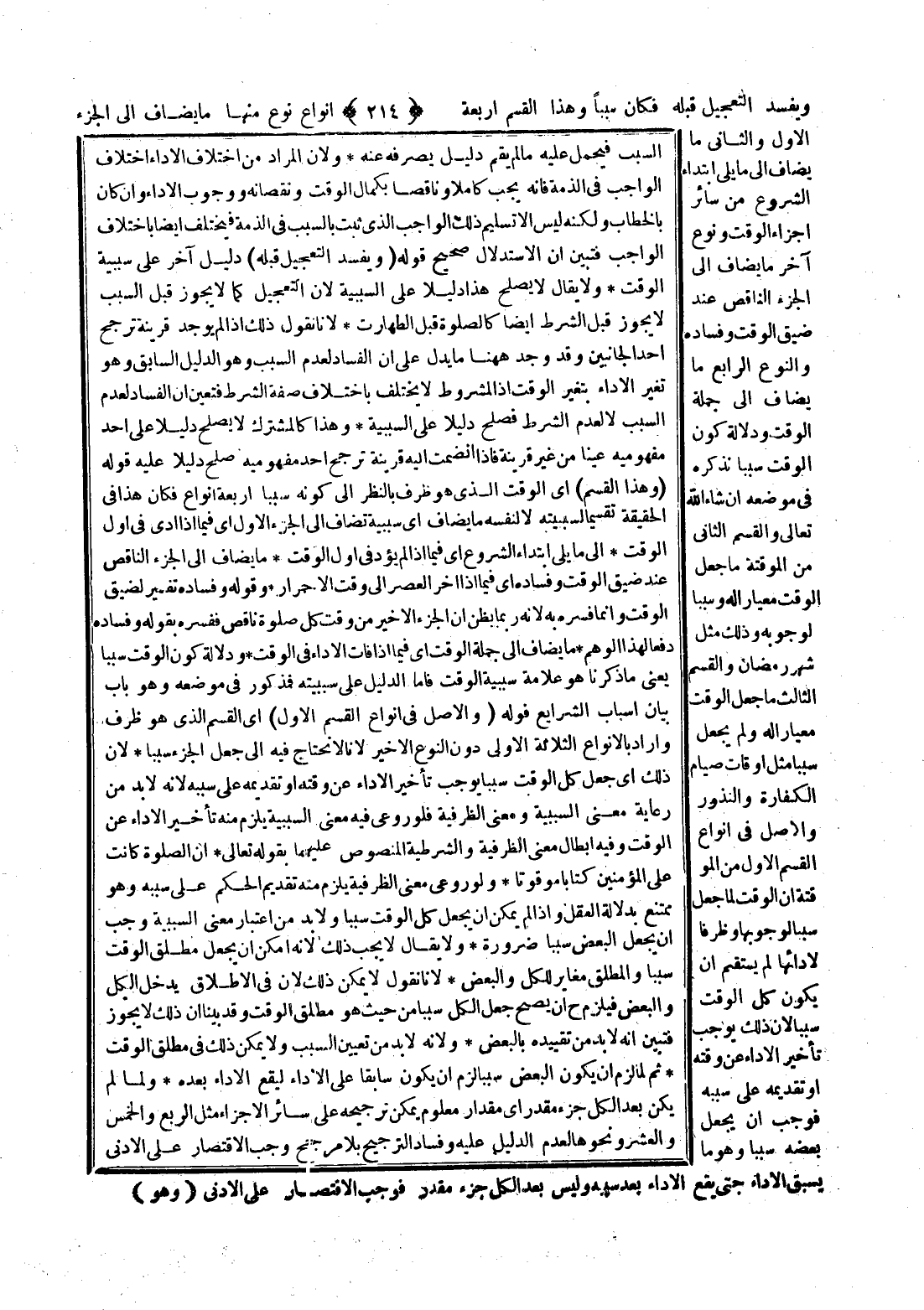 وَيُفْسِدُ التَّعْجِيلُ قَبْلَهُ فَكَانَ سَبَبًا وَهَذَا الْقِسْمُ أَرْبَعَةُ أَنْوَاعٍ نَوْعٌ مِنْهَا مَا يُضَافُ إلَى الْجُزْءِ الْأَوَّلِ وَالثَّانِي مَا يُضَافُ إلَى مَا يَلِي ابْتِدَاءَ الشُّرُوعِ مِنْ سَائِرِ أَجْزَاءِ الْوَقْتِ وَنَوْعٌ آخَرُ مَا يُضَافُ إلَى الْجُزْءِ النَّاقِصِ عِنْدَ ضِيقِ الْوَقْتِ وَفَسَادِهِ، وَالنَّوْعُ الرَّابِعُ مَا يُضَافُ إلَى جُمْلَةِ الْوَقْتِ وَدَلَالَةُ كَوْنِ الْوَقْتِ سَبَبًا نَذْكُرُهُ فِي مَوْضِعِهِ إنْ شَاءَ اللَّهُ تَعَالَى.