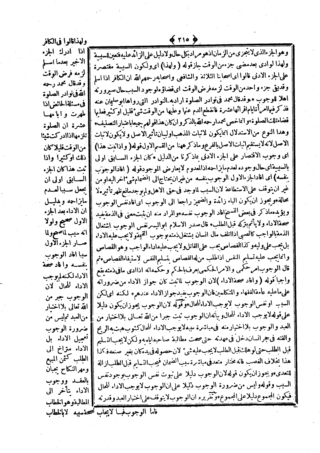 وَلِهَذَا قَالُوا فِي الْكَافِرِ إذَا أَدْرَكَ الْجُزْءَ الْأَخِيرَ بَعْدَمَا أَسْلَمَ لَزِمَهُ فَرْضُ الْوَقْتِ، وَقَدْ قَالَ مُحَمَّدٌ - رَحِمَهُ اللَّهُ - فِي نَوَادِرِ الصَّلَاةِ فِي مَسْأَلَةِ الْحَائِضِ إذَا طَهُرَتْ وَأَيَّامُهَا عَشْرَةٌ إنَّ الصَّلَاةَ تَلْزَمُهَا إذَا أَدْرَكَتْ شَيْئًا مِنْ الْوَقْتِ قَلِيلًا كَانَ ذَلِكَ أَوْ كَثِيرًا وَإِذَا ثَبَتَ هَذَا كَانَ الْجُزْءُ السَّابِقُ أَوْلَى أَنْ يُجْعَلَ سَبَبًا لِعَدَمِ مَا يُزَاحِمُهُ، وَبِدَلِيلِ أَنَّ الْأَدَاءَ بَعْدَ الْجُزْءِ الْأَوَّلِ صَحِيحٌ وَلَوْلَا أَنَّهُ سَبَبٌ لَمَا صَحَّ وَلَمَا صَارَ الْجُزْءُ الْأَوَّلُ سَبَبًا أَفَادَ الْوُجُوبَ بِنَفْسِهِ وَأَفَادَ صِحَّةَ الْأَدَاءِ لَكِنَّهُ لَمْ يُوجِبْ الْأَدَاءَ لِلْحَالِ؛ لِأَنَّ الْوُجُوبَ جَبْرٌ مِنْ اللَّهِ تَعَالَى بِلَا اخْتِيَارٍ مِنْ الْعَبْدِ ثُمَّ لَيْسَ مِنْ ضَرُورَةِ الْوُجُوبِ تَعْجِيلُ الْأَدَاءِ بَلْ الْأَدَاءُ مُتَرَاخٍ إلَى الطَّلَبِ كَثَمَنِ الْمَبِيعِ وَمَهْرِ النِّكَاحِ يَجِبَانِ بِالْعَقْدِ، وَوُجُوبُ الْأَدَاءِ يَتَأَخَّرُ إلَى الْمُطَالَبَةِ وَهُوَ الْخِطَابُ فَأَمَّا الْوُجُوبُ فَبِالْإِيجَابِ لِصِحَّةِ سَبَبِهِ لَا بِالْخِطَابِ