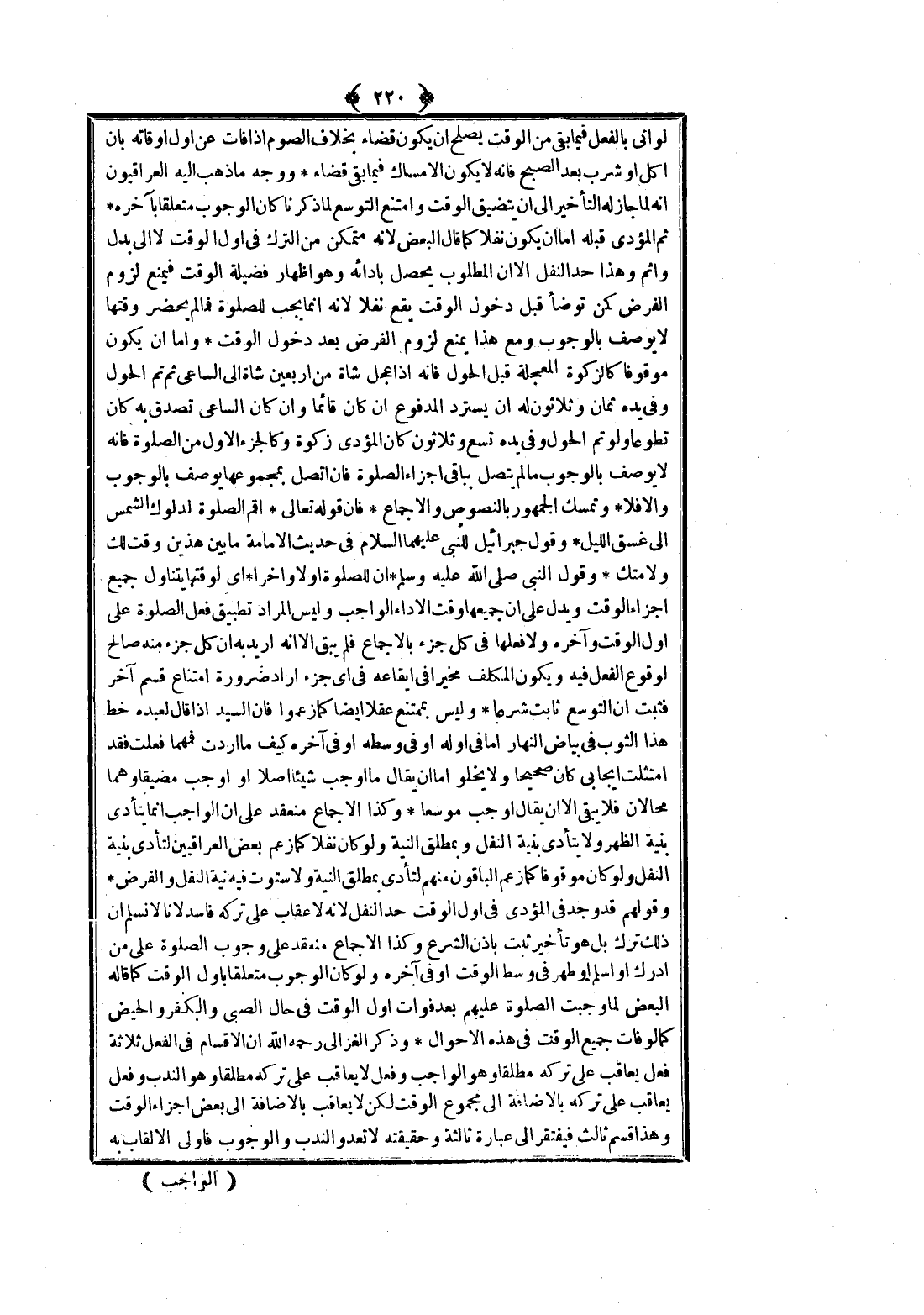 وَقَوْلُهُمْ قَدْ وُجِدَ فِي الْمُؤَدَّى فِي أَوَّلِ وَقْتِ حَدِّ النَّفْلِ؛ لِأَنَّهُ لَا عِقَابَ عَلَى تَرْكِهِ فَاسِدٌ؛ لِأَنَّا لَا نُسَلِّمُ أَنَّ ذَلِكَ تَرْكٌ بَلْ هُوَ تَأْخِيرٌ ثَبَتَ بِإِذْنِ الشَّرْعِ وَكَذَا الْإِجْمَاعُ مُنْعَقِدٌ عَلَى وُجُوبِ الصَّلَاةِ عَلَى مَنْ أَدْرَكَ أَوْ أَسْلَمَ أَوْ طَهُرَ فِي وَسَطِ الْوَقْتِ أَوْ فِي آخِرِهِ وَلَوْ كَانَ الْوُجُوبُ مُتَعَلِّقًا بِأَوَّلِ الْوَقْتِ كَمَا قَالَهُ الْبَعْضُ لَمَا وَجَبَتْ الصَّلَاةُ عَلَيْهِمْ بَعْدَ فَوَاتِ أَوَّلِ الْوَقْتِ فِي حَالِ الصَّبِيِّ وَالْكُفْرِ وَالْحَيْضِ كَمَا لَوْ فَاتَ جَمِيعُ الْوَقْتِ فِي هَذِهِ الْأَحْوَالِ، وَذَكَرَ الْغَزَالِيُّ - رَحِمَهُ اللَّهُ - أَنَّ الْأَقْسَامَ فِي الْفِعْلِ ثَلَاثَةٌ فِعْلٌ يُعَاقَبُ عَلَى تَرْكِهِ مُطْلَقًا وَهُوَ الْوَاجِبُ، وَفِعْلٌ لَا يُعَاقَبُ عَلَى تَرْكِهِ مُطْلَقًا، وَهُوَ النَّدْبُ وَفِعْلٌ يُعَاقَبُ عَلَى تَرْكِهِ بِالْإِضَافَةِ إلَى مَجْمُوعِ الْوَقْتِ لَكِنْ لَا يُعَاقَبُ بِالْإِضَافَةِ إلَى بَعْضِ أَجْزَاءِ الْوَقْتِ وَهَذَا قِسْمٌ ثَالِثٌ فَيَفْتَقِرُ إلَى عِبَارَةٍ ثَالِثَةٍ وَحَقِيقَتُهُ لَا تَعْدُو النَّدْبَ وَالْوُجُوبَ فَأَوْلَى الْأَلْقَابِ بِهِ