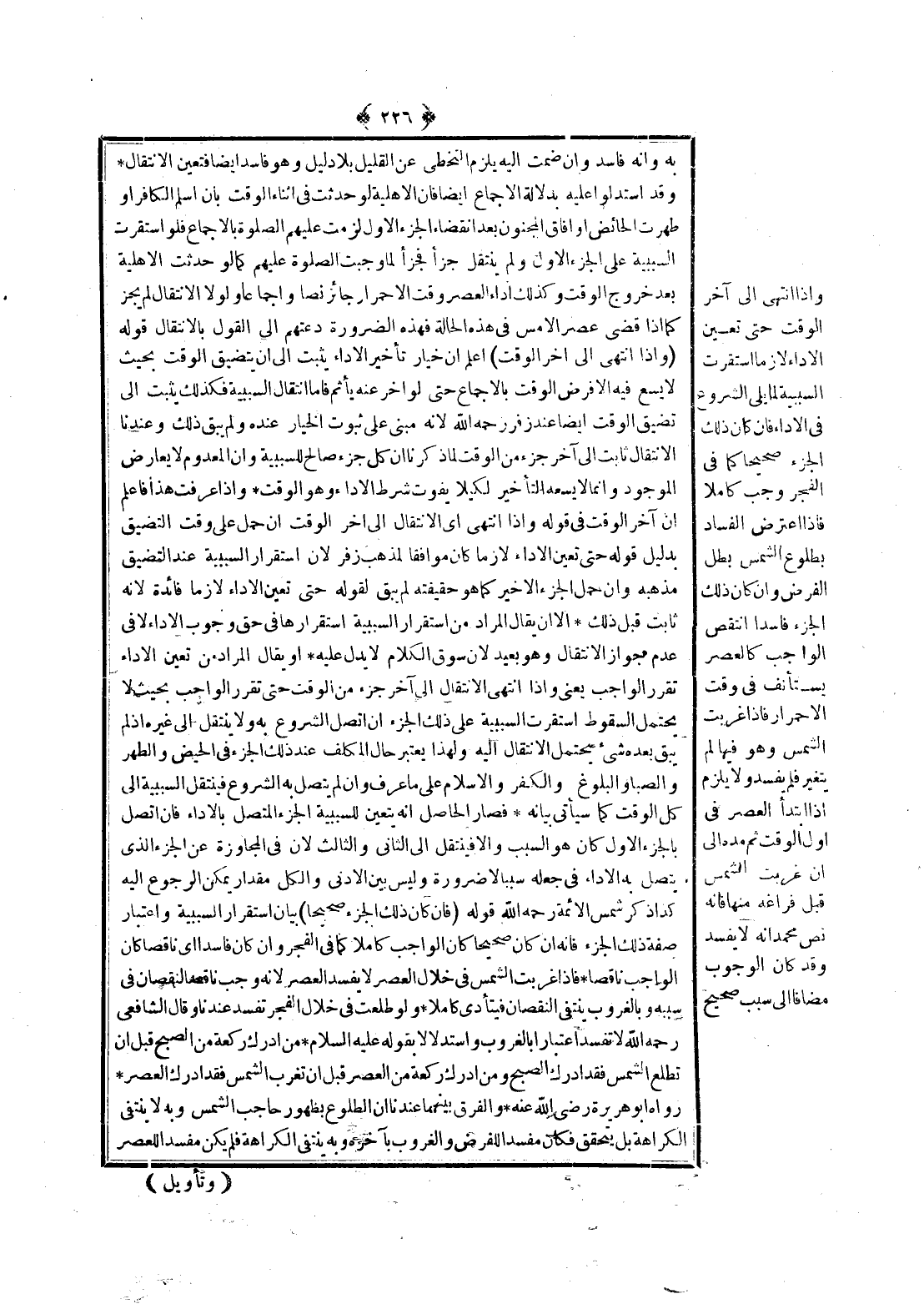 ، أَوْ يُقَالَ الْمُرَادُ مِنْ تَعَيُّنِ الْأَدَاءِ تَقَرُّرُ الْوَاجِبِ يَعْنِي وَإِذَا انْتَهَى الِانْتِقَالُ إلَى آخِرِ جُزْءٍ مِنْ الْوَقْتِ حَتَّى تَقَرَّرَ الْوَاجِبُ بِحَيْثُ لَا يَحْتَمِلُ السُّقُوطَ اسْتَقَرَّتْ السَّبَبِيَّةُ عَلَى ذَلِكَ الْجُزْءِ إنْ اتَّصَلَ الشُّرُوعُ بِهِ وَلَا يُنْتَقَلُ إلَى غَيْرِهِ إذْ لَمْ يَبْقَ بَعْدَهُ شَيْءٌ يَحْتَمِلُ الِانْتِقَالَ إلَيْهِ وَلِهَذَا يُعْتَبَرُ حَالُ الْمُكَلَّفِ عِنْدَ ذَلِكَ الْجُزْءِ فِي الْحَيْضِ وَالطُّهْرِ وَالصِّبَا وَالْبُلُوغِ وَالْكُفْرِ وَالْإِسْلَامِ عَلَى مَا عُرِفَ وَإِنْ لَمْ يَتَّصِلْ بِهِ الشُّرُوعُ فَيَنْتَقِلُ السَّبَبِيَّةُ إلَى كُلِّ الْوَقْتِ كَمَا سَيَأْتِي بَيَانُهُ، فَصَارَ الْحَامِلُ أَنَّهُ يَتَعَيَّنُ لِلسَّبَبِيَّةِ الْجُزْءُ الْمُتَّصِلُ بِالْأَدَاءِ فَإِنْ اتَّصَلَ بِالْجُزْءِ الْأَوَّلِ كَانَ هُوَ السَّبَبَ وَإِلَّا فَيَنْتَقِلُ إلَى الثَّانِي وَالثَّالِثِ؛ لِأَنَّ فِي الْمُجَاوَرَةِ عَنْ الْجُزْءِ الَّذِي يَتَّصِلُ بِهِ الْأَدَاءُ فِي جَعْلِهِ سَبَبًا لَا ضَرُورَةً وَلَيْسَ بَيْنَ الْأَدْنَى وَالْكُلِّ مِقْدَارٌ يُمْكِنُ الرُّجُوعُ إلَيْهِ كَذَا ذَكَرَ شَمْسُ الْأَئِمَّةِ - رَحِمَهُ اللَّهُ -.