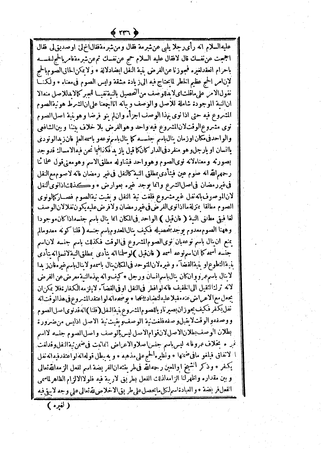 ـــــــــــــــــــــــــــــQ- عَلَيْهِ السَّلَامُ - أَنَّهُ رَأَى رَجُلًا يُلَبِّي عَنْ شُبْرُمَةَ فَقَالَ وَمَنْ شُبْرُمَةَ فَقَالَ أَخٌ لِي أَوْ صَدِيقٌ لِي فَقَالَ أَحَجَجْت عَنْ نَفْسِك قَالَ لَا فَقَالَ - عَلَيْهِ السَّلَامُ - حُجَّ عَنْ نَفْسِك ثُمَّ عَنْ شُبْرُمَةَ» فَأُمِرَ بِالْحَجِّ لِنَفْسِهِ بِإِحْرَامٍ انْعَقَدَ لِغَيْرِهِ فَجَوَّزْنَا عَنْ الْفَرْضِ بِنِيَّةِ النَّفْلِ أَيْضًا دَلَالَةً وَلَا يُمْكِنُ إلْحَاقُ الصَّوْمِ بِالْحَجِّ لِأَنَّ أَمْرَ الْحَجِّ عَظِيمُ الْخَطَرِ لِمَا يَحْتَاجُ فِيهِ إلَى زِيَادَةِ مَشَقَّةٍ وَلَيْسَ الصَّوْمُ فِي مَعْنَاهُ وَلَكِنَّا نَقُولُ الْأَمْرُ عَلَى مَا قُلْت أَيْ لَا بُدَّ لِلْوَصْفِ مِنْ التَّحْصِيلِ بِالنِّيَّةِ نَفْيًا لِلْجَبْرِ كَمَا لَا بُدَّ لِلْأَصْلِ مِنْهُ إلَّا أَنَّ النِّيَّةَ الْمَوْجُودَةَ شَامِلَةٌ لِلْأَصْلِ وَالْوَصْفِ.