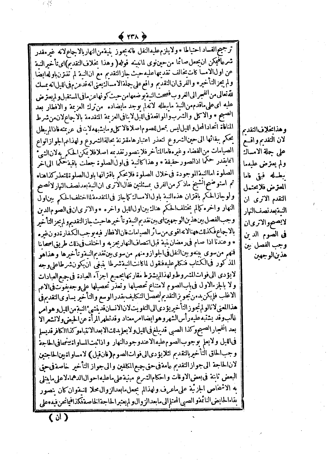 وَهَذَا بِخِلَافِ التَّقْدِيمِ لِأَنَّ التَّقْدِيمَ وَاقِعٌ عَلَى جُمْلَةِ الْإِمْسَاكِ وَلَمْ يَعْتَرِضْ عَلَيْهِ مَا يُبْطِلُهُ فَبَقِيَ فَأَمَّا الْمُعْتَرِضُ فَلَا يَحْتَمِلُ التَّقَدُّمَ أَلَا تَرَى أَنَّ النِّيَّةَ بَعْدَ نِصْفِ النَّهَارِ لَا يَصِحُّ وَأَلَا تَرَى أَنَّ فِي الصَّوْمِ الدَّيْنُ وَجَبَ الْفَصْلُ بَيْنَ هَذَيْنِ الْوَجْهَيْنِ