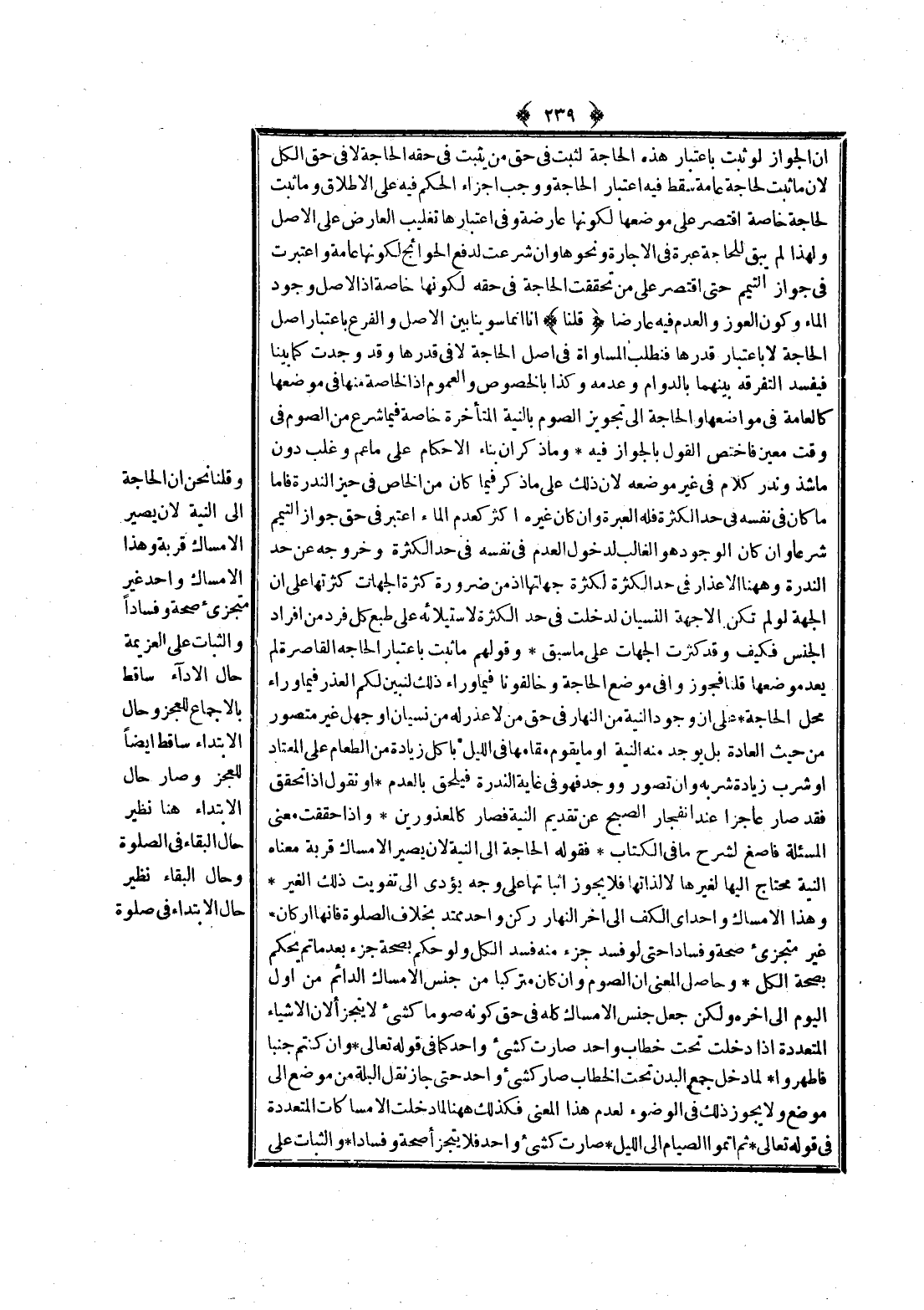 ـــــــــــــــــــــــــــــQأَنَّ الْجَوَازَ لَوْ ثَبَتَ بِاعْتِبَارِ هَذِهِ الْحَاجَةِ لَثَبَتَ فِي حَقِّ مَنْ يَثْبُتُ فِي حَقِّهِ الْحَاجَةُ لَا فِي حَقِّ الْكُلِّ لِأَنَّ مَا ثَبَتَ لِحَاجَةٍ عَامَّةٍ سَقَطَ فِيهِ اعْتِبَارُ الْحَاجَةِ وَوَجَبَ إجْرَاءُ الْحُكْمِ فِيهِ عَلَى الْإِطْلَاقِ وَمَا ثَبَتَ لِحَاجَةٍ خَاصَّةٍ اُقْتُصِرَ عَلَى مَوْضِعِهَا لِكَوْنِهَا عَارِضَةً وَفِي اعْتِبَارِهَا تَغْلِيبُ الْعَارِضِ عَلَى الْأَصْلِ وَلِهَذَا لَمْ يَبْقَ لِلْحَاجَةِ عِبْرَةٌ فِي الْإِجَارَةِ وَنَحْوِهَا وَإِنْ شُرِعَتْ لِدَفْعِ الْحَوَائِجِ لِكَوْنِهَا عَامَّةً وَاعْتُبِرَتْ فِي جَوَازِ التَّيَمُّمِ حَتَّى اُقْتُصِرَ عَلَى مَنْ تَحَقَّقَتْ الْحَاجَةُ فِي حَقِّهِ لِكَوْنِهَا خَاصَّةً إذْ الْأَصْلُ وُجُودُ الْمَاءِ وَكَوْنُ الْعَوَزِ وَالْعَدَمِ فِيهِ عَارِضًا.