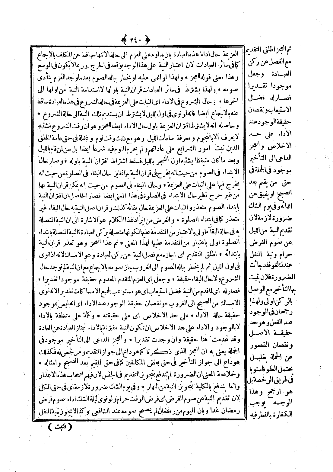 ـــــــــــــــــــــــــــــQالْعَزِيمَةِ حَالَ أَدَاءِ هَذِهِ الْعِبَادَةِ بِأَنْ يُدَاوِمَ عَلَى الْعَزْمِ إلَى حَالَةِ الِانْتِهَاءِ سَاقِطٌ عَنْ الْمُكَلَّفِ بِالْإِجْمَاعِ كَمَا فِي سَائِرِ الْعِبَادَاتِ لِأَنَّ اعْتِبَارَ النِّيَّةِ عَلَى هَذَا الْوَجْهِ يُوقِعُهُ فِي الْحَرَجِ وَرُبَّمَا لَا يَكُونُ فِي الْوُسْعِ.