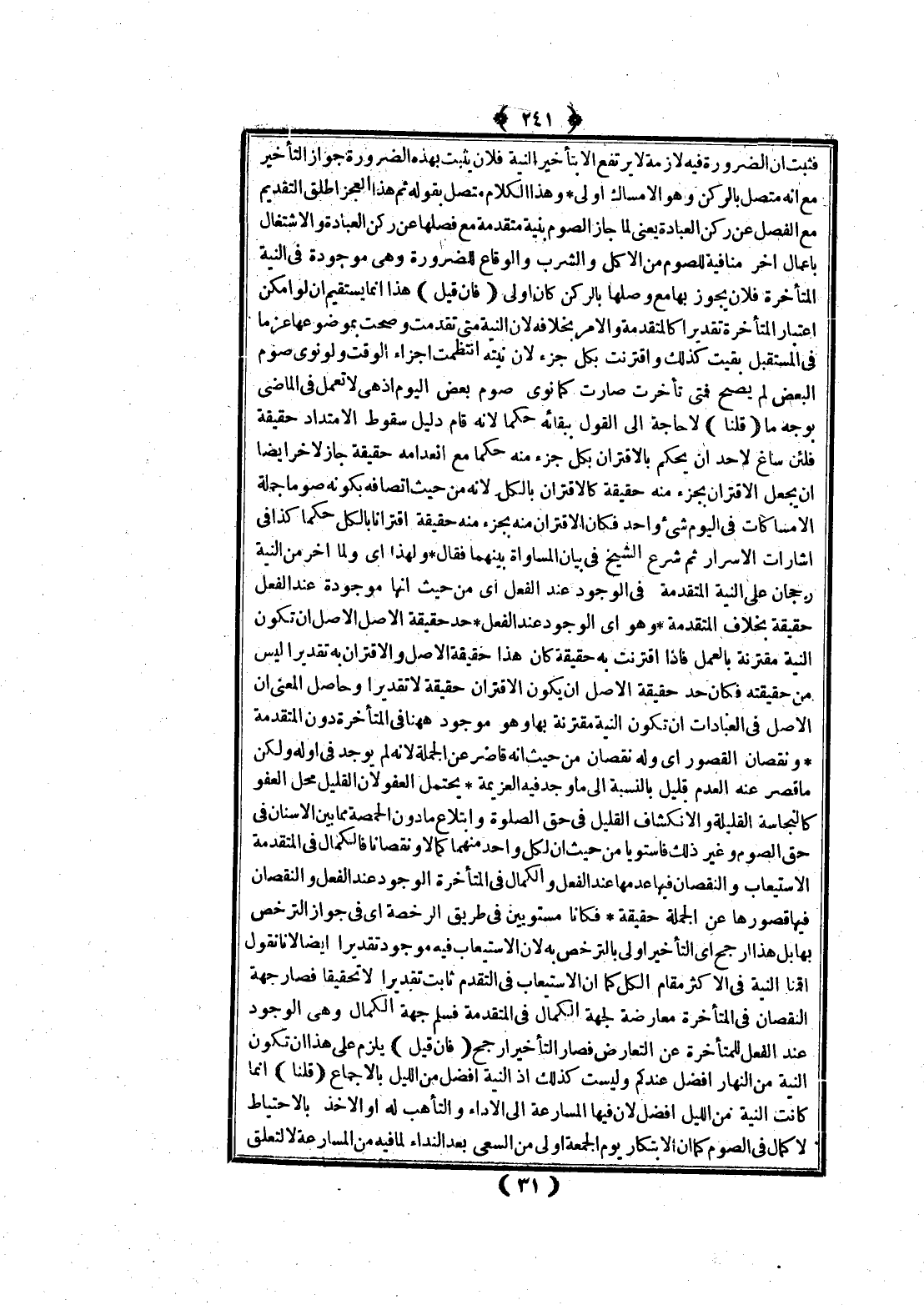 ثُمَّ شَرَعَ الشَّيْخُ فِي بَيَانِ الْمُسَاوَاةِ بَيْنَهُمَا فَقَالَ وَلِهَذَا أَيْ وَلِمَا أُخِّرَ مِنْ النِّيَّةِ رُجْحَانٌ عَلَى النِّيَّةِ الْمُتَقَدِّمَةِ فِي الْوُجُودِ عِنْدَ الْفِعْلِ أَيْ مِنْ حَيْثُ إنَّهَا مَوْجُودَةٌ عِنْدَ الْفِعْلِ حَقِيقَةً بِخِلَافِ الْمُتَقَدِّمَةِ وَهُوَ أَيْ الْوُجُودُ عِنْدَ الْفِعْلِ حَدُّ حَقِيقَةِ الْأَصْلِ أَنْ تَكُونَ النِّيَّةُ مُقْتَرِنَةً بِالْعَمَلِ فَإِذَا اقْتَرَنَتْ بِهِ حَقِيقَةً كَانَ هَذَا حَقِيقَةَ الْأَصْلِ وَالِاقْتِرَانُ بِهِ تَقْدِيرًا لَيْسَ مِنْ حَقِيقَتِهِ فَكَانَ حَدُّ حَقِيقَةِ الْأَصْلِ أَنْ يَكُونَ الِاقْتِرَانُ حَقِيقَةً لَا تَقْدِيرًا وَحَاصِلُ الْمَعْنَى أَنَّ الْأَصْلَ فِي الْعِبَادَاتِ أَنْ تَكُونَ النِّيَّةُ مُقْتَرِنَةً بِهَا وَهُوَ مَوْجُودٌ هَهُنَا فِي الْمُتَأَخِّرَةِ دُونَ الْمُتَقَدِّمَةِ وَنُقْصَانُ الْقُصُورِ أَيْ وَلَهُ نُقْصَانٌ مِنْ حَيْثُ إنَّهُ قَاصِرٌ عَلَى الْجُمْلَةِ لِأَنَّهُ لَمْ يُوجَدْ فِي أَوَّلِهِ وَلَكِنَّ مَا قَصُرَ عَنْهُ الْعَدَمُ قَلِيلٌ بِالنِّسْبَةِ إلَى مَا وُجِدَ فِيهِ الْعَزِيمَةُ يَحْتَمِلُ الْعَفْوَ لِأَنَّ الْقَلِيلَ مَحَلُّ الْعَفْوِ كَالنَّجَاسَةِ الْقَلِيلَةِ وَالِانْكِشَافِ الْقَلِيلِ فِي حَقِّ الصَّلَاةِ وَابْتِلَاعِ مَا دُونَ الْحِمَّصَةِ مِمَّا بَيْنَ الْأَسْنَانِ فِي حَقِّ الصَّوْمِ وَغَيْرِ ذَلِكَ فَاسْتَوَيَا مِنْ حَيْثُ إنَّ لِكُلِّ وَاحِدٍ مِنْهُمَا كَمَالًا وَنُقْصَانًا فَالْكَمَالُ فِي الْمُتَقَدِّمَةِ الِاسْتِيعَابُ وَالنُّقْصَانُ فِيهَا عَدَمُهَا عِنْدَ الْفِعْلِ وَالْكَمَالُ فِي الْمُتَأَخِّرَةِ الْوُجُودُ عِنْدَ الْفِعْلِ وَالنُّقْصَانُ فِيهَا قُصُورُهَا عَنْ الْجُمْلَةِ حَقِيقَةً فَكَانَا مُسْتَوِيَيْنِ فِي طَرِيقِ الرُّخْصَةِ أَيْ فِي جَوَازِ التَّرَخُّصِ بِهَا بَلْ هَذَا رَاجِحٌ أَيْ التَّأْخِيرُ أَوْلَى بِالتَّرَخُّصِ بِهِ لِأَنَّ الِاسْتِيعَابَ فِيهِ مَوْجُودٌ تَقْدِيرًا أَيْضًا لِأَنَّا نَقُولُ أَقَمْنَا النِّيَّةَ فِي الْأَكْثَرِ مُقَامَ الْكُلِّ كَمَا أَنَّ الِاسْتِيعَابَ ثَابِتٌ تَقْدِيرًا لَا تَحْقِيقًا فَصَارَ جِهَةُ النُّقْصَانِ فِي الْمُتَأَخِّرَةِ مُعَارِضَةً لِجِهَةِ الْكَمَالِ فِي الْمُتَقَدِّمَةِ فَسَلَّمَ جِهَةَ الْكَمَالِ وَهِيَ الْوُجُودُ عِنْدَ الْفِعْلِ لِلْمُتَأَخِّرَةِ عَنْ التَّعَارُضِ فَصَارَ التَّأْخِيرُ أَرْجَحَ.