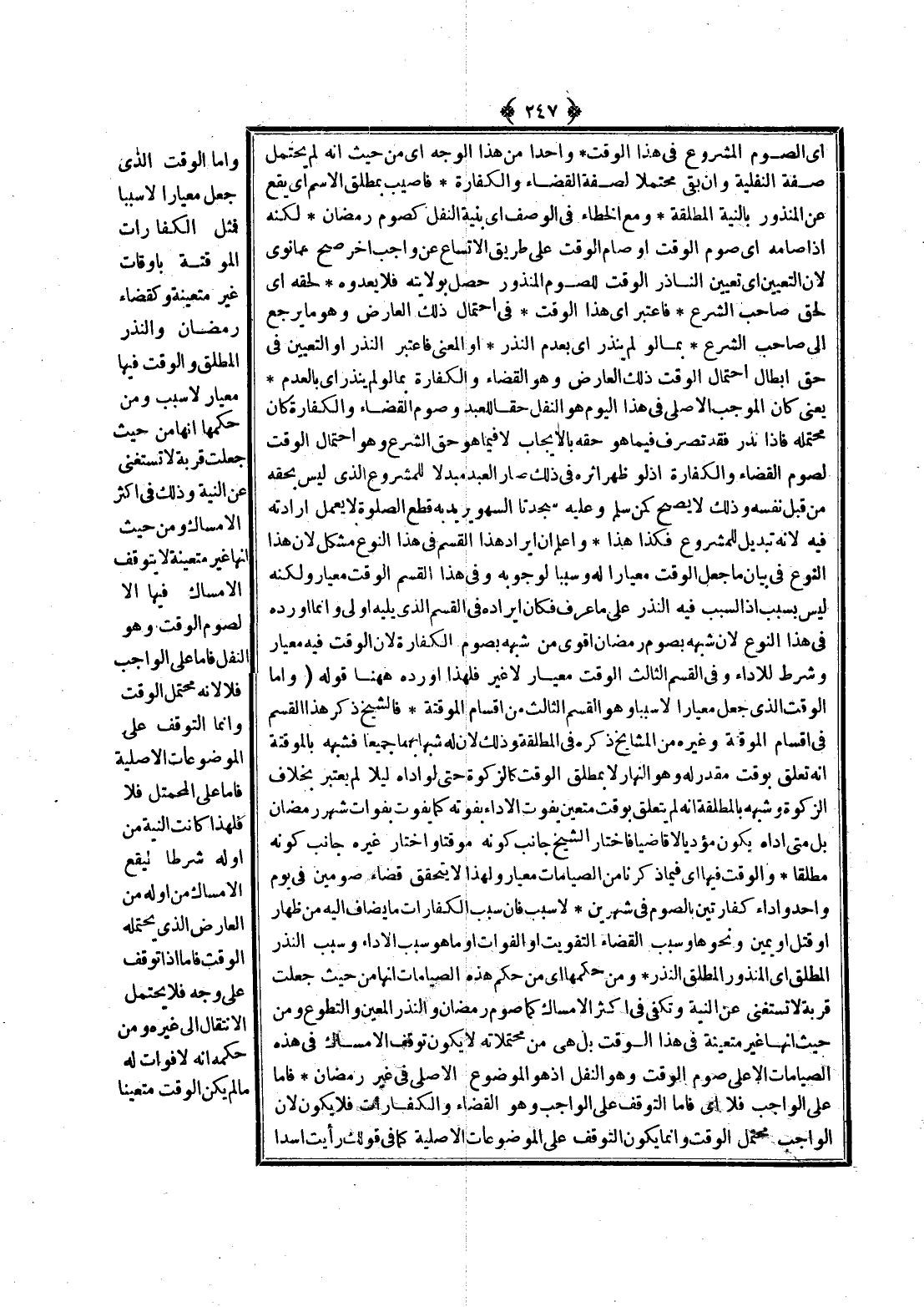 وَأَمَّا الْوَقْتُ الَّذِي جُعِلَ مِعْيَارًا لَا سَبَبًا فَمِثْلُ الْكَفَّارَاتِ الْمُؤَقَّتَةِ بِأَوْقَاتٍ غَيْرِ مُتَعَيَّنَةٍ وَكَقَضَاءِ رَمَضَانَ وَالنَّذْرِ الْمُطْلَقِ، وَالْوَقْتُ فِيهَا مِعْيَارٌ لَا سَبَبٌ وَمِنْ حُكْمِهَا أَنَّهَا مِنْ حَيْثُ جُعِلَتْ قُرْبَةً لَا تَسْتَغْنِي عَنْ النِّيَّةِ وَذَلِكَ فِي أَكْثَرِ الْإِمْسَاكِ وَمِنْ حَيْثُ إنَّهَا غَيْرُ مُتَعَيَّنَةٍ لَا يَتَوَقَّفُ الْإِمْسَاكُ فِيهَا إلَّا لِصَوْمِ الْوَقْتِ وَهُوَ النَّفَلُ فَأَمَّا عَلَى الْوَاجِبِ فَلَا لِأَنَّهُ مُحْتَمَلُ الْوَقْتِ وَإِنَّمَا التَّوَقُّفُ عَلَى الْمَوْضُوعَاتِ الْأَصْلِيَّةِ فَأَمَّا عَلَى الْمُحْتَمَلِ فَلَا فَلِهَذَا كَانَتْ النِّيَّةُ مِنْ أَوَّلِهِ شَرْطًا لِيَقَعَ الْإِمْسَاكُ مِنْ أَوَّلِهِ مِنْ الْعَارِضِ الَّذِي يَحْتَمِلُهُ الْوَقْتُ فَأَمَّا إذَا تَوَقَّفَ عَلَى وَجْهٍ فَلَا يُحْتَمَلُ الِانْتِقَالُ إلَى غَيْرِهِ وَمِنْ حُكْمِهِ أَنَّهُ لَا فَوَاتَ لَهُ مَا لَمْ يَكُنْ الْوَقْتُ مُتَعَيَّنًا.