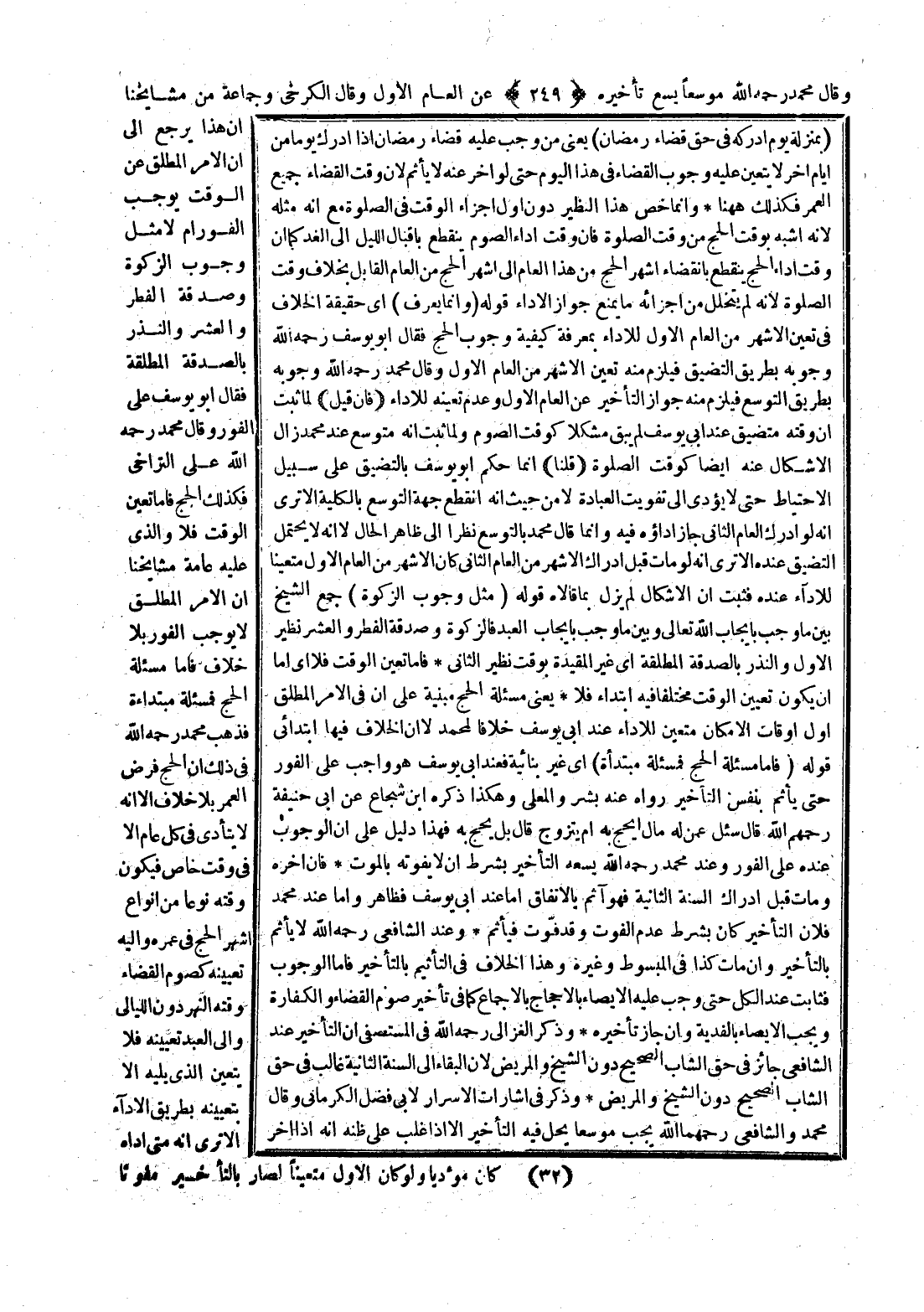 مُحَمَّدٌ - رَحِمَهُ اللَّهُ - مُوَسَّعًا يَسَعُ تَأْخِيرَهُ عَنْ الْعَامِ الْأَوَّلِ وَقَالَ الْكَرْخِيُّ وَجَمَاعَةٌ مِنْ مَشَايِخِنَا إنَّ هَذَا يَرْجِعُ إلَى أَنَّ الْأَمْرَ الْمُطْلَقَ عَنْ الْوَقْتِ يُوجِبُ الْفَوْرَ أَمْ لَا مِثْلَ وُجُوبِ الزَّكَاةِ وَصَدَقَةِ الْفِطْرِ وَالْعُشْرِ وَالنَّذْرِ بِالصَّدَقَةِ الْمُطْلَقَةِ فَقَالَ أَبُو يُوسُفَ عَلَى الْفَوْرِ وَقَالَ مُحَمَّدٌ - رَحِمَهُ اللَّهُ - عَلَى التَّرَاخِي فَكَذَلِكَ الْحَجُّ فَأَمَّا تَعَيُّنُ الْوَقْتِ فَلَا.