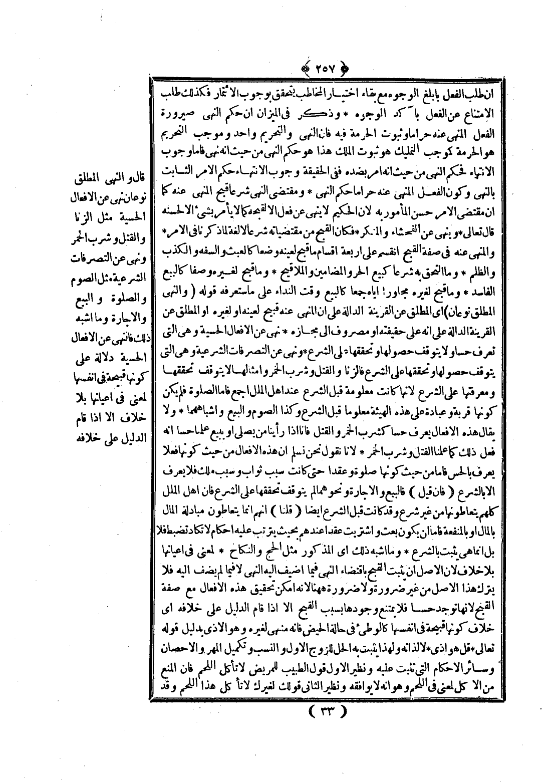 ـــــــــــــــــــــــــــــQأَنَّ طَلَبَ الْفِعْلِ بِأَبْلَغِ الْوُجُوهِ مَعَ بَقَاءِ اخْتِيَارِ الْمُخَاطَبِ يَتَحَقَّقُ بِوُجُوبِ الِائْتِمَارِ فَكَذَلِكَ طَلَبُ الِامْتِنَاعِ عَنْ الْفِعْلِ بِآكَدِ الْوُجُوهِ وَذُكِرَ فِي الْمِيزَانِ أَنَّ حُكْمَ النَّهْيِ صَيْرُورَةُ الْفِعْلِ الْمَنْهِيِّ عَنْهُ حَرَامًا وَثُبُوتُ الْحُرْمَةِ فِيهِ فَإِنَّ النَّهْيَ وَالتَّحْرِيمَ وَاحِدٌ وَمُوجِبُ التَّحْرِيمِ هُوَ الْحُرْمَةُ كَمُوجِبِ التَّمْلِيكِ هُوَ ثُبُوتُ الْمِلْكِ هَذَا هُوَ حُكْمُ النَّهْيِ مِنْ حَيْثُ إنَّهُ نَهْيٌ فَأَمَّا وُجُوبُ الِانْتِهَاءِ فَحُكْمُ النَّهْيِ مِنْ حَيْثُ إنَّهُ أَمْرٌ بِضِدِّهِ فَفِي الْحَقِيقَةِ وُجُوبُ الِانْتِهَاءِ حُكْمُ الْأَمْرِ الثَّابِتِ بِالنَّهْيِ وَكَوْنُ الْفِعْلِ الْمَنْهِيِّ عَنْهُ حَرَامًا حُكْمُ النَّهْيِ وَمُقْتَضَى النَّهْيِ شَرْعًا قُبْحُ الْمَنْهِيِّ عَنْهُ كَمَا أَنَّ مُقْتَضَى الْأَمْرِ حُسْنُ الْمَأْمُورِ بِهِ لِأَنَّ الْحَكِيمَ لَا يَنْهَى عَنْ فِعْلٍ إلَّا لِقُبْحِهِ كَمَا لَا يَأْمُرُ بِشَيْءٍ إلَّا لِحُسْنِهِ قَالَ تَعَالَى {وَيَنْهَى عَنِ الْفَحْشَاءِ وَالْمُنْكَرِ} [النحل: 90] فَكَانَ الْقُبْحُ مِنْ مُقْتَضَيَاتِهِ شَرْعًا لَا لُغَةً لِمَا ذَكَرْنَا فِي الْأَمْرِ وَالْمَنْهِيُّ عَنْهُ فِي صِفَةِ الْقُبْحِ انْقَسَمَ عَلَى أَرْبَعَةِ أَقْسَامٍ مَا قَبُحَ لِعَيْنِهِ وَضْعًا كَالْعَبَثِ وَالسَّفَهِ وَالْكَذِبِ وَالظُّلْمِ وَمَا الْتَحَقَ بِهِ شَرْعًا كَبَيْعِ الْحُرِّ وَالْمَضَامِينِ وَالْمَلَاقِيحِ وَمَا قَبُحَ لِغَيْرِهِ وَصْفًا كَالْبَيْعِ الْفَاسِدِ وَمَا قَبُحَ لِغَيْرِهِ مُجَاوِرًا إيَّاهُ جَمْعًا كَالْبَيْعِ وَقْتَ النِّدَاءِ عَلَى مَا سَتَعْرِفُهُ.