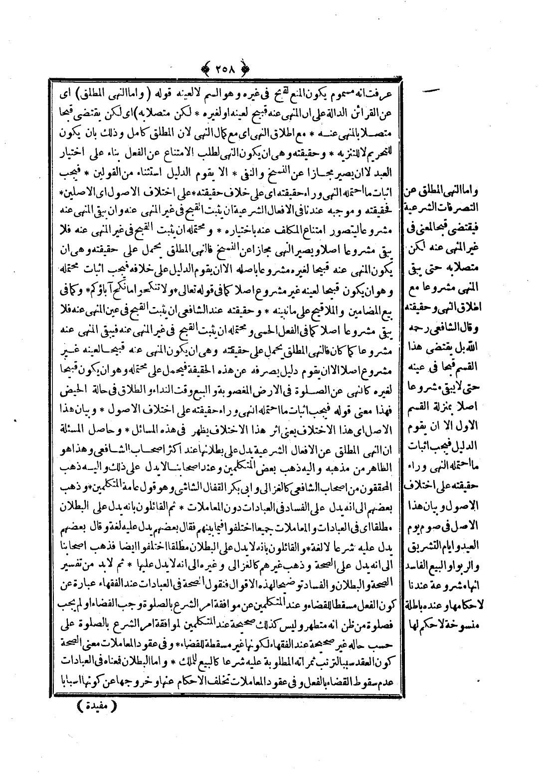 وَأَمَّا النَّهْيُ الْمُطْلَقُ عَنْ التَّصَرُّفَاتِ الشَّرْعِيَّةِ فَيَقْتَضِي قُبْحًا لِمَعْنًى فِي غَيْرِ الْمَنْهِيِّ عَنْهُ لَكِنْ مُتَّصِلًا بِهِ حَتَّى يَبْقَى الْمَنْهِيُّ مَشْرُوعًا مَعَ إطْلَاقِ النَّهْيِ وَحَقِيقَتِهِ وَقَالَ الشَّافِعِيُّ - رَحِمَهُ اللَّهُ - بَلْ يَقْتَضِي هَذَا الْقِسْمُ قُبْحًا فِي عَيْنِهِ حَتَّى لَا يَبْقَى مَشْرُوعًا أَصْلًا بِمَنْزِلَةِ الْقِسْمِ الْأَوَّلِ إلَّا أَنْ يَقُومَ الدَّلِيلُ فَيَجِبُ إثْبَاتُ مَا احْتَمَلَهُ النَّهْيُ وَرَاءَ حَقِيقَتِهِ عَلَى اخْتِلَافِ الْأُصُولِ وَبَيَانِ هَذَا الْأَصْلِ فِي صَوْمِ يَوْمِ الْعِيدِ وَأَيَّامِ التَّشْرِيقِ وَالرِّبَا وَالْبَيْعِ الْفَاسِدِ أَنَّهَا مَشْرُوعَةٌ عِنْدَنَا لِأَحْكَامِهَا وَعِنْدَهُ بَاطِلَةٌ مَنْسُوخَةٌ لَا حُكْمَ لَهَا