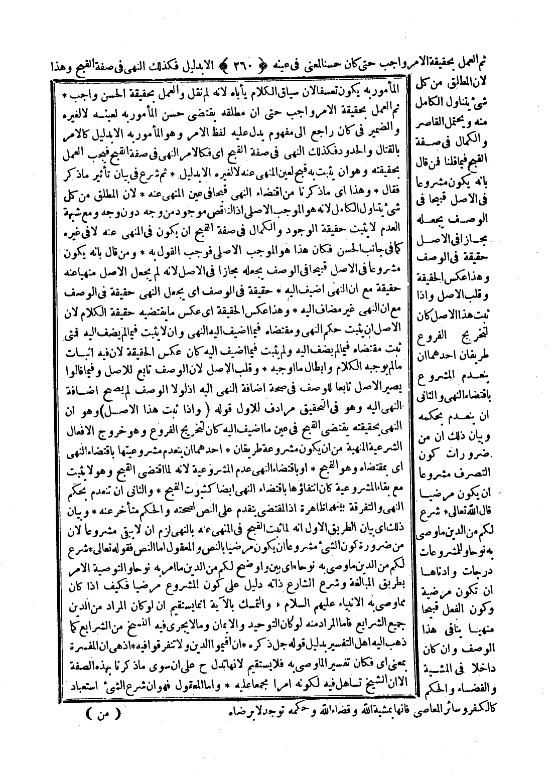 ثُمَّ الْعَمَلُ بِحَقِيقَةِ الْأَمْرِ وَاجِبٌ حَتَّى كَانَ حَسَنًا لِمَعْنًى فِي عَيْنِهِ إلَّا بِدَلِيلٍ فَكَذَلِكَ النَّهْيُ فِي صِفَةِ الْقُبْحِ وَهَذَا لِأَنَّ الْمُطْلَقَ مِنْ كُلِّ شَيْءٍ يَتَنَاوَلُ الْكَامِلَ مِنْهُ وَيَحْتَمِلُ الْقَاصِرَ وَالْكَمَالُ فِي صِفَةِ الْقُبْحِ فِيمَا قُلْنَا فَمَنْ قَالَ بِأَنَّهُ يَكُونُ مَشْرُوعًا فِي الْأَصْلِ قَبِيحًا فِي الْوَصْفِ يَجْعَلُهُ مَجَازًا فِي الْأَصْلِ حَقِيقَةً فِي الْوَصْفِ وَهَذَا عَكْسُ الْحَقِيقَةِ وَقَلْبُ الْأَصْلِ وَإِذَا ثَبَتَ هَذَا الْأَصْلُ كَانَ لِتَخْرِيجِ الْفُرُوعِ طَرِيقَانِ أَحَدُهُمَا أَنْ يَنْعَدِمَ الْمَشْرُوعُ بِاقْتِضَاءِ النَّهْيِ وَالثَّانِي أَنْ يَنْعَدِمَ بِحُكْمِهِ وَبَيَانُ ذَلِكَ أَنَّ مِنْ ضَرُورَاتِ كَوْنِ التَّصَرُّفِ مَشْرُوعًا أَنْ يَكُونَ مَرَضِيًّا قَالَ اللَّهُ تَعَالَى {شَرَعَ لَكُمْ مِنَ الدِّينِ مَا وَصَّى بِهِ نُوحًا} [الشورى: 13] وَلِلْمَشْرُوعَاتِ دَرَجَاتٌ وَأَدْنَاهَا أَنْ تَكُونَ مَرْضِيَّةً وَكَوْنُ الْفِعْلِ قَبِيحًا مَنْهِيًّا يُنَافِي هَذَا الْوَصْفَ وَإِنْ كَانَ دَاخِلًا فِي الْمَشِيئَةِ وَالْقَضَاءِ وَالْحُكْمِ كَالْكُفْرِ، وَسَائِرِ الْمَعَاصِي فَإِنَّهَا بِمَشِيئَةِ اللَّهِ وَقَضَاءِ اللَّهِ وَحِكْمَتِهِ تُوجَدُ لَا بِرِضَاهُ