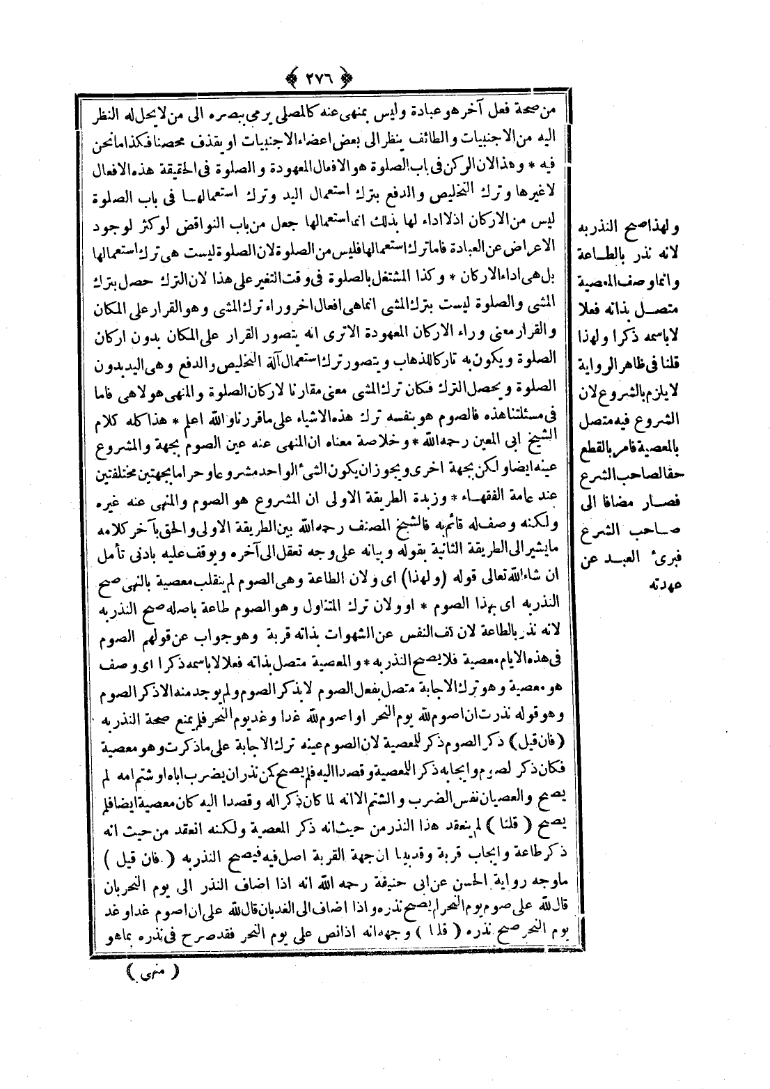 وَكَذَا الْمُشْتَغِلُ بِالصَّلَاةِ فِي وَقْتِ التَّغَيُّرِ عَلَى هَذَا لِأَنَّ التَّرْكَ حَصَلَ بِتَرْكِ الْمَشْيِ، وَالصَّلَاةُ لَيْسَتْ بِتَرْكِ الْمَشْيِ إنَّمَا هِيَ أَفْعَالٌ أُخَرُ وَرَاءَ تَرْكِ الْمَشْيِ وَهُوَ الْقَرَارُ عَلَى الْمَكَانِ وَالْقَرَارُ مَعْنًى وَرَاءَ الْأَرْكَانِ الْمَعْهُودَةِ، أَلَا تَرَى أَنَّهُ يُتَصَوَّرُ الْقَرَارُ عَلَى الْمَكَانِ بِدُونِ أَرْكَانِ الصَّلَاةِ وَيَكُونُ بِهِ تَارِكًا لِلذَّهَابِ وَيُتَصَوَّرُ تَرْكُ اسْتِعْمَالِ آلَةِ التَّخْلِيصِ وَالدَّفْعِ وَهِيَ الْيَدُ بِدُونِ الصَّلَاةِ وَيَحْصُلُ التَّرْكُ فَكَانَ تَرْكُ الْمَشْيِ مَعْنًى مُقَارِنًا لِأَرْكَانِ الصَّلَاةِ وَالْمَنْهِيُّ هُوَ لَا هِيَ، فَأَمَّا فِي مَسْأَلَتِنَا هَذِهِ فَالصَّوْمُ هُوَ بِنَفْسِهِ تَرْكُ هَذِهِ الْأَشْيَاءِ عَلَى مَا قَرَّرْنَا وَاَللَّهُ أَعْلَمُ هَذَا كُلُّهُ كَلَامُ الشَّيْخِ أَبِي الْمُعِينِ - رَحِمَهُ اللَّهُ - وَخُلَاصَةُ مَعْنَاهُ أَنَّ الْمَنْهِيَّ عَنْهُ عَيْنُ الصَّوْمِ بِجِهَةٍ، وَالْمَشْرُوعَ عَيْنُهُ أَيْضًا وَلَكِنْ بِجِهَةٍ أُخْرَى وَيَجُوزُ أَنْ يَكُونَ الشَّيْءُ الْوَاحِدُ مَشْرُوعًا حَرَامًا بِجِهَتَيْنِ مُخْتَلِفَتَيْنِ عِنْدَ عَامَّةِ الْفُقَهَاءِ وَزُبْدَةُ الطَّرِيقَةِ الْأُولَى أَنَّ الْمَشْرُوعَ هُوَ الصَّوْمُ وَالْمَنْهِيَّ عَنْهُ غَيْرُهُ وَلَكِنَّهُ وَصْفٌ لَهُ قَائِمٌ بِهِ فَالشَّيْخُ الْمُصَنِّفُ - رَحِمَهُ اللَّهُ - بَيَّنَ الطَّرِيقَةَ الْأُولَى وَأَلْحَقَ بِآخِرِ كَلَامِهِ مَا يُشِيرُ إلَى الطَّرِيقَةِ الثَّانِيَةِ بِقَوْلِهِ وَبَيَانُهُ عَلَى وَجْهِ تَعَقُّلٍ إلَى آخِرِهِ وَيُوقَفُ عَلَيْهِ بِأَدْنَى تَأَمُّلٍ إنْ شَاءَ اللَّهُ تَعَالَى.