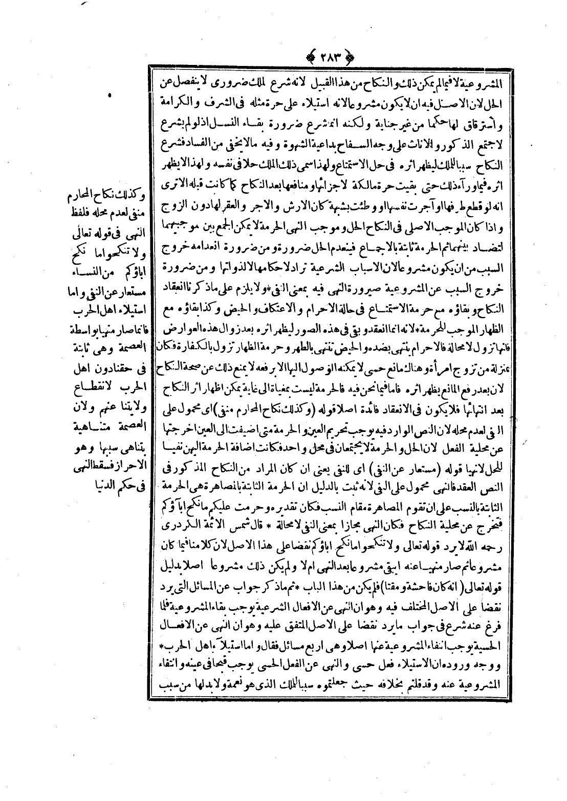 ـــــــــــــــــــــــــــــQالْمَشْرُوعِيَّةِ لَا فِيمَا لَمْ يُمْكِنْ ذَلِكَ وَالنِّكَاحُ مِنْ هَذَا الْقَبِيلِ لِأَنَّهُ شُرِعَ لِمِلْكٍ ضَرُورِيٍّ لَا يَنْفَصِلُ عَنْ الْحَلِّ لِأَنَّ الْأَصْلَ فِيهِ أَنْ لَا يَكُونَ مَشْرُوعًا لِأَنَّهُ اسْتِيلَاءٌ عَلَى حُرَّةٍ مِثْلِهِ فِي الشَّرَفِ وَالْكَرَامَةِ وَاسْتِرْقَاقٌ لَهَا حُكْمًا مِنْ غَيْرِ جِنَايَةٍ وَلَكِنَّهُ إنَّمَا شُرِعَ ضَرُورَةَ بَقَاءِ النَّسْلِ إذَا لَوْ لَمْ يُشْرَعْ لَاجْتَمَعَ الذُّكُورُ وَالْإِنَاثُ عَلَى وَجْهِ السِّفَاحِ بِدَاعِيَةِ الشَّهْوَةِ وَفِيهِ مَا لَا يَخْفَى مِنْ الْفَسَادِ فَشُرِعَ النِّكَاحُ سَبَبًا لِلْمِلْكِ لِيَظْهَرَ أَثَرُهُ فِي حِلِّ الِاسْتِمْتَاعِ.