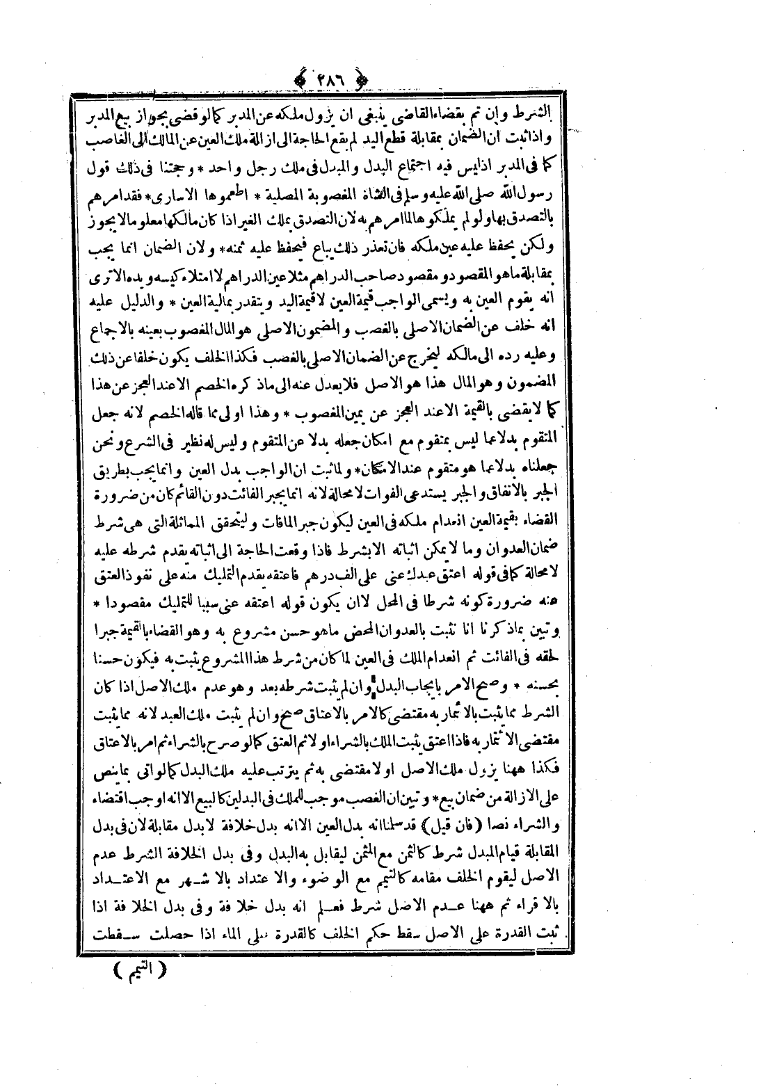 ـــــــــــــــــــــــــــــQالشَّرْطُ وَإِنْ تَمَّ بِقَضَاءٍ بِالْقَاضِي يَنْبَغِي أَنْ يَزُولَ مِلْكُهُ عَنْ الْمُدَبَّرِ كَمَا لَوْ قَضَى بِجَوَازِ بَيْعِ الْمُدَبَّرِ وَإِذَا ثَبَتَ أَنَّ الضَّمَانَ بِمُقَابَلَةِ قَطْعِ الْيَدِ لَمْ تَقَعْ الْحَاجَةُ إلَى إزَالَةِ مِلْكِ الْعَيْنِ عَنْ الْمَالِكِ إلَى الْغَاصِبِ كَمَا فِي الْمُدَبَّرِ إذَا لَيْسَ فِيهِ اجْتِمَاعُ الْبَدَلِ وَالْمُبْدَلِ فِي مِلْكِ رَجُلٍ وَاحِدٍ وَحُجَّتُنَا فِي ذَلِكَ «قَوْلُ رَسُولِ اللَّهِ - صَلَّى اللَّهُ عَلَيْهِ وَسَلَّمَ - فِي الشَّاةِ الْمَغْصُوبَةِ الْمَصْلِيَّةِ أَطْعِمُوهَا الْأَسَارَى» فَقَدْ أَمَرَهُمْ بِالتَّصَدُّقِ بِهَا وَلَوْ لَمْ يَمْلِكُوهَا لَمَا أَمَرَهُمْ بِهِ لِأَنَّ التَّصَدُّقَ بِمِلْكِ الْغَيْرِ إذَا كَانَ مَالِكُهَا مَعْلُومًا لَا يَجُوزُ وَلَكِنْ يَحْفَظُ عَلَيْهِ عَيْنَ مِلْكِهِ فَإِنْ تَعَذَّرَ ذَلِكَ يُبَاعُ فَيُحْفَظُ عَلَيْهِ ثَمَنُهُ وَلِأَنَّ الضَّمَانَ إنَّمَا يَجِبُ بِمُقَابَلَةِ مَا هُوَ الْمَقْصُودُ وَمَقْصُودُ صَاحِبِ الدَّرَاهِمِ مَثَلًا عَيْنُ الدَّرَاهِمِ لَا امْتِلَاءُ كِيسِهِ وَيَدِهِ أَلَا تَرَى أَنَّهُ تُقَوَّمُ الْعَيْنُ بِهِ وَيُسَمَّى الْوَاجِبُ قِيمَةَ الْعَيْنِ لَا قِيمَةَ الْيَدِ وَيَتَقَدَّرُ بِمَالِيَّةِ الْعَيْنِ.