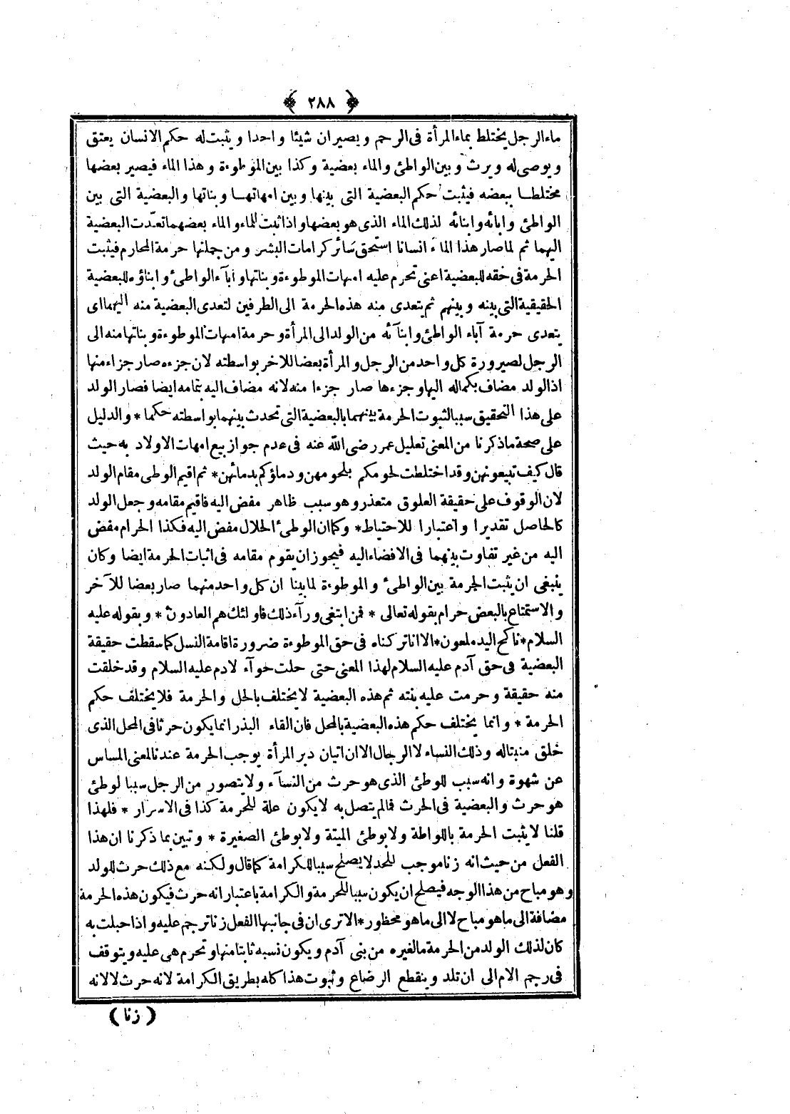 ـــــــــــــــــــــــــــــQمَاءَ الرَّجُلِ يَخْتَلِطُ بِمَاءِ الْمَرْأَةِ فِي الرَّحِمِ وَيَصِيرَانِ شَيْئًا وَاحِدًا وَيَثْبُتُ لَهُ حُكْمُ الْإِنْسَانِ يَعْتِقُ وَيُوصَى لَهُ وَيَرِثُ وَبَيْنَ الْوَاطِئِ وَالْمَاءِ بَعْضِيَّةٌ وَكَذَا بَيْنَ الْمَوْطُوءَةِ وَهَذَا الْمَاءِ فَيَصِيرُ بَعْضُهَا مُخْتَلِطًا بِبَعْضِهِ فَيَثْبُتُ حُكْمُ الْبَعْضِيَّةِ الَّتِي بَيْنَهَا وَبَيْنَ أُمَّهَاتِهَا وَبَنَاتِهَا، وَالْبَعْضِيَّةُ الَّتِي بَيْنَ الْوَاطِئِ وَآبَائِهِ وَأَبْنَائِهِ لِذَلِكَ الْمَاءِ الَّذِي هُوَ بَعْضُهَا وَإِذَا ثَبَتَ لِلْمَاءِ وَالْمَاءُ بَعْضُهُمَا تَعَدَّتْ الْبَعْضِيَّةُ إلَيْهِمَا ثُمَّ لَمَّا صَارَ هَذَا الْمَاءُ إنْسَانًا اسْتَحَقَّ سَائِرَ كَرَامَاتِ الْبَشَرِ وَمِنْ جُمْلَتِهَا حُرْمَةُ الْمَحَارِمِ فَيَثْبُتُ الْحُرْمَةُ فِي حَقِّهِ لِلْبَعْضِيَّةِ أَعْنِي تَحْرُمُ عَلَيْهِ أُمَّهَاتُ الْمَوْطُوءَةِ وَبَنَاتُهَا وَأَبَاءُ الْوَاطِئِ وَأَبْنَاؤُهُ لِلْبَعْضِيَّةِ الْحَقِيقِيَّةِ الَّتِي بَيْنَهُ وَبَيْنَهُمْ ثُمَّ يَتَعَدَّى مِنْهُ هَذِهِ الْحُرْمَةَ إلَى الطَّرَفَيْنِ لِتَعَدِّي الْبَعْضِيَّةِ مِنْهُ إلَيْهِمَا أَيْ يَتَعَدَّى حُرْمَةَ آبَاءِ الْوَاطِئِ وَأَبْنَائِهِ مِنْ الْوَلَدِ إلَى الْمَرْأَةِ وَحُرْمَةَ أُمَّهَاتِ الْمَوْطُوءَةِ وَبَنَاتِهَا مِنْهُ إلَى الرَّجُلِ لِصَيْرُورَةِ كُلِّ وَاحِدٍ مِنْ الرَّجُلِ وَالْمَرْأَةِ بَعْضًا لِلْآخَرِ بِوَاسِطَتِهِ لِأَنَّ جُزْأَهُ صَارَ جُزْءًا مِنْهَا إذْ الْوَلَدُ مُضَافٌ بِكَمَالِهِ إلَيْهَا وَجُزْؤُهَا صَارَ جُزْءًا مِنْهُ لِأَنَّهُ مُضَافٌ إلَيْهِ بِتَمَامِهِ أَيْضًا فَصَارَ الْوَلَدُ عَلَى هَذَا التَّحْقِيقِ سَبَبًا لِثُبُوتِ الْحُرْمَةِ بَيْنَهُمَا بِالْبَعْضِيَّةِ الَّتِي تَحْدُثُ بَيْنَهُمَا بِوَاسِطَتِهِ حُكْمًا.