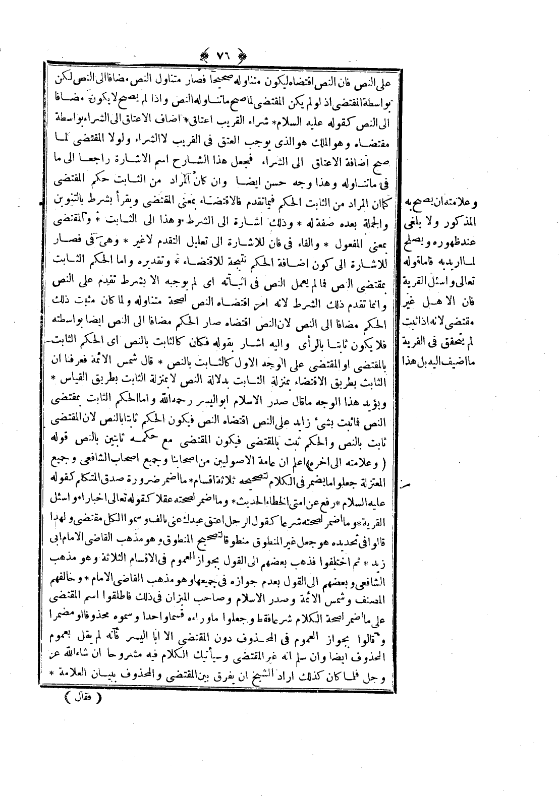وَخَالَفَهُمْ الْمُصَنِّفُ وَشَمْسُ الْأَئِمَّةِ وَصَدْرُ الْإِسْلَامِ وَصَاحِبُ الْمِيزَانِ فِي ذَلِكَ فَأَطْلَقُوا اسْمَ الْمُقْتَضَى عَلَى مَا أُضْمِرَ لِصِحَّةِ الْكَلَامِ شَرْعًا فَقَطْ وَجَعَلُوا مَا وَرَاءَهُ قِسْمًا وَاحِدًا وَسَمَّوْهُ مَحْذُوفًا أَوْ مُضْمَرًا وَقَالُوا: بِجَوَازِ الْعُمُومِ فِي الْمَحْذُوفِ دُونَ الْمُقْتَضَى إلَّا أَبَا الْيُسْرِ فَإِنَّهُ لَمْ يَقُلْ بِعُمُومِ الْمَحْذُوفِ أَيْضًا؛ وَإِنْ سَلَّمَ أَنَّهُ غَيْرُ الْمُقْتَضَى وَسَيَأْتِيك الْكَلَامُ فِيهِ مَشْرُوحًا إنْ شَاءَ اللَّهُ عَزَّ وَجَلَّ، فَلَمَّا كَانَ كَذَلِكَ أَرَادَ الشَّيْخُ أَنْ يُفَرِّقَ بَيْنَ الْمُقْتَضَى وَالْمَحْذُوفِ بِبَيَانِ الْعَلَامَةِ،