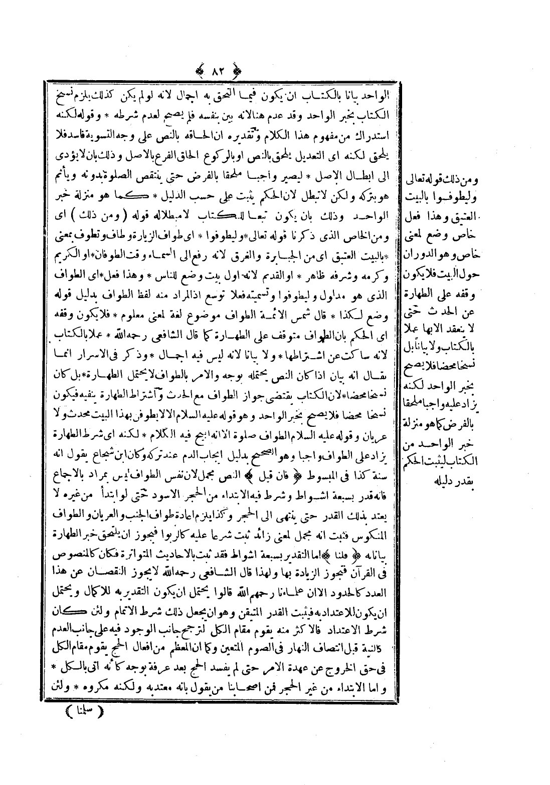 وَمِنْ ذَلِكَ قَوْله تَعَالَى {وَلْيَطَّوَّفُوا بِالْبَيْتِ الْعَتِيقِ} [الحج: 29] وَهَذَا فِعْلٌ خَاصٌّ وُضِعَ لِمَعْنًى خَاصٍّ، وَهُوَ الدَّوَرَانُ حَوْلَ الْبَيْتِ، فَلَا يَكُونُ وَقَفَهُ عَلَى الطَّهَارَةِ عَنْ الْحَدَثِ حَتَّى لَا يَنْعَقِدَ إلَّا بِهَا عَمَلًا بِالْكِتَابِ وَلَا بَيَانًا بَلْ نَسْخًا مَحْضًا فَلَا يَصِحُّ بِخَبَرِ الْوَاحِدِ لَكِنَّهُ يُزَادُ عَلَيْهِ وَاجِبًا مُلْحَقًا بِالْفَرْضِ كَمَا هُوَ مَنْزِلَةُ خَبَرِ الْوَاحِدِ مِنْ الْكِتَابِ لِيَثْبُتَ الْحُكْمُ بِقَدْرِ دَلِيلِهِ