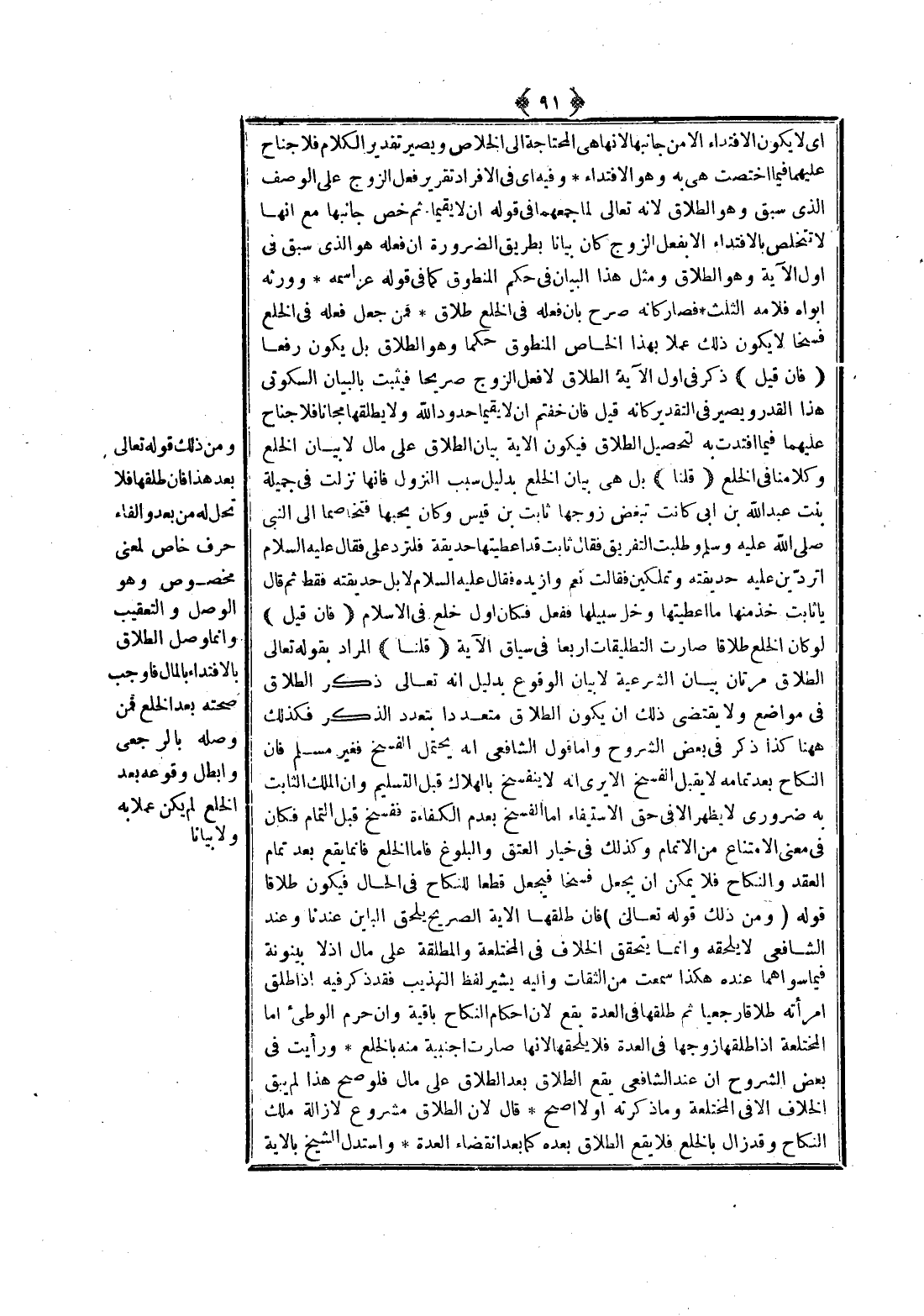 وَمِنْ ذَلِكَ قَوْله تَعَالَى بَعْدَ هَذَا {فَإِنْ طَلَّقَهَا فَلا تَحِلُّ لَهُ مِنْ بَعْدُ} [البقرة: 230] وَالْفَاءُ حَرْفٌ خَاصٌّ لِمَعْنًى مَخْصُوصٍ، وَهُوَ الْوَصْلُ وَالتَّعْقِيبُ؛ وَإِنَّمَا وَصَلَ الطَّلَاقَ بِالِافْتِدَاءِ بِالْمَالِ فَأَوْجَبَ صِحَّتَهُ بَعْدَ الْخُلْعِ فَمَنْ وَصَلَهُ بِالرَّجْعِيِّ وَأَبْطَلَ وُقُوعَهُ بَعْدَ الْخُلْعِ لَمْ يَكُنْ عَمَلًا بِهِ وَلَا بَيَانًا
