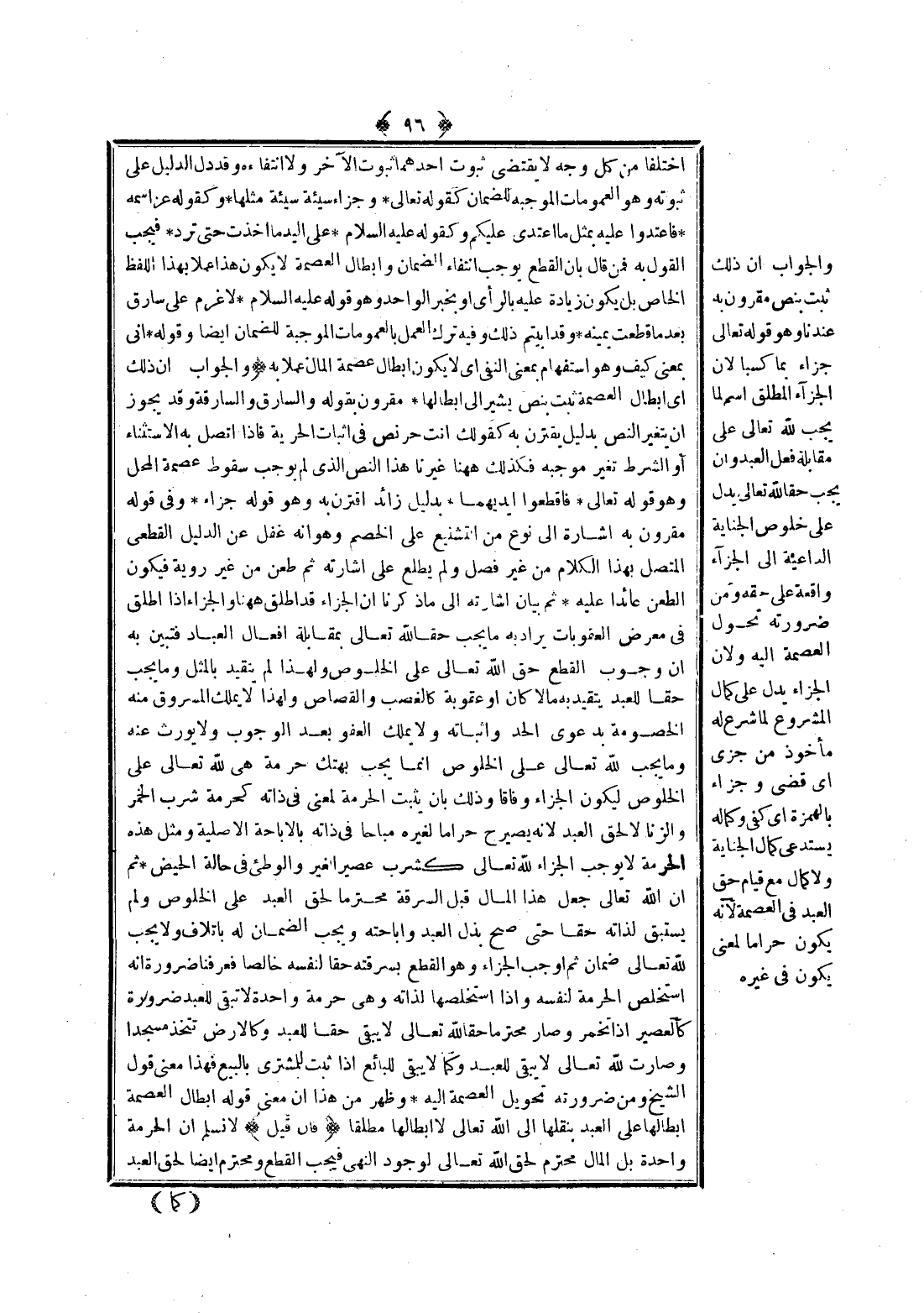 وَالْجَوَابُ أَنَّ ذَلِكَ ثَبَتَ بِنَصٍّ مَقْرُونٍ بِهِ عِنْدَنَا، وَهُوَ قَوْله تَعَالَى {جَزَاءً بِمَا كَسَبَا} [المائدة: 38] ؛ لِأَنَّ الْجَزَاءَ الْمُطْلَقَ اسْمٌ لِمَا يَجِبُ لِلَّهِ تَعَالَى عَلَى مُقَابَلَةِ فِعْلِ الْعَبْدِ؛ وَإِنْ يَجِبْ حَقًّا لِلَّهِ تَعَالَى يَدُلَّ عَلَى خُلُوصِ الْجِنَايَةِ الدَّاعِيَةِ إلَى الْجَزَاءِ وَاقِعَةٌ عَلَى حَقِّهِ وَمِنْ ضَرُورَتِهِ تَحَوُّلُ الْعِصْمَةِ إلَيْهِ؛ وَلِأَنَّ الْجَزَاءَ يَدُلُّ عَلَى كَمَالِ الْمَشْرُوعِ لِمَا شُرِعَ لَهُ مَأْخُوذٌ مِنْ جَزَى أَيْ قَضَى وَجَزَاءٌ بِالْهَمْزَةِ أَيْ كَفَى وَكَمَالُهُ يَسْتَدْعِي كَمَالَ الْجِنَايَةِ وَلَا كَمَالَ مَعَ قِيَامِ حَقِّ الْعَبْدِ فِي الْعِصْمَةِ؛ لِأَنَّهُ يَكُونُ حَرَامًا لِمَعْنًى يَكُونُ فِي غَيْرِهِ
