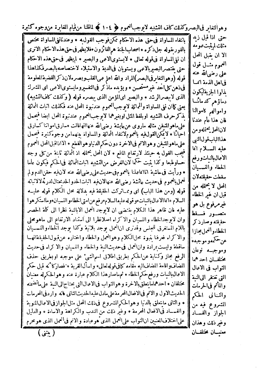 ـــــــــــــــــــــــــــــQبِانْتِفَاءِ الْمُسَاوَاةِ فِي حَقِّ هَذِهِ الْأَحْكَامِ مُمْكِنٌ فَوَجَبَ الْقَوْلُ بِهِ وَعِنْدَنَا نَفْيُ الْمُسَاوَاةِ مُخْتَصٌّ بِالْفَوْزِ بِقَوْلِهِ جَلَّ ذِكْرُهُ {أَصْحَابُ الْجَنَّةِ هُمُ الْفَائِزُونَ} [الحشر: 20] فَلَا يَظْهَرُ فِي حَقِّ هَذِهِ الْأَحْكَامِ أَلَا تَرَى أَنَّ نَفْيَ الْمُسَاوَاةِ فِي قَوْله تَعَالَى {وَمَا يَسْتَوِي الأَعْمَى وَالْبَصِيرُ} [غافر: 58] لَمْ يَظْهَرْ فِي حَقِّ هَذِهِ الْأَحْكَامِ حَتَّى يَقْتَصِرَ الْبَصِيرُ بِالْأَعْمَى وَيَسْتَوِيَانِ فِي الدِّيَةِ وَالِاسْتِيلَاءِ لِاخْتِصَاصِهِ بِالْبَصَرِ فَكَذَا هَذَا قَوْلُهُ (وَهُوَ التَّغَايُرُ فِي الْبَصَرِ) الْمُرَادُ وَاَللَّهُ أَعْلَمُ عَمَى الْقَلْبِ وَبَصَرُهُ لِأَنَّ ذِكْرَ الْقَضِيَّةِ الْمَعْلُومَةِ فِي ذِهْنِ كُلِّ أَحَدٍ غَيْرُ مُسْتَحْسَنٍ وَيُؤَيِّدُهُ مَا ذُكِرَ فِي التَّفْسِيرِ وَمَا يَسْتَوِي الْأَعْمَى أَيْ الْمُشْرِكُ الَّذِي لَا يُبْصِرُ الرُّشْدَ وَالْبَصِيرُ أَيْ الْمُؤْمِنُ الَّذِي يُبْصِرُهُ.