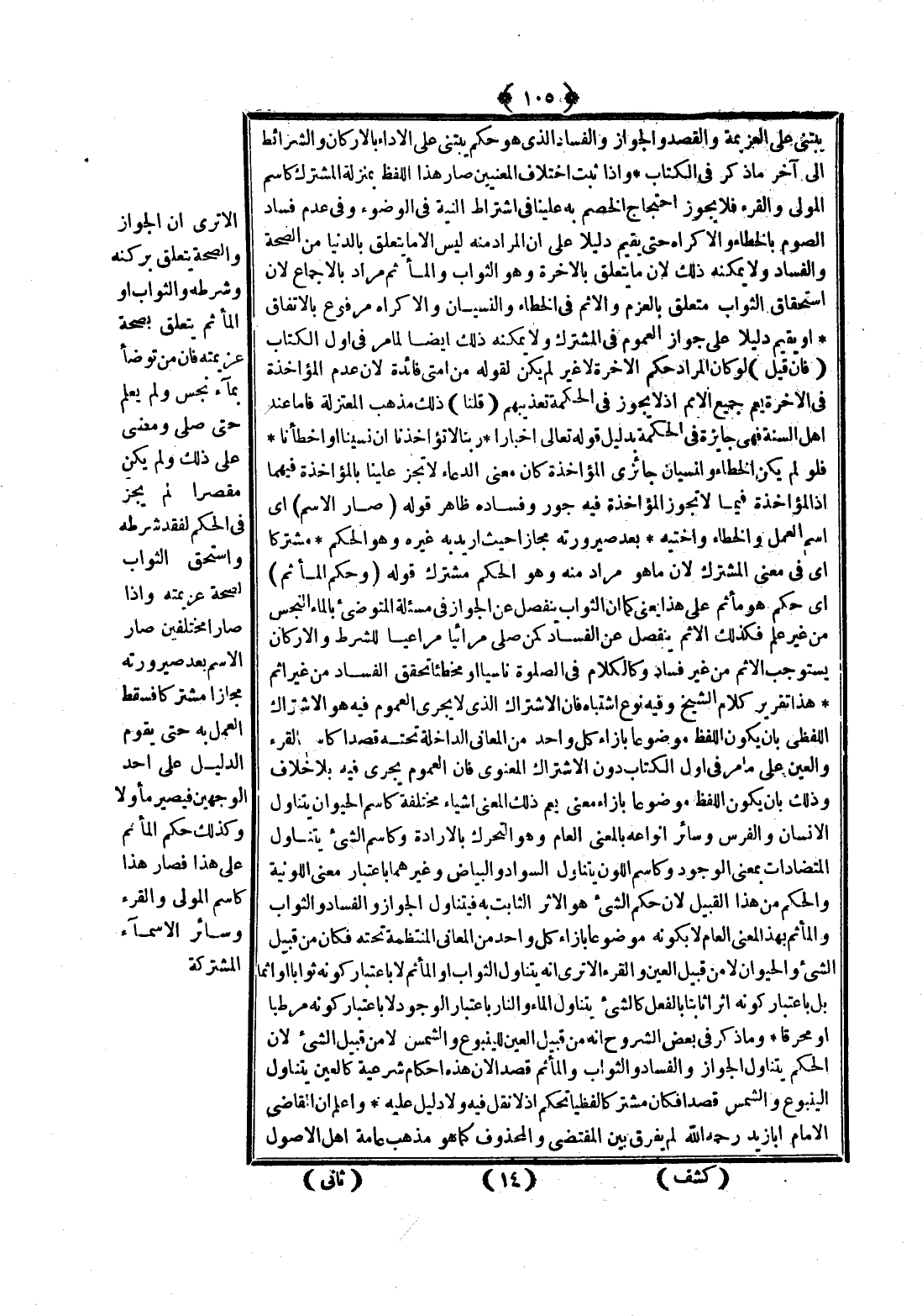 وَفَسَادُهُ ظَاهِرٌ قَوْلُهُ (صَارَ الِاسْمُ) أَيْ اسْمُ الْعَمَلِ وَالْخَطَأِ وَأُخْتَيْهِ بَعْدَ صَيْرُورَتِهِ مَجَازًا حَيْثُ أُرِيدَ بِهِ غَيْرُهُ وَهُوَ الْحُكْمُ مُشْتَرَكًا أَيْ فِي مَعْنَى الْمُشْتَرَكِ لِأَنَّ مَا هُوَ مُرَادٌ مِنْهُ وَهُوَ الْحُكْمُ مُشْتَرَكٌ قَوْلُهُ (وَحُكْمُ الْمَأْثَمِ) أَيْ حُكْمٌ هُوَ مَأْثَمٌ عَلَى هَذَا يَعْنِي كَمَا أَنَّ الثَّوَابَ يَنْفَصِلُ عَنْ الْجَوَازِ فِي مَسْأَلَةِ الْمُتَوَضِّئِ بِالْمَاءِ النَّجِسِ مِنْ غَيْرِ عِلْمٍ فَكَذَلِكَ الْإِثْمُ يَنْفَصِلُ عَنْ الْفَسَادِ كَمَنْ صَلَّى مُرَائِيًا مُرَاعِيًا لِلشُّرُوطِ وَالْأَرْكَانِ يَسْتَوْجِبُ الْإِثْمَ مِنْ غَيْرِ فَسَادٍ وَكَالْكَلَامِ فِي الصَّلَاةِ نَاسِيًا أَوْ مُخْطِئًا تَحَقَّقَ الْفَسَادُ مِنْ غَيْرِ إثْمٍ هَذَا تَقْرِيرُ كَلَامِ الشَّيْخِ وَفِيهِ نَوْعُ اشْتِبَاهٍ فَإِنَّ الِاشْتِرَاكَ الَّذِي لَا يَجْرِي الْعُمُومُ فِيهِ هُوَ الِاشْتِرَاكُ اللَّفْظِيُّ بِأَنْ يَكُونَ اللَّفْظُ مَوْضُوعًا بِإِزَاءِ كُلِّ وَاحِدٍ مِنْ الْمَعَانِي الدَّاخِلَةِ تَحْتَهُ قَصْدًا كَاسْمِ الْقُرْءِ وَالْعَيْنِ عَلَى مَا مَرَّ فِي أَوَّلِ الْكِتَابِ دُونَ الِاشْتِرَاكِ الْمَعْنَوِيِّ فَإِنَّ الْعُمُومَ يَجْرِي فِيهِ بِلَا خِلَافٍ وَذَلِكَ بِأَنْ يَكُونَ اللَّفْظُ مَوْضُوعًا بِإِزَاءِ مَعْنًى يَعُمُّ ذَلِكَ الْمَعْنَى أَشْيَاءَ مُخْتَلِفَةً كَاسْمِ الْحَيَوَانِ يَتَنَاوَلُ الْإِنْسَانَ وَالْفَرَسَ وَسَائِرَ أَنْوَاعِهِ بِالْمَعْنَى الْعَامِّ وَهُوَ التَّحَرُّكُ بِالْإِرَادَةِ وَكَاسْمِ الشَّيْءِ يَتَنَاوَلُ الْمُتَضَادَّاتِ بِمَعْنَى الْوُجُودِ وَكَاسْمِ اللَّوْنِ يَتَنَاوَلُ السَّوَادَ وَالْبَيَاضَ وَغَيْرَهُمَا بِاعْتِبَارِ مَعْنَى اللَّوْنِيَّةِ وَالْحُكْمُ مِنْ هَذَا الْقَبِيلِ لِأَنَّ حُكْمَ الشَّيْءِ هُوَ الْأَثَرُ الثَّابِتُ بِهِ فَيَتَنَاوَلُ الْجَوَازَ وَالْفَسَادَ وَالثَّوَابَ وَالْمَأْثَمَ بِهَذَا الْمَعْنَى الْعَامِّ لَا بِكَوْنِهِ مَوْضُوعًا بِإِزَاءِ كُلِّ وَاحِدٍ مِنْ الْمَعَانِي الْمُنْتَظِمَةِ تَحْتَهُ فَكَانَ مِنْ قَبِيلِ الشَّيْءِ وَالْحَيَوَانِ لَا مِنْ قَبِيلِ الْعَيْنِ وَالْقُرْءِ أَلَا تَرَى أَنَّهُ يَتَنَاوَلُ الثَّوَابَ أَوْ الْمَأْثَمَ لَا بِاعْتِبَارِ كَوْنِهِ ثَوَابًا أَوْ إثْمًا بَلْ بِاعْتِبَارِ كَوْنِهِ أَثَرًا ثَابِتًا بِالْفِعْلِ كَالشَّيْءِ يَتَنَاوَلُ الْمَاءَ وَالنَّارَ بِاعْتِبَارِ الْوُجُودِ لَا بِاعْتِبَارِ كَوْنِهِ مُرَطِّبًا أَوْ مُحْرِقًا.