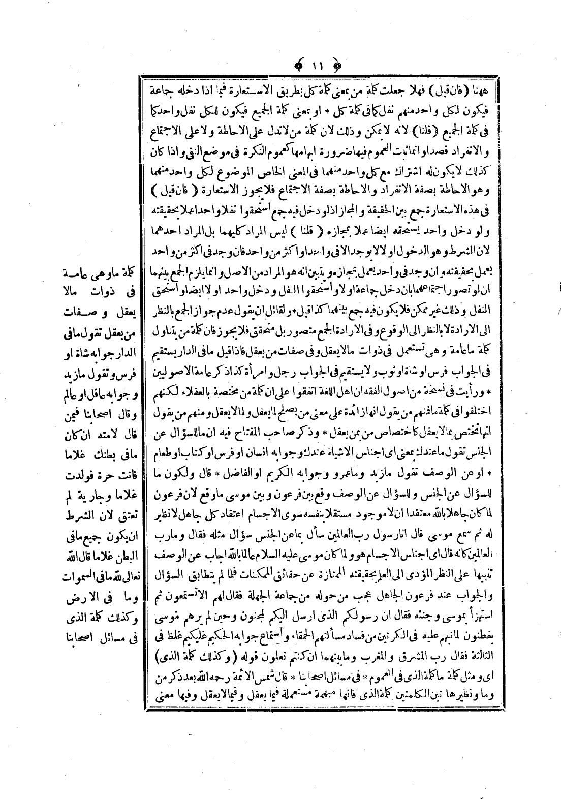 قَالَ وَلِكَوْنِ مَا لِلسُّؤَالِ عَنْ الْجِنْسِ وَلِلسُّؤَالِ عَنْ الْوَصْفِ وَقَعَ بَيْنَ فِرْعَوْنَ وَبَيْنَ مُوسَى مَا وَقَعَ؛ لِأَنَّ فِرْعَوْنَ لَمَّا كَانَ جَاهِلًا بِاَللَّهِ مُعْتَقِدًا أَنْ لَا مَوْجُودَ مُسْتَقِلًّا بِنَفْسِهِ سِوَى الْأَجْسَامِ اعْتِقَادُ كُلِّ جَاهِلٍ لَا نَظِيرَ لَهُ ثُمَّ سَمِعَ مُوسَى قَالَ {إِنَّا رَسُولُ رَبِّ الْعَالَمِينَ} [الشعراء: 16] سَأَلَ بِمَا عَنْ الْجِنْسِ سُؤَالَ مِثْلِهِ فَقَالَ {وَمَا رَبُّ الْعَالَمِينَ} [الشعراء: 23] كَأَنَّهُ قَالَ أَيُّ أَجْنَاسِ الْأَجْسَامِ وَهُوَ وَلَمَّا كَانَ مُوسَى - عَلَيْهِ السَّلَامُ - عَالِمًا بِاَللَّهِ أَجَابَ عَنْ الْوَصْفِ تَنْبِيهًا عَلَى النَّظَرِ الْمُؤَدِّي إلَى الْعِلْمِ بِحَقِيقَتِهِ الْمُمْتَازَةِ عَنْ حَقَائِقِ الْمُمْكِنَاتِ فَلَمَّا لَمْ يَتَطَابَقْ السُّؤَالُ وَالْجَوَابُ عِنْدَ فِرْعَوْنَ الْجَاهِلِ عَجِبَ مَنْ حَوْلَهُ مِنْ جَمَاعَةِ الْجَهَلَةِ فَقَالَ لَهُمْ {أَلا تَسْتَمِعُونَ} [الشعراء: 25] ثُمَّ اسْتَهْزَأَ بِمُوسَى وَجُنْدِهِ فَقَالَ {إِنَّ رَسُولَكُمُ الَّذِي أُرْسِلَ إِلَيْكُمْ لَمَجْنُونٌ} [الشعراء: 27] وَحِينَ لَمْ يَرَهُمْ مُوسَى يَفْطِنُونَ لِمَا نَبَّهَهُمْ عَلَيْهِ فِي الْكَرَّتَيْنِ مِنْ فَسَادِ مَسْأَلَتِهِمْ الْحَمْقَاءِ وَاسْتِمَاعِ جَوَابِهِ الْحَكِيمِ عَلَيْهِمْ غَلَّظَ فِي الثَّالِثَةِ فَقَالَ {رَبُّ الْمَشْرِقِ وَالْمَغْرِبِ وَمَا بَيْنَهُمَا إِنْ كُنْتُمْ تَعْقِلُونَ} [الشعراء: 28] .