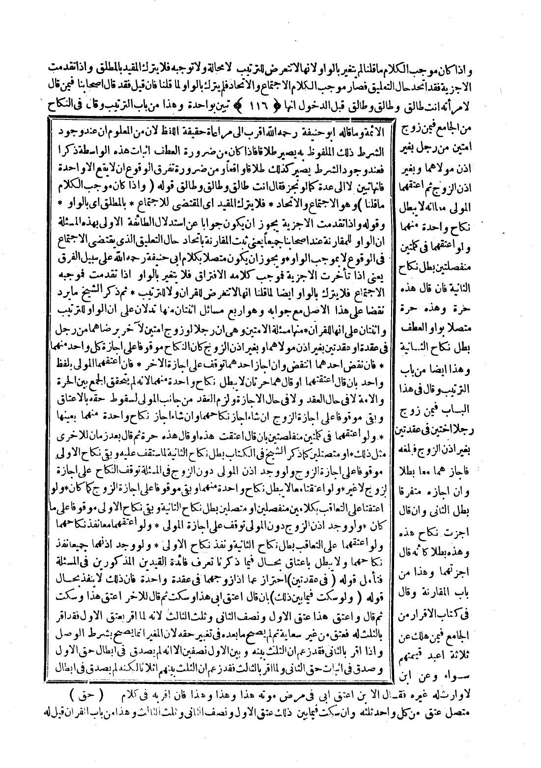 ثُمَّ ذَكَرَ الشَّيْخُ مَا يَرِدُ نَقْضًا عَلَى هَذَا الْأَصْلِ مَعَ جَوَابِهِ وَهُوَ أَرْبَعُ مَسَائِلَ اثْنَتَانِ مِنْهَا تَدُلَّانِ عَلَى أَنَّ الْوَاوَ لِلتَّرْتِيبِ وَاثْنَتَانِ عَلَى أَنَّهَا لِلْقِرَانِ مِنْهَا مَسْأَلَةُ الْأَمَتَيْنِ وَهِيَ أَنَّ رَجُلًا لَوْ زَوَّجَ أَمَتَيْنِ لِآخَرَ بِرِضَاهُمَا مِنْ رَجُلٍ فِي عُقْدَةٍ أَوْ عُقْدَتَيْنِ بِغَيْرِ إذْنِ مَوْلَاهُمَا وَبِغَيْرِ إذْنِ الزَّوْجِ كَانَ النِّكَاحُ مَوْقُوفًا عَلَى إجَازَةِ كُلِّ وَاحِدٍ مِنْهُمَا فَإِنْ نَقَضَ أَحَدُهُمَا انْتَقَضَ وَإِنْ أَجَازَ أَحَدُهُمَا تَوَقَّفَ عَلَى إجَازَةِ الْآخَرِ فَإِنْ أَعْتَقَهُمَا الْمَوْلَى بِلَفْظٍ وَاحِدٍ بِأَنْ قَالَ أَعْتَقْتهمَا أَوْ قَالَ هُمَا حُرَّتَانِ لَا يَبْطُلُ نِكَاحُ وَاحِدَةٍ مِنْهُمَا لِأَنَّهُ لَمْ يَتَحَقَّقْ الْجَمْعُ بَيْنَ الْحُرَّةِ وَالْأَمَةِ لَا فِي حَالِ الْعَقْدِ وَلَا فِي حَالِ الْإِجَازَةِ وَلَزِمَ الْعَقْدُ مِنْ جَانِبِ الْمَوْلَى لِسُقُوطِ حَقِّهِ بِالْإِعْتَاقِ وَبَقِيَ مَوْقُوفًا عَلَى إجَازَةِ الزَّوْجِ إنْ شَاءَ أَجَازَ نِكَاحَهُمَا وَإِنْ شَاءَ أَجَازَ نِكَاحَ وَاحِدَةٍ مِنْهُمَا بِعَيْنِهَا وَلَوْ أَعْتَقَهُمَا فِي كَلِمَتَيْنِ مُنْفَصِلَتَيْنِ بِأَنْ قَالَ أَعْتَقْت هَذِهِ أَوْ قَالَ هَذِهِ حُرَّةٌ ثُمَّ قَالَ بَعْدَ زَمَانٍ لِلْأُخْرَى مِثْلَ ذَلِكَ أَوْ مُتَّصِلَتَيْنِ كَمَا ذَكَرَ الشَّيْخُ فِي الْكِتَابِ بَطَلَ نِكَاحُ الثَّانِيَةِ لِمَا سَتَقِفُ عَلَيْهِ وَبَقِيَ نِكَاحُ الْأُولَى مَوْقُوفًا عَلَى إجَازَةِ الزَّوْجِ وَلَوْ وُجِدَ إذْنُ الْمَوْلَى دُونَ الزَّوْجِ فِي الْمَسْأَلَةِ تَوَقَّفَ النِّكَاحُ عَلَى إجَازَةِ الزَّوْجِ لَا غَيْرُ وَلَوْ أُعْتِقَتَا مَعًا لَا يَبْطُلُ نِكَاحُ وَاحِدَةٍ مِنْهُمَا وَبَقِيَ مَوْقُوفًا عَلَى إجَازَةِ الزَّوْجِ كَمَا كَانَ وَلَوْ أُعْتِقَتَا عَلَى التَّعَاقُبِ بِكَلَامَيْنِ مُنْفَصِلَيْنِ أَوْ مُتَّصِلَيْنِ بَطَلَ نِكَاحُ الثَّانِيَةِ وَبَقِيَ نِكَاحُ الْأُولَى مَوْقُوفًا عَلَى مَا كَانَ وَلَوْ وُجِدَ إذْنُ الزَّوْجِ دُونَ الْمَوْلَى تَوَقَّفَ عَلَى إجَازَةِ الْمَوْلَى وَلَوْ أَعْتَقَهُمَا مَعًا نَفَذَ نِكَاحُهُمَا وَلَوْ أَعْتَقَهُمَا عَلَى التَّعَاقُبِ بَطَلَ نِكَاحُ الثَّانِيَةِ وَنَفَذَ نِكَاحُ الْأُولَى.
