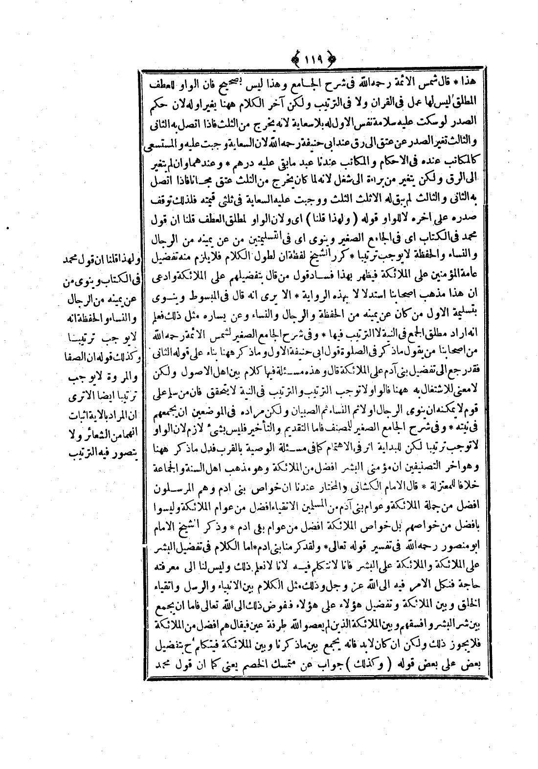 وَفِي شَرْحِ الْجَامِعِ الصَّغِيرِ لِلْمُصَنِّفِ فَأَمَّا التَّقْدِيمُ وَالتَّأْخِيرُ فَلَيْسَ بِشَيْءٍ لَازِمٍ لِأَنَّ الْوَاوَ لَا تُوجِبُ تَرْتِيبًا لَكِنْ لِلْبِدَايَةِ أَثَرٌ فِي الِاهْتِمَامِ كَمَا فِي مَسْأَلَةِ الْوَصِيَّةِ بِالْقُرَبِ فَدَلَّ مَا ذُكِرَ هَهُنَا وَهُوَ آخِرُ التَّصْنِيفَيْنِ أَنَّ مُؤْمِنِي الْبَشَرِ أَفْضَلُ مِنْ الْمَلَائِكَةِ وَهُوَ مَذْهَبُ أَهْلِ السُّنَّةِ وَالْجَمَاعَةِ خِلَافًا لِلْمُعْتَزِلَةِ قَالَ الْإِمَامُ الْكَشَانِيُّ وَالْمُخْتَارُ عِنْدَنَا أَنَّ خَوَاصَّ بَنِي آدَمَ وَهُمْ الْمُرْسَلُونَ أَفْضَلُ مِنْ جُمْلَةِ الْمَلَائِكَةِ، وَعَوَامُّ بَنِي آدَمَ مِنْ الْمُسْلِمِينَ الْأَتْقِيَاءِ أَفْضَلُ مِنْ عَوَامِّ الْمَلَائِكَةِ وَلَيْسُوا بِأَفْضَلَ مِنْ خَوَاصِّهِمْ بَلْ خَوَاصُّ الْمَلَائِكَةِ أَفْضَلُ مِنْ عَوَامِّ بَنِي آدَمَ.