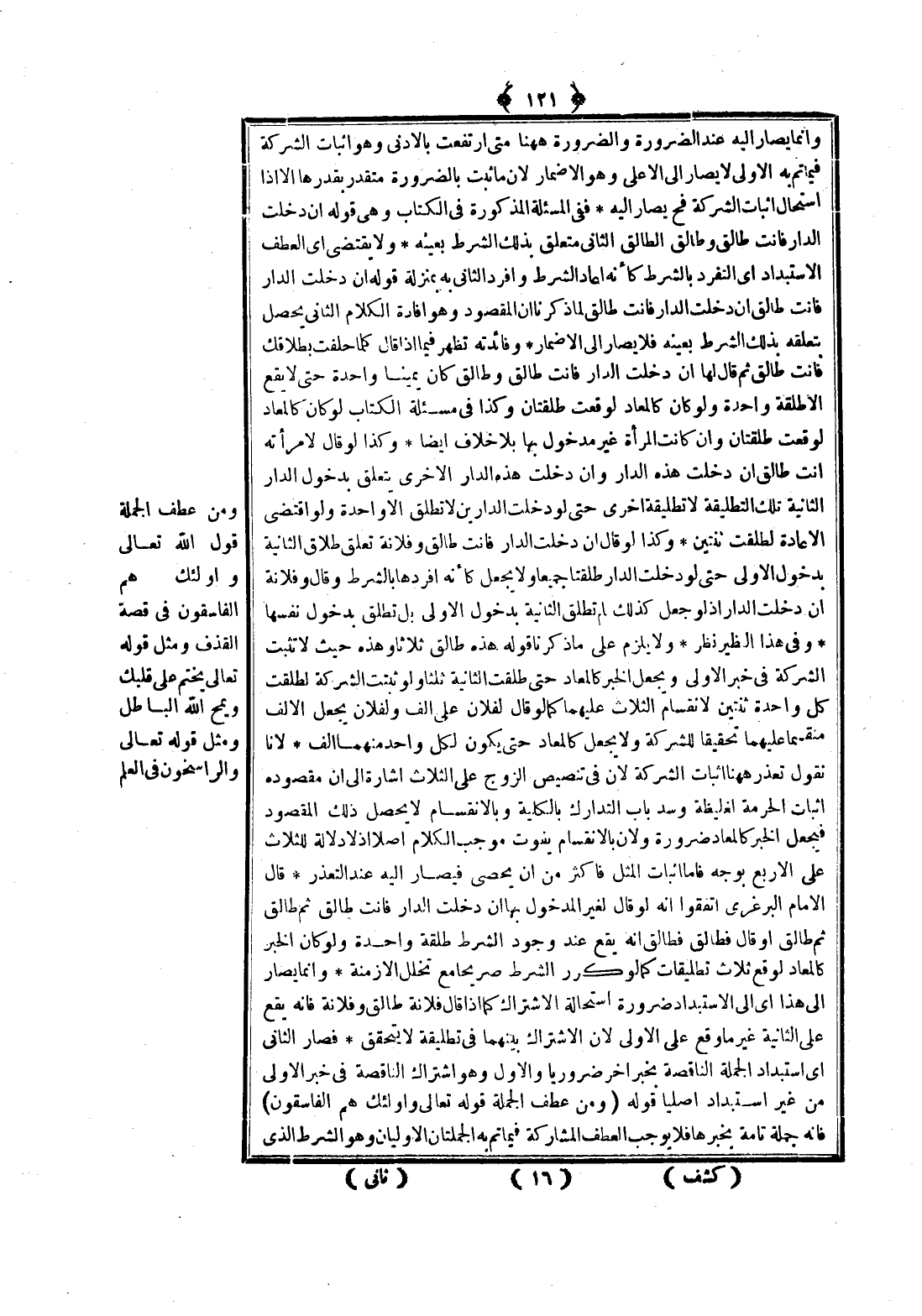 ـــــــــــــــــــــــــــــQوَإِنَّمَا يُصَارُ إلَيْهِ عِنْدَ الضَّرُورَةِ وَالضَّرُورَةُ هَهُنَا مَتَى ارْتَفَعَتْ بِالْأَدْنَى وَهُوَ إثْبَاتُ الشَّرِكَةِ فِيمَا تَمَّ بِهِ الْأُولَى لَا يُصَارُ إلَى الْأَعْلَى وَهُوَ الْإِضْمَارُ لِأَنَّ مَا ثَبَتَ بِالضَّرُورَةِ مُتَقَدِّرٌ بِقَدْرِهَا إلَّا إذَا اسْتَحَالَ إثْبَاتُ الشَّرِكَةِ " فح " يُصَارُ إلَيْهِ فَفِي الْمَسْأَلَةِ الْمَذْكُورَةِ فِي الْكِتَابِ وَهِيَ قَوْلُهُ إنْ دَخَلْت الدَّارَ فَأَنْتِ طَالِقٌ وَطَالِقٌ الطَّالِقُ الثَّانِي مُتَعَلِّقٌ بِذَلِكَ الشَّرْطِ بِعَيْنِهِ وَلَا يَقْتَضِي أَيْ الْعَطْفُ الِاسْتِبْدَادَ أَيْ التَّفَرُّدَ بِالشَّرْطِ كَأَنَّهُ أَعَادَ الشَّرْطَ وَأَفْرَدَ الثَّانِيَ بِهِ بِمَنْزِلَةِ قَوْلِهِ إنْ دَخَلْت الدَّارَ فَأَنْتِ طَالِقٌ إنْ دَخَلْت الدَّارَ فَأَنْتِ طَالِقٌ لِمَا ذَكَرْنَا أَنَّ الْمَقْصُودَ وَهُوَ إفَادَةُ الْكَلَامِ الثَّانِي يَحْصُلُ بِتَعَلُّقِهِ بِذَلِكَ الشَّرْطِ بِعَيْنِهِ فَلَا يُصَارُ إلَى الْإِضْمَارِ وَفَائِدَتُهُ تَظْهَرُ فِيمَا إذَا قَالَ كُلَّمَا حَلَفْت بِطَلَاقِك فَأَنْتِ طَالِقٌ ثُمَّ قَالَ لَهَا إنْ دَخَلْت الدَّارَ فَأَنْتِ طَالِقٌ وَطَالِقٌ كَانَ يَمِينًا وَاحِدَةً حَتَّى لَا يَقَعَ إلَّا طَلْقَةٌ وَاحِدَةٌ وَلَوْ كَانَ كَالْمُعَادِ لَوَقَعَتْ طَلْقَتَانِ.
