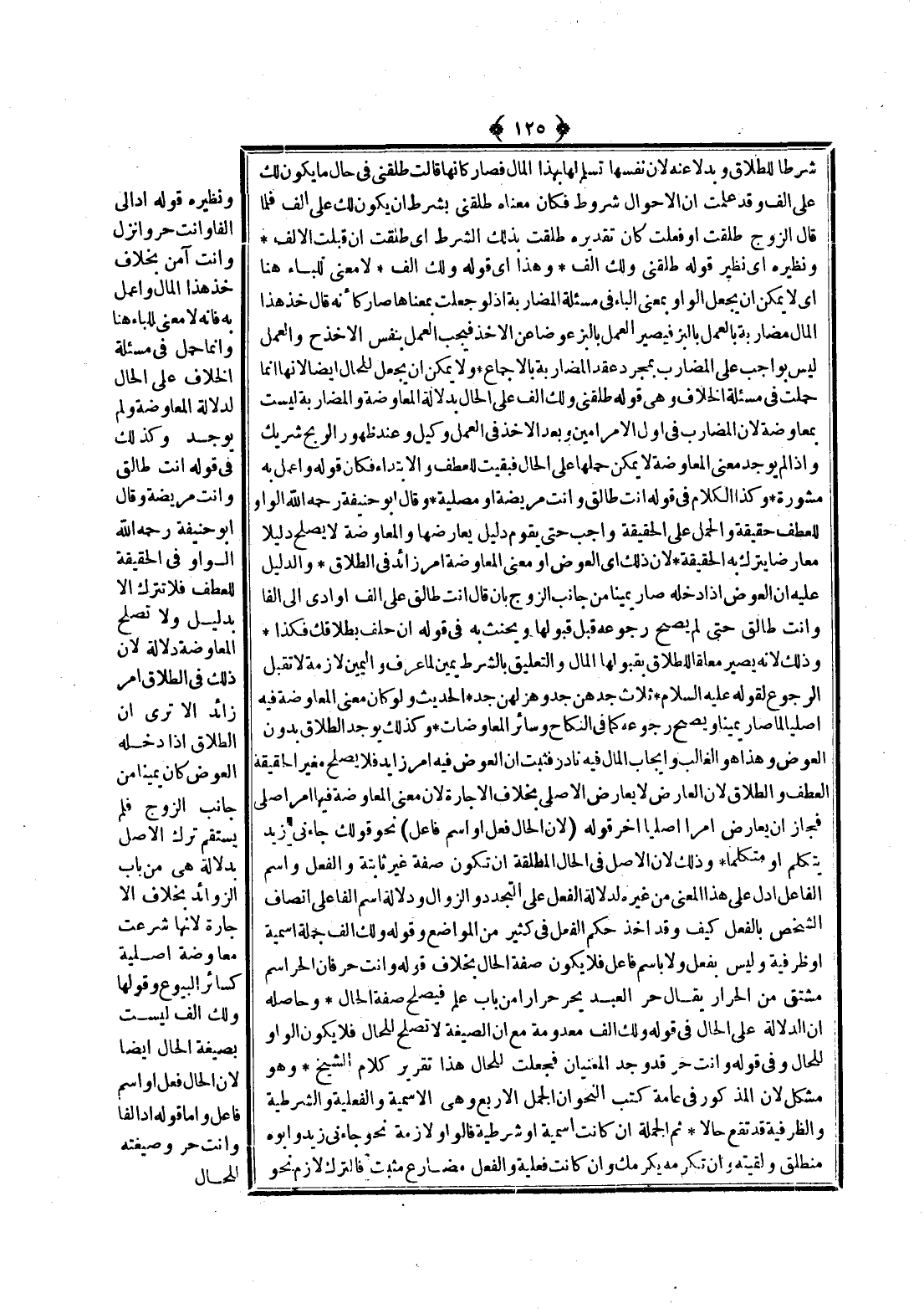 وَكَذَلِكَ يُوجَدُ الطَّلَاقُ بِدُونِ الْعِوَضِ وَهَذَا هُوَ الْغَالِبُ وَإِيجَابُ الْمَالِ فِيهِ نَادِرٌ فَثَبَتَ أَنَّ الْعِوَضَ فِيهِ أَمْرٌ زَايِدٌ فَلَا يَصْلُحُ مُغَيِّرًا لِحَقِيقَةِ الْعَطْفِ وَالطَّلَاقِ لِأَنَّ الْعَارِضَ لَا يُعَارِضُ الْأَصْلِيَّ بِخِلَافِ الْإِجَارَةِ لِأَنَّ مَعْنَى الْمُعَاوَضَةِ فِيهَا أَمْرٌ أَصْلِيٌّ فَجَازَ أَنْ يُعَارِضَ أَمْرًا أَصْلِيًّا آخَرَ قَوْلُهُ (لِأَنَّ الْحَالَ فِعْلٌ أَوْ اسْمُ فَاعِلٍ) نَحْوُ قَوْلِك جَاءَنِي زَيْدٌ يَتَكَلَّمُ أَوْ مُتَكَلِّمًا وَذَلِكَ لِأَنَّ الْأَصْلَ فِي الْحَالِ الْمُطْلَقَةِ أَنْ تَكُونَ صِفَةً غَيْرَ ثَابِتَةٍ وَالْفِعْلُ وَاسْمُ الْفَاعِلِ أَدَلُّ عَلَى هَذَا الْمَعْنَى مِنْ غَيْرِهِ لِدَلَالَةِ الْفِعْلِ عَلَى التَّجَدُّدِ وَالزَّوَالِ وَدَلَالَةِ اسْمِ الْفَاعِلِ عَلَى اتِّصَافِ الشَّخْصِ بِالْفِعْلِ كَيْفَ وَقَدْ أُخِذَ حُكْمُ الْفِعْلِ فِي كَثِيرٍ مِنْ الْمَوَاضِعِ.