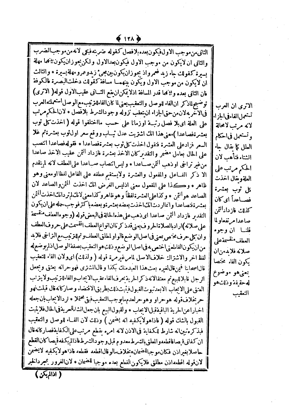 أَلَا تَرَى أَنَّ الْعَرَبَ تَسْتَعْمِلُ الْفَاءَ فِي الْجَزَاءِ لِأَنَّهُ مُرَتَّبٌ لَا مَحَالَةَ وَتَسْتَعْمِلُ فِي أَحْكَامِ الْعِلَلِ كَمَا يُقَالُ جَاءَ الشِّتَاءُ فَتَأَهَّبْ لِأَنَّ الْحُكْمَ مُرَتَّبٌ عَلَى الْعِلَّةِ وَيُقَالُ أَخَذْت كُلَّ ثَوْبٍ بِعَشَرَةٍ فَصَاعِدًا أَيْ كَانَ كَذَلِكَ فَازْدَادَ الثَّمَنُ صَاعِدًا مُرْتَفِعًا وَلَمَّا قُلْنَا إنَّ وُجُوهَ الْعَطْفِ مُنْقَسِمَةٌ عَلَى صِلَاتِهِ فَلَا بُدَّ مِنْ أَنْ يَكُونَ الْفَاءُ مُخْتَصًّا بِمَعْنًى هُوَ مَوْضُوعٌ لَهُ حَقِيقَةً وَذَلِكَ هُوَ التَّعْقِيبُ