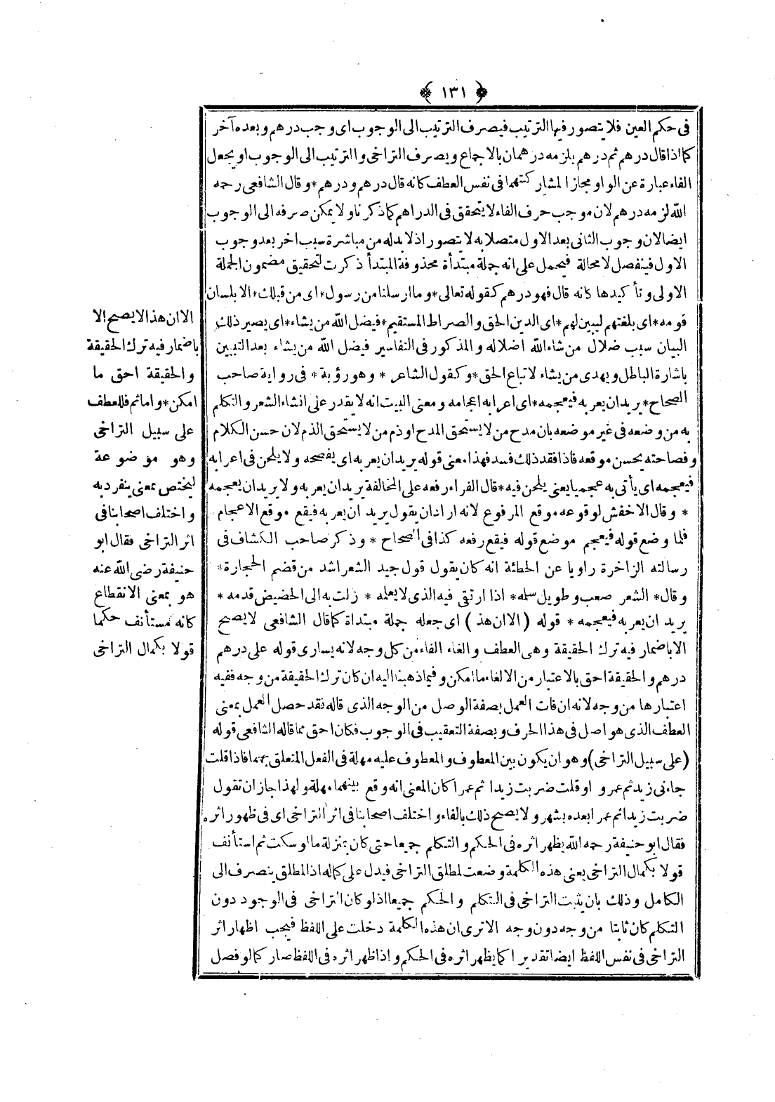 قَوْلُهُ (عَلَى سَبِيلِ التَّرَاخِي) وَهُوَ أَنْ يَكُونَ بَيْنَ الْمَعْطُوفِ وَالْمَعْطُوفِ عَلَيْهِ مُهْلَةٌ فِي الْفِعْلِ الْمُتَعَلِّقِ بِهِمَا فَإِذَا قُلْت جَاءَنِي زَيْدٌ ثُمَّ عَمْرٌو أَوْ قُلْت ضَرَبْت زَيْدًا ثُمَّ عَمْرًا كَانَ الْمَعْنَى أَنَّهُ وَقَعَ بَيْنَهُمَا مُهْلَةٌ وَلِهَذَا جَازَ أَنْ تَقُولَ ضَرَبْت زَيْدًا ثُمَّ عَمْرًا بَعْدَهُ بِشَهْرٍ وَلَا يَصِحُّ ذَلِكَ بِالْفَاءِ وَاخْتَلَفَ أَصْحَابُنَا فِي أَثَرِ التَّرَاخِي أَيْ فِي ظُهُورِ أَثَرِهِ فَقَالَ أَبُو حَنِيفَةَ - رَحِمَهُ اللَّهُ - يَظْهَرُ أَثَرُهُ فِي الْحُكْمِ وَالتَّكَلُّمِ جَمِيعًا حَتَّى كَانَ بِمَنْزِلَةِ مَا لَوْ سَكَتَ ثُمَّ اسْتَأْنَفَ قَوْلًا بِكَمَالِ التَّرَاخِي يَعْنِي هَذِهِ الْكَلِمَةُ وُضِعَتْ لِمُطْلَقِ التَّرَاخِي فَيَدُلُّ عَلَى كَمَالِهِ إذْ الْمُطْلَقُ يَنْصَرِفُ إلَى الْكَامِلِ وَذَلِكَ بِأَنْ يَثْبُتَ التَّرَاخِي فِي التَّكَلُّمِ وَالْحُكْمِ جَمِيعًا إذْ لَوْ كَانَ التَّرَاخِي فِي الْوُجُودِ دُونَ التَّكَلُّمِ كَانَ ثَابِتًا مِنْ وَجْهٍ دُونَ وَجْهٍ أَلَا تَرَى أَنَّ هَذِهِ الْكَلِمَةَ دَخَلَتْ عَلَى اللَّفْظِ فَيَجِبُ إظْهَارُ أَثَرِ التَّرَاخِي فِي نَفْسِ اللَّفْظِ أَيْضًا تَقْدِيرًا كَمَا يَظْهَرُ أَثَرُهُ فِي الْحُكْمِ وَإِذَا ظَهَرَ أَثَرُهُ فِي اللَّفْظِ صَارَ كَمَا لَوْ فُصِلَ