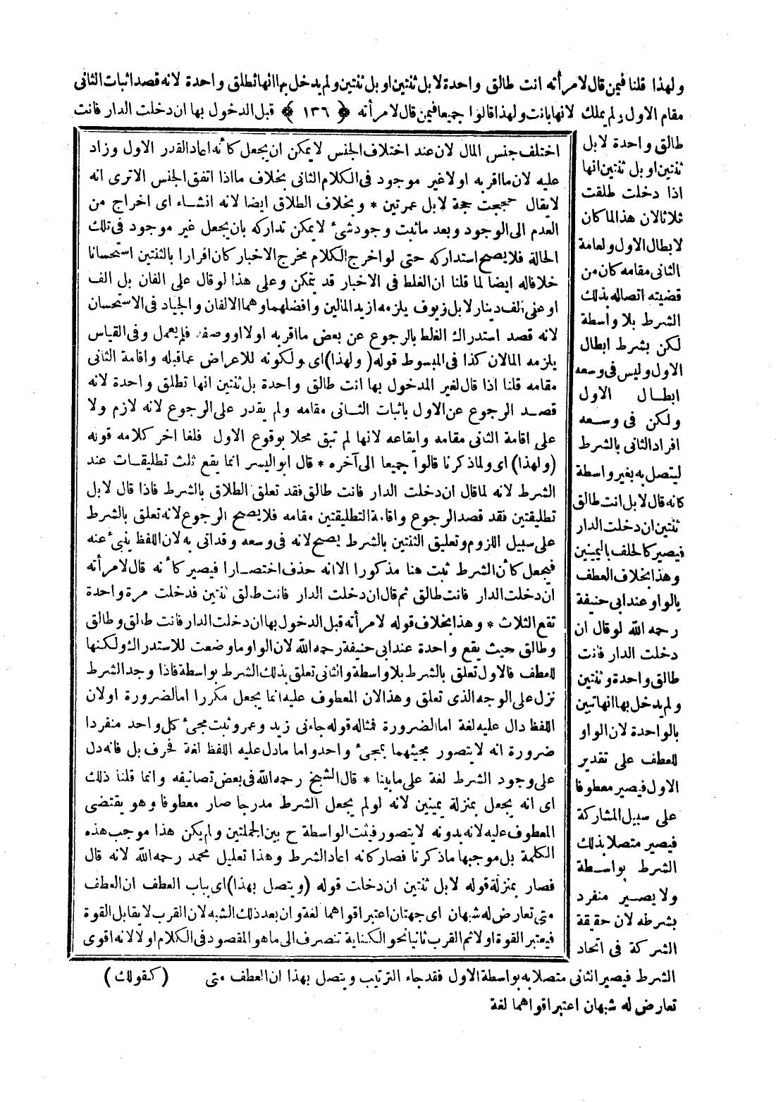 قَالَ الشَّيْخُ - رَحِمَهُ اللَّهُ - فِي بَعْضِ تَصَانِيفِهِ وَإِنَّمَا قُلْنَا ذَلِكَ أَيْ إنَّهُ يُجْعَلُ بِمَنْزِلَةِ يَمِينَيْنِ لِأَنَّهُ لَوْ لَمْ يُجْعَلْ الشَّرْطُ مُدْرَجًا صَارَ مَعْطُوفًا وَهُوَ يَقْتَضِي الْمَعْطُوفَ عَلَيْهِ لِأَنَّهُ بِدُونِهِ لَا يُتَصَوَّرُ فَيَثْبُتُ الْوَاسِطَةُ ح بَيْنَ الْجُمْلَتَيْنِ وَلَمْ يَكُنْ هَذَا مُوجَبَ هَذِهِ الْكَلِمَةِ بَلْ مُوجَبُهَا مَا ذَكَرْنَا فَصَارَ كَأَنَّهُ أَعَادَ الشَّرْطَ وَهَذَا تَعْلِيلُ مُحَمَّدٍ - رَحِمَهُ اللَّهُ - لِأَنَّهُ قَالَ فَصَارَ بِمَنْزِلَةِ قَوْلِهِ (لَا بَلْ ثِنْتَيْنِ) إنْ دَخَلْت قَوْلُهُ (وَيَتَّصِلُ بِهَذَا) أَيْ بِبَابِ الْعَطْفِ أَنَّ الْعَطْفَ مَتَى تَعَارَضَ لَهُ شَبَهَانِ أَيْ جِهَتَانِ اُعْتُبِرَ أَقْوَاهُمَا لُغَةً وَإِنْ بَعُدَ ذَلِكَ الشَّبَهُ لِأَنَّ الْقُرْبَ لَا يُقَابِلُ الْقُوَّةَ فَيُعْتَبَرُ الْقُوَّةُ أَوَّلًا ثُمَّ الْقُرْبُ ثَانِيًا نَحْوُ الْكِنَايَةِ تَنْصَرِفُ إلَى مَا هُوَ الْمَقْصُودُ فِي الْكَلَامِ أَوَّلًا لِأَنَّهُ أَقْوَى